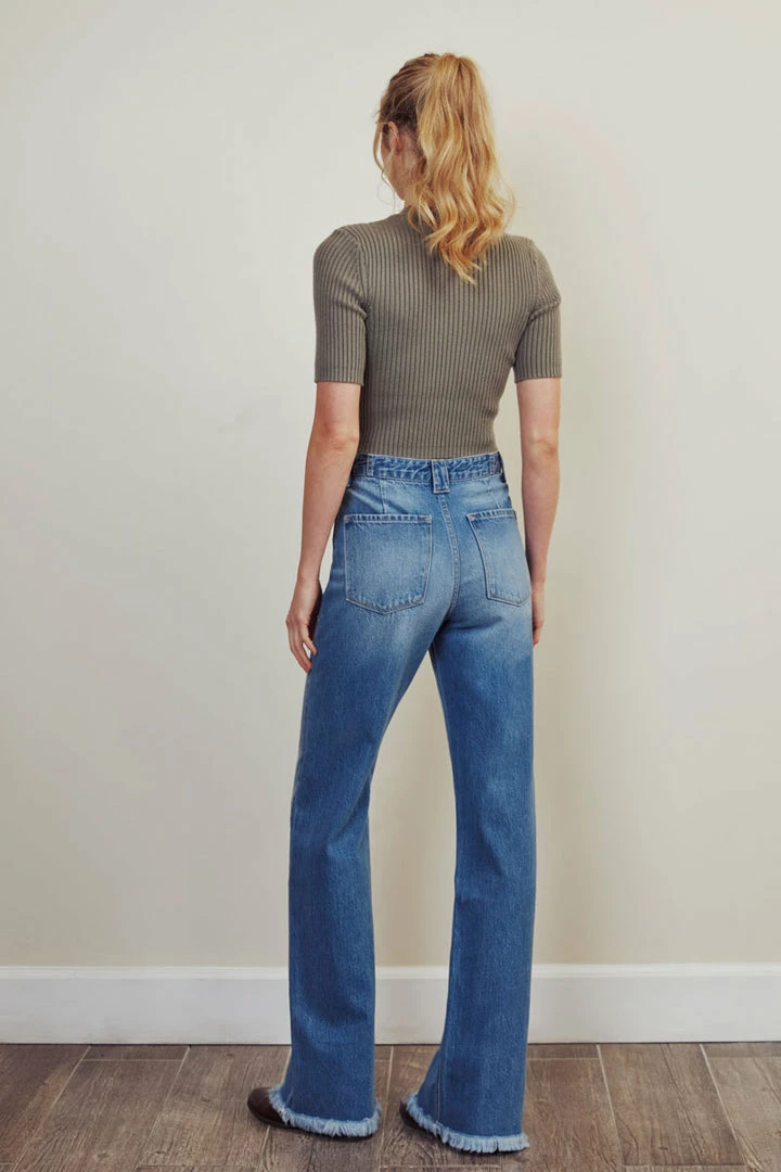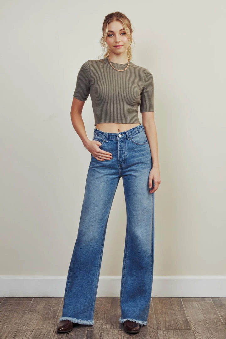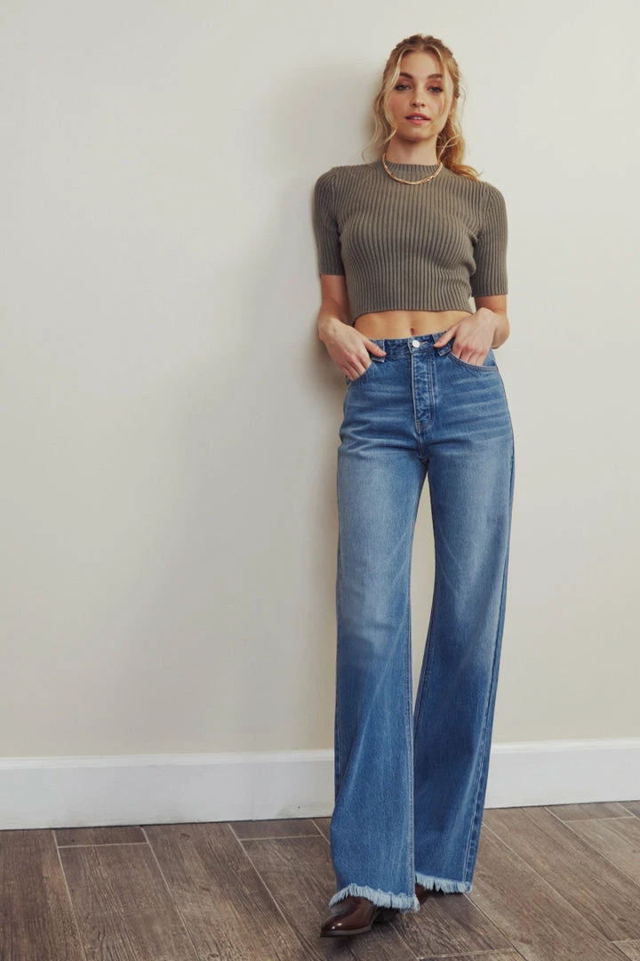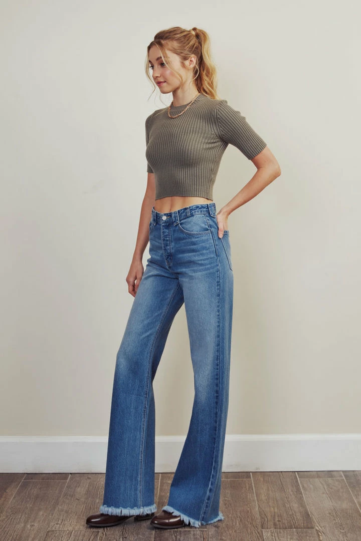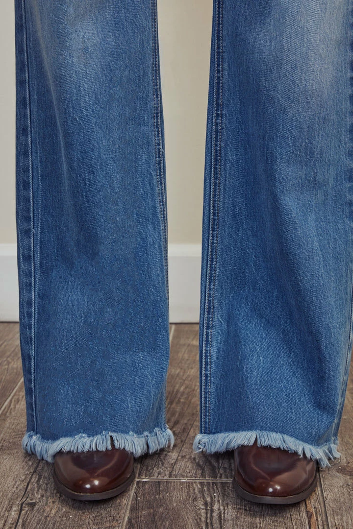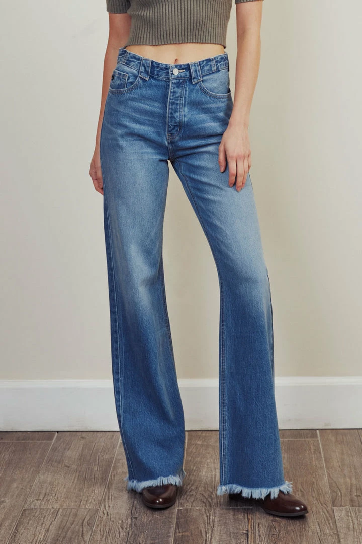 Our Charlotte Ultra High Rise Flare features a classic wide-leg flare design with light fading and whiskering. Comes is a beautiful medium-washed color it features a released hem that gives it just the right amount of edge and back darts for the perfect fit. Its rigid denim makeup creates a not-too-stiff style that won’t ever bag out after each wear.Â