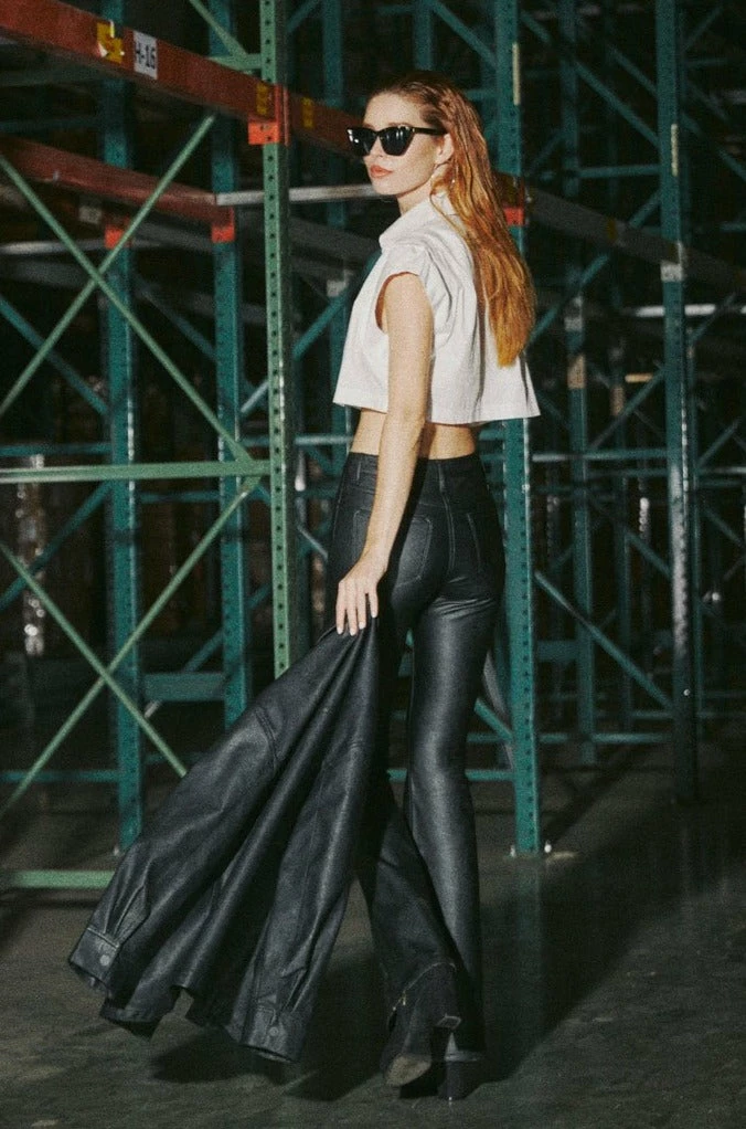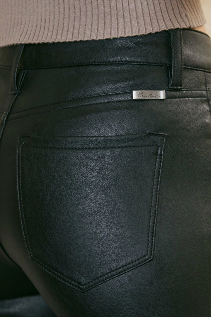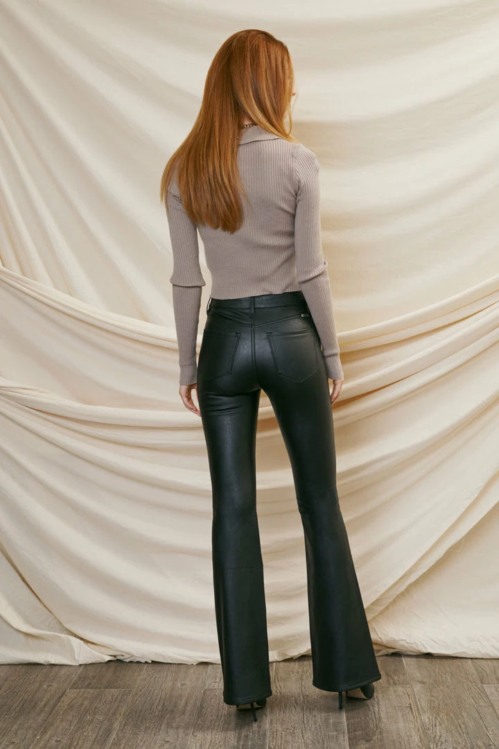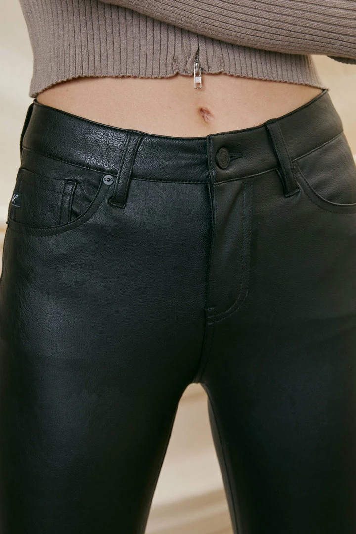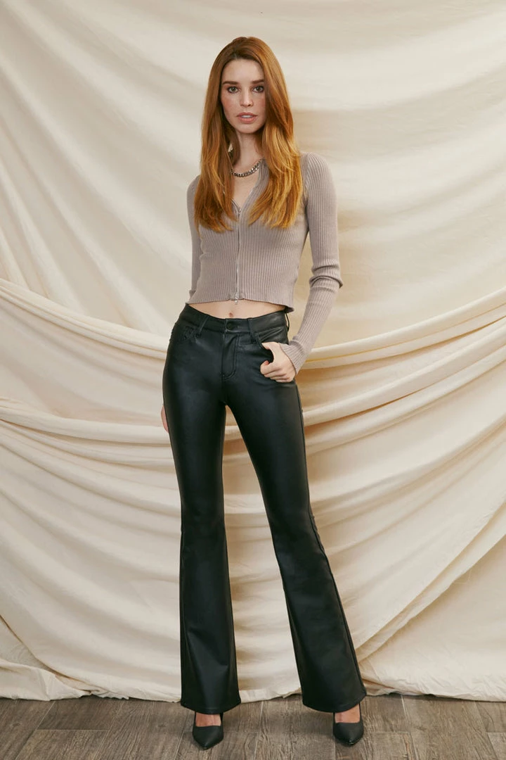 Our comfortable stretch faux leather pants create the classic jean flared fit. Our Evelynn Mid Rise Jeans sit right at the natural waistline as they taper down the thigh and beg to relax and the upper calf for a flared silhouette that’s trendy and chic. This show stopper piece will turn heads as you walk in confidence. Features a classic five-pocket design, single-button front, and zip-fly closure.Â