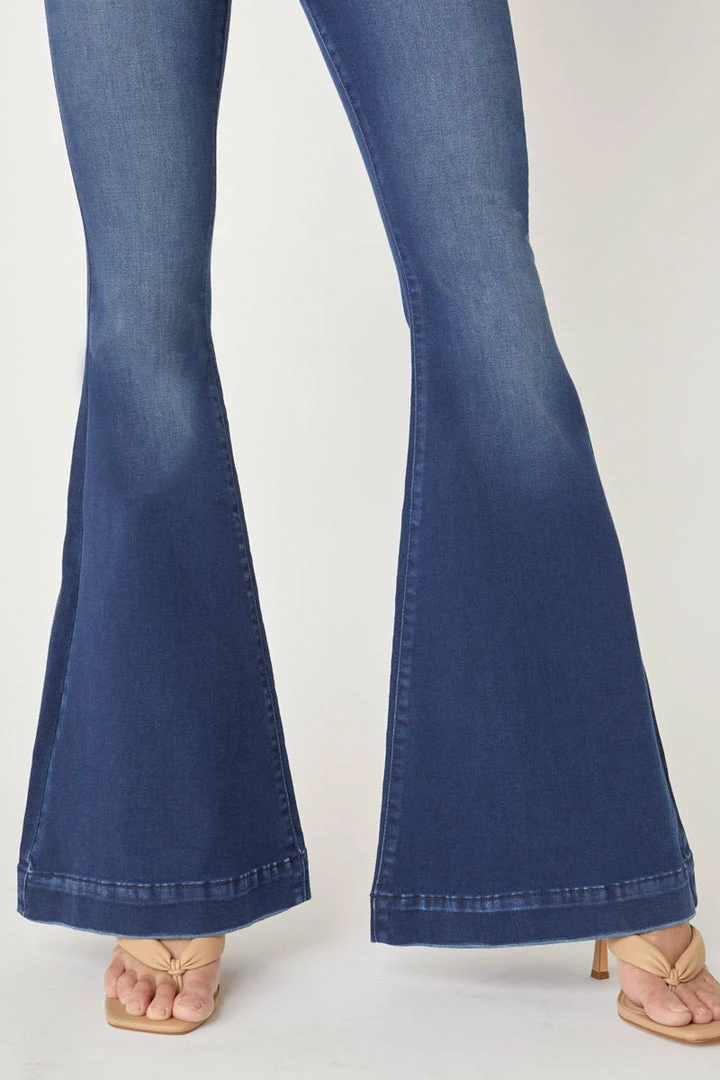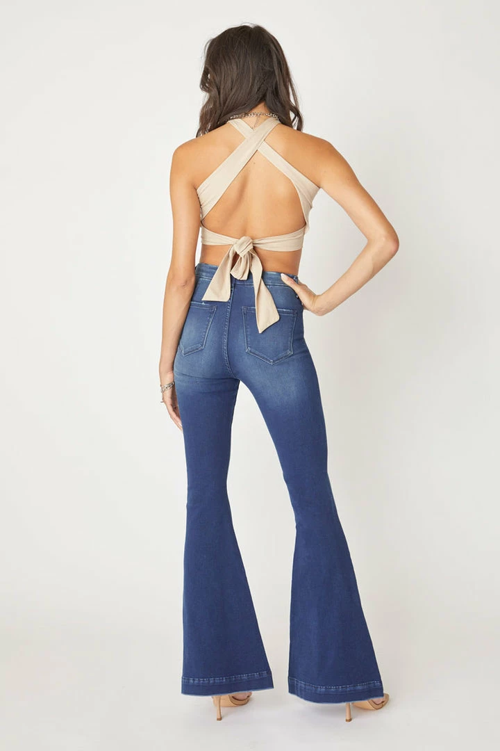 Our Harper High Rise Jeans come in a lightly faded wash with whiskering creating a classically subtle lived-in look. Sits above the natural waistline as it tapers down the thigh and begins to flare at the calf. Made with soft, stretch denim that retains its shape while allowing you to move with ease. Features a classic five-pocket design and five-button up front closure.