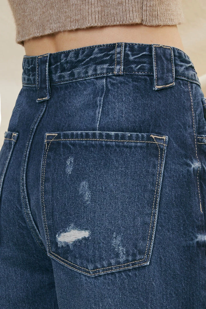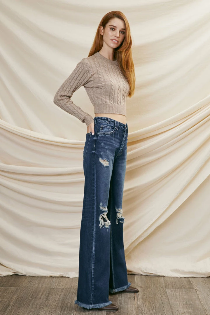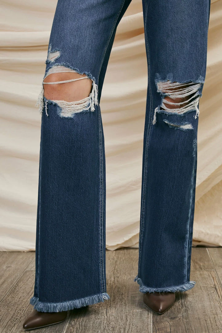 Our Jules Ultra High Rise Flare features a retro wide leg design with a light distress design on the knees. Its dark blue wash comes with minor fading and a released hem detail that gives it just the right amount of edge. Its rigid denim makeup creates a not-too-stiff style that won’t ever bag out after each wear.