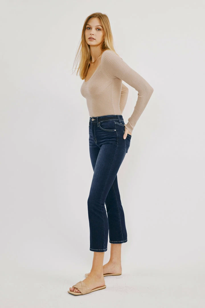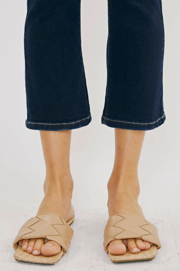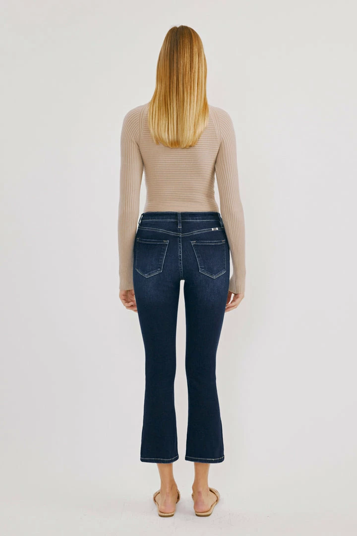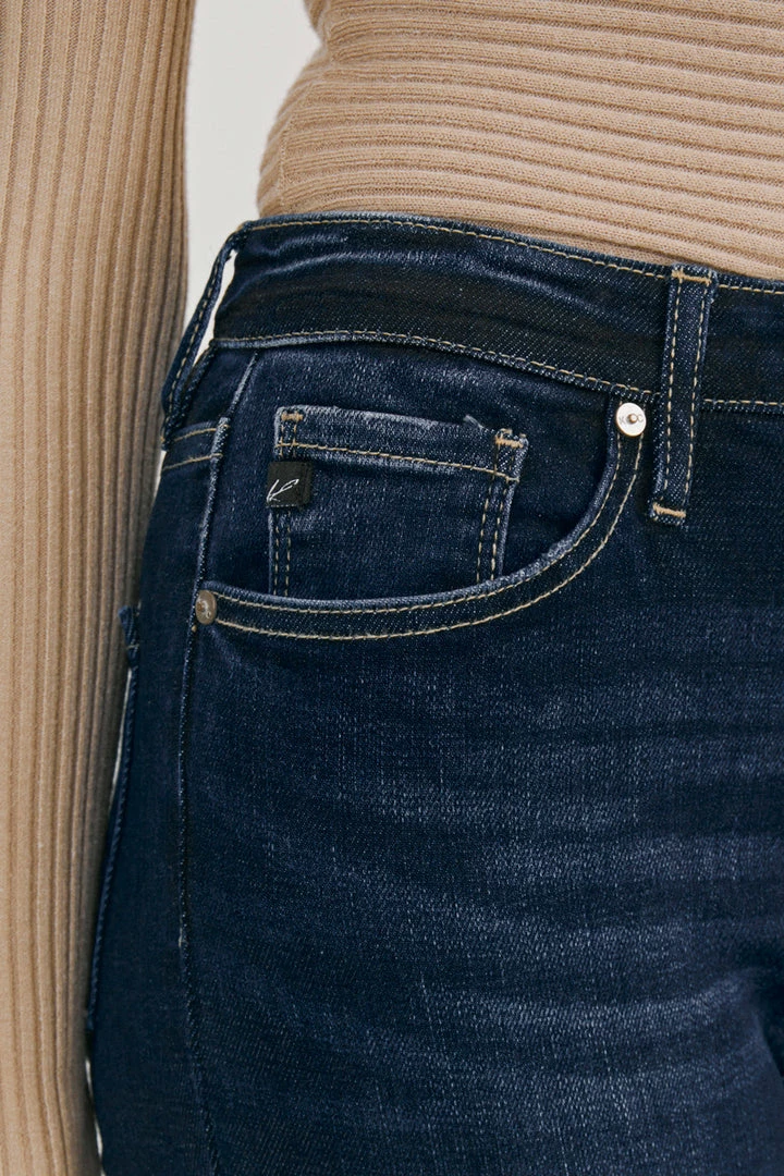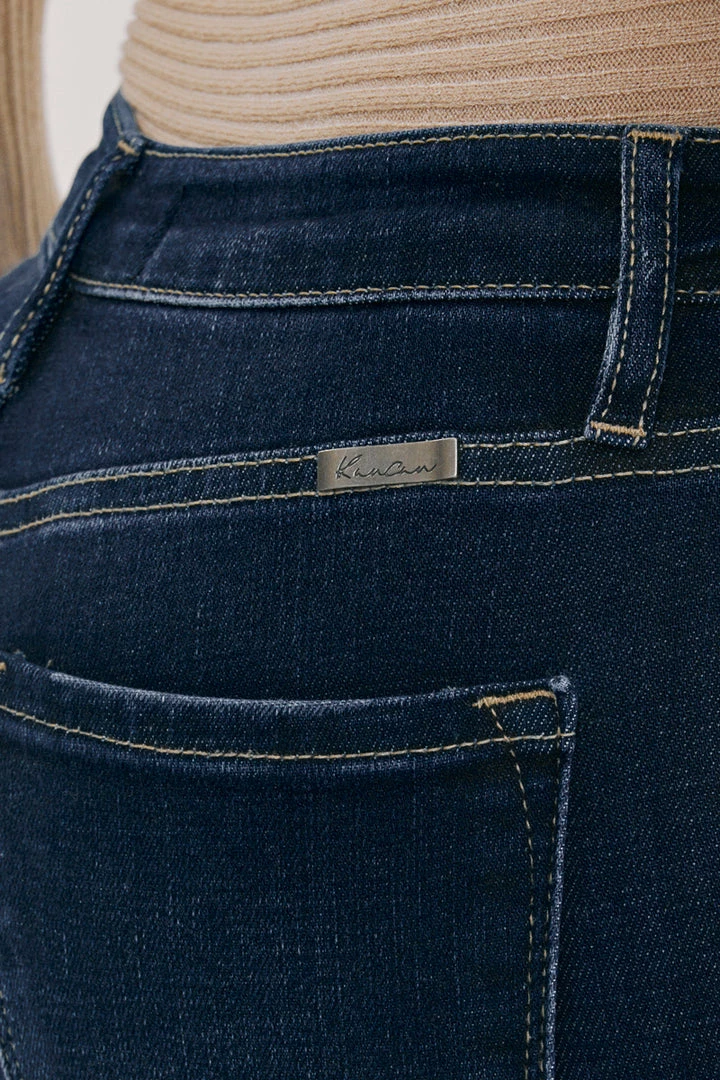 Our dark-washed Kyeri High Rise Jeans come in a cute kick-flare fit that’s flirty and a fun style that will make any outfit pop. Sits above the natural waistline as it tapers down the leg and gently flares out at the ankle. This design is a must-have piece that’s versatile and trendy. Features a classic five-pocket design, single-button front closure, finished with silver hardware.