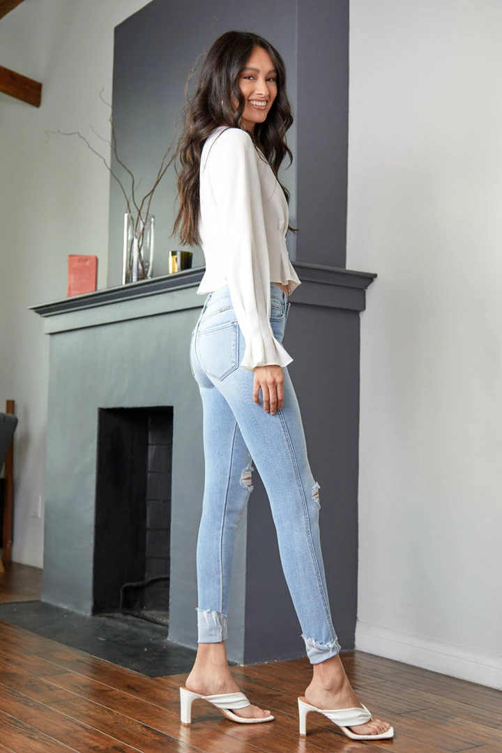 Baby blue jeans with knee destruction for a lived-in vibe. Our Fleur Mid Rise Ankle Skinny Jeans sit right at the natural waistline as they taper down the leg for a fitted silhouette that hugs lifts in all the right places. Made with stretch denim that retains its shape while allowing you to move with ease. Features a classic five-pocket design, single-button front, and zip-fly closure. Finished with silver-colored hardware.Â