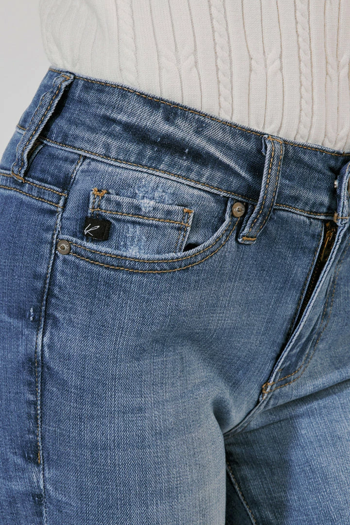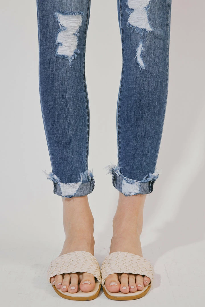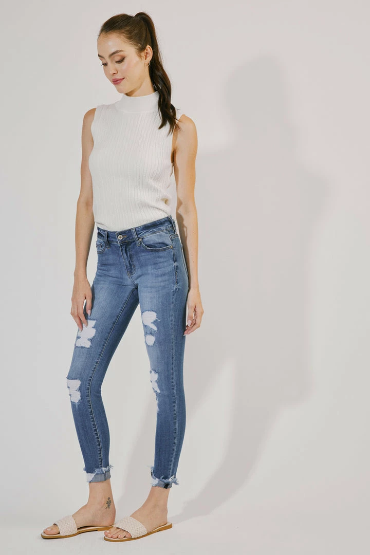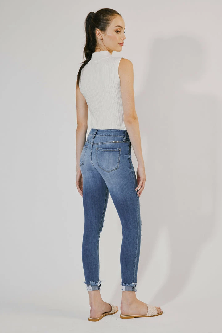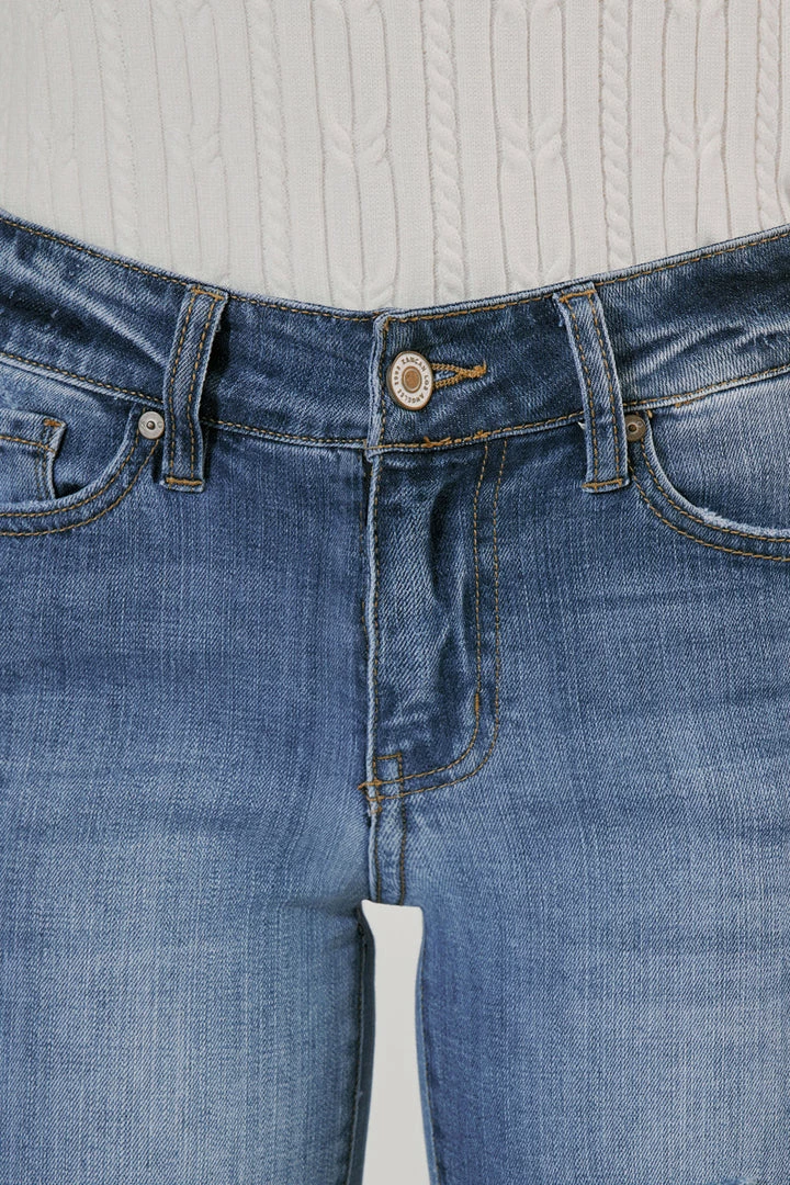 Our Florence Mid Rise Super Skinny Jeans come with major distress along with washed fading on the front and back for a super-lived-in look. Sits right at the natural waistline as it tapers down the leg creating a stylishly sleek fit that contours the body. Made with comfort-stretch denim that holds its shape while allowing you to move freely without feeling uncomfortable. Features a classic five-pocket design, single-button front, and zip-fly closure.