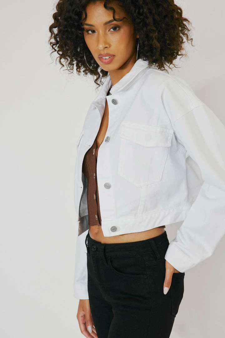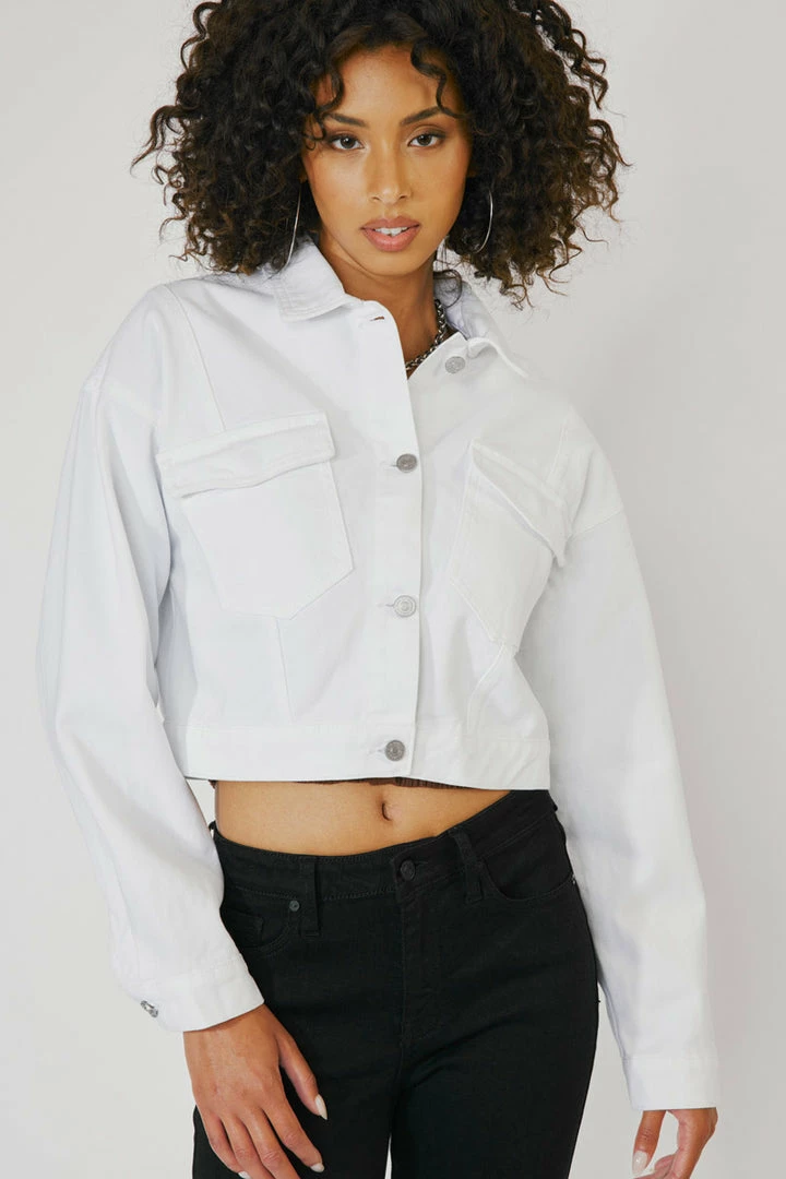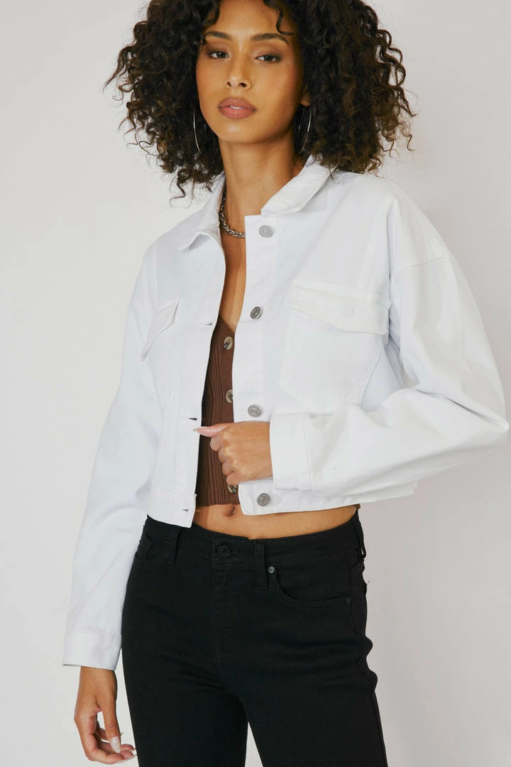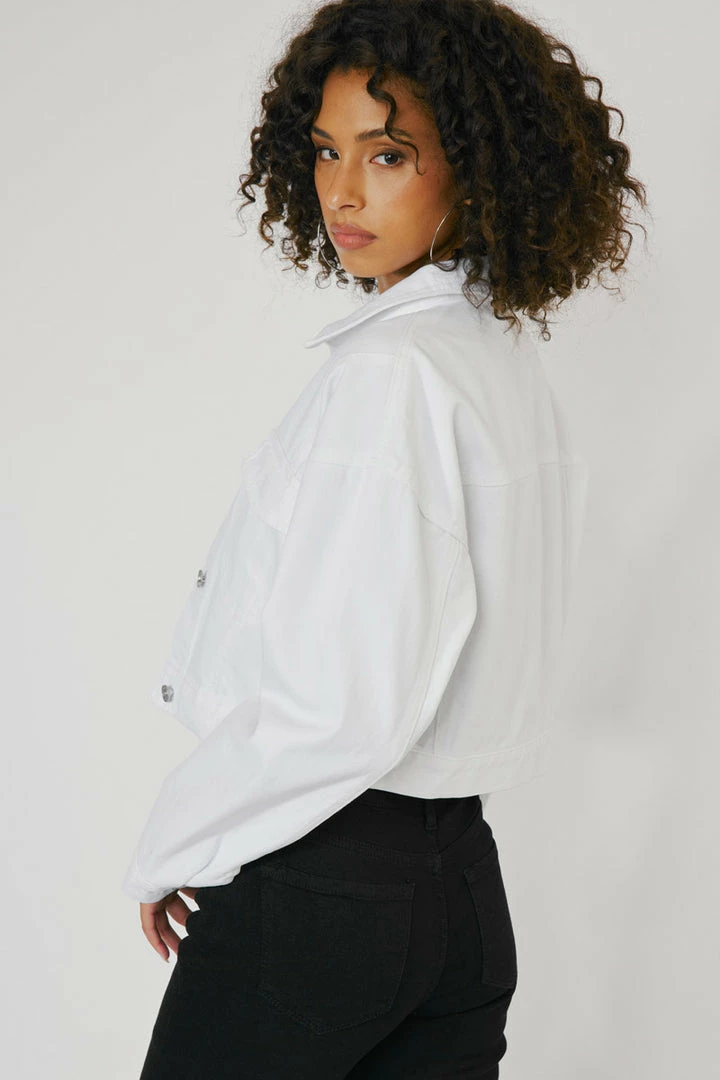 Upgrade your wardrobe with our Francis Cropped Jacket. This classic white jacket has a drop shoulder design to add an extra edge to your outfit. Features pleats on the back, slanted front pockets, and button-up closure.Â