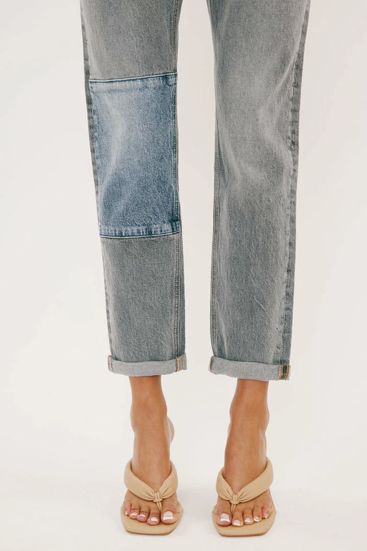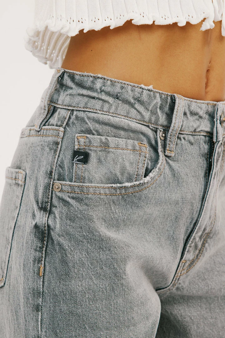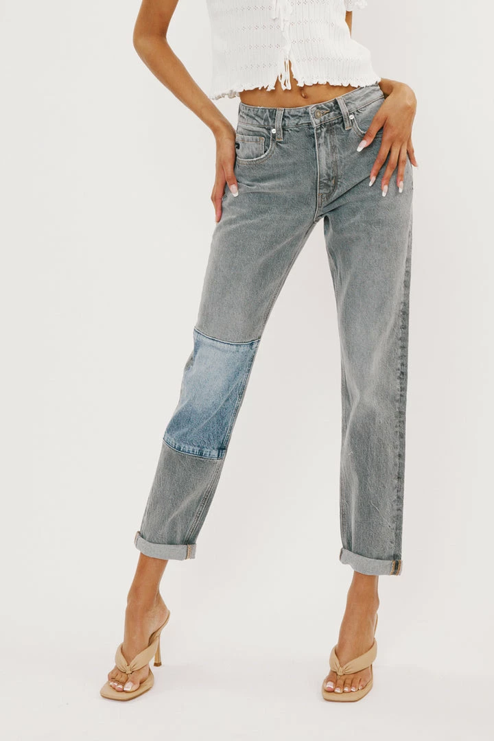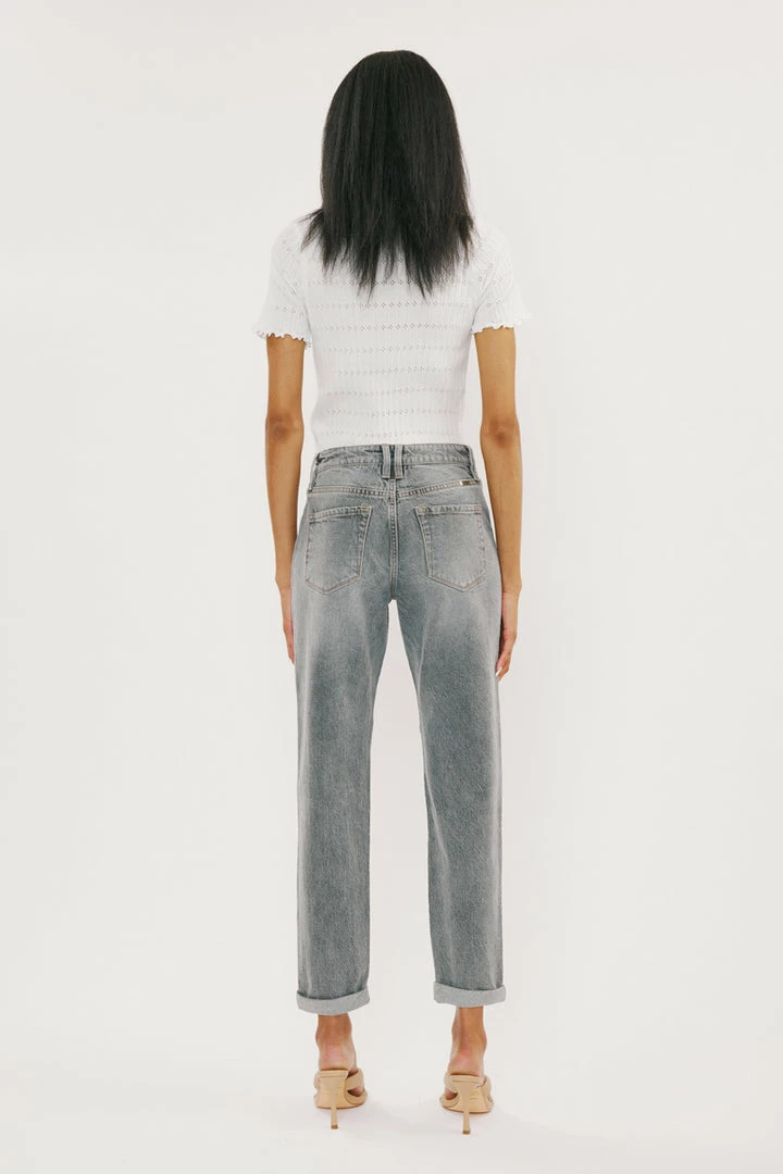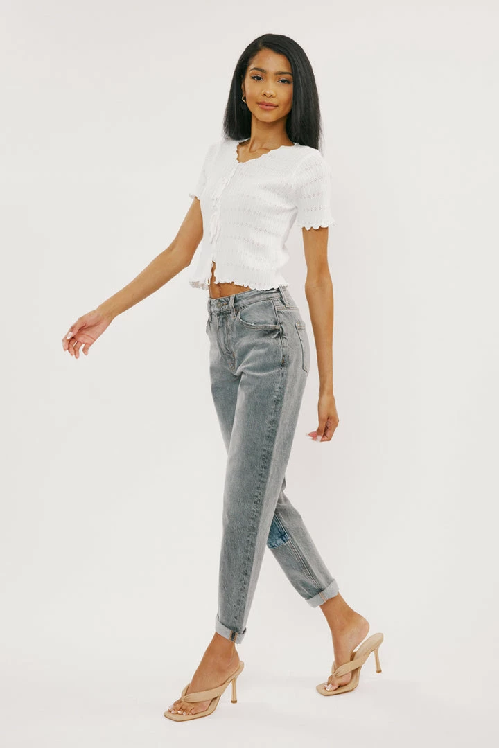 Our Frankie mom jeans come in a faded light grey wash featuring a faded blue denim patch. These jeans sit above the natural waistline as it relaxes through the thigh and leg. Comes in our comfort stretch blend that still has the classic authentic denim look. Features a cuffed hem, classic 5-pocket design, single-button front, and zip-fly closure.