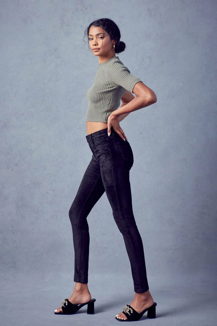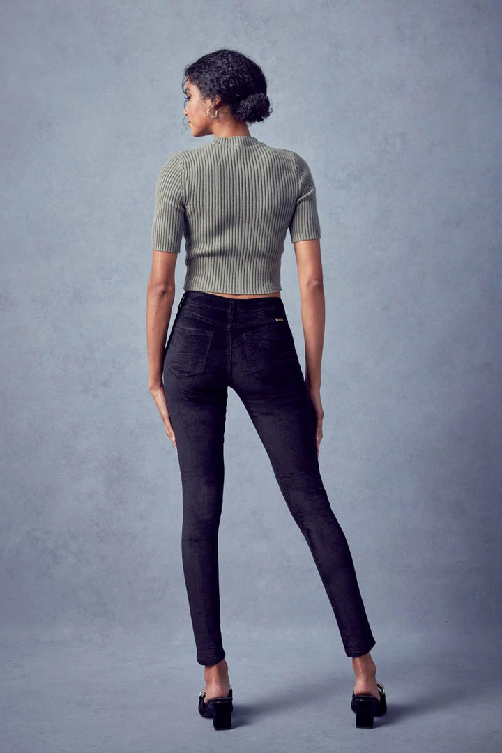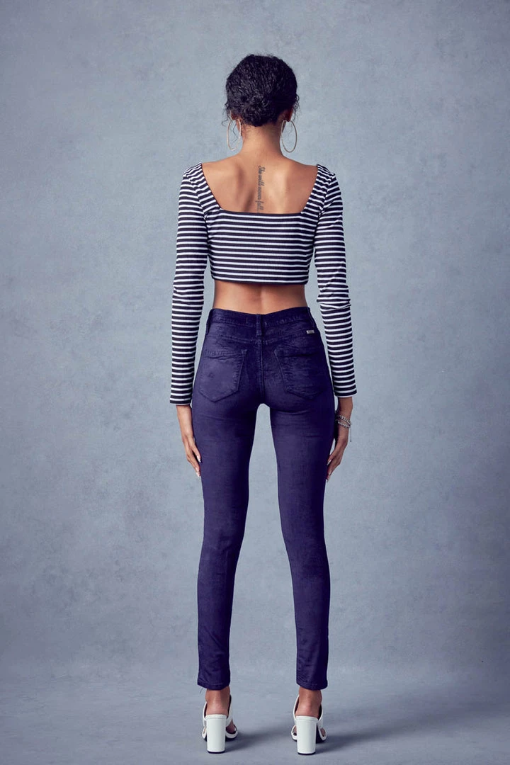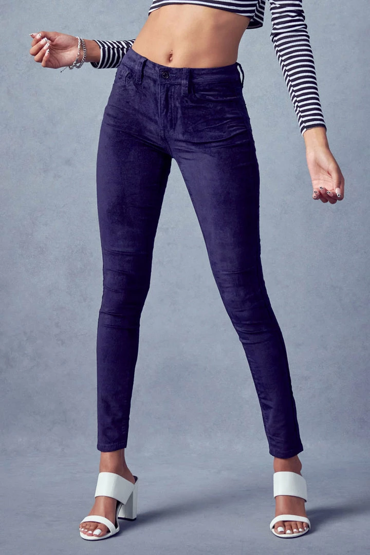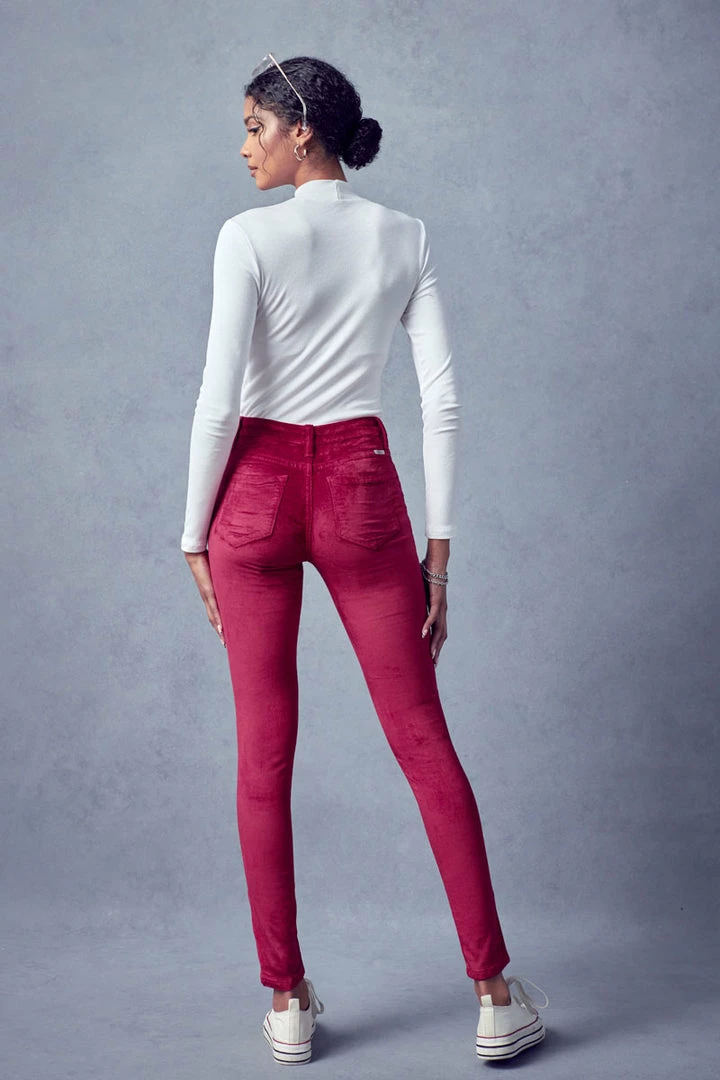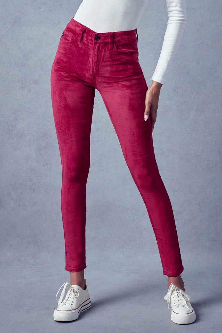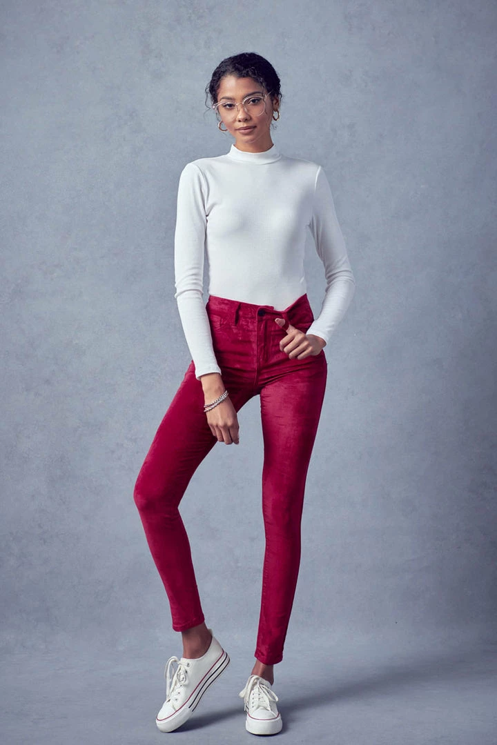 Freshen your closet with this silhouette-enhancing burgundy velvet skinny with extra stretch and comfort.Â