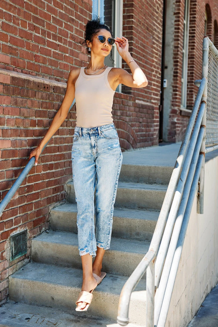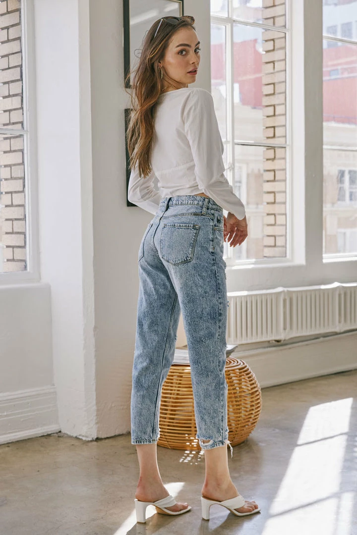 Add edginess to any outfit with this pair of acid-washed relaxed-fit non-stretch mom jeans. Featuring easy tapered fit, slight distressing detail on the hem and throughout, whiskering, a single button zip-fly closure, and a 5-pocket design.