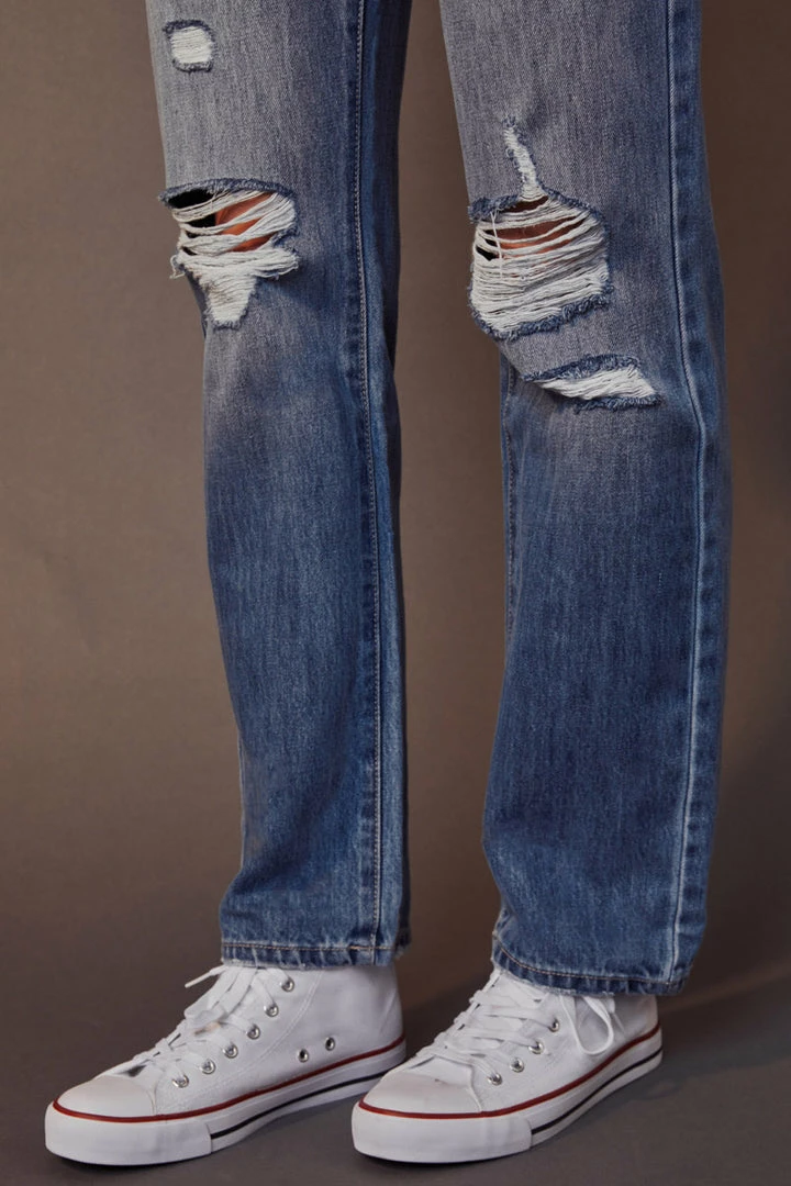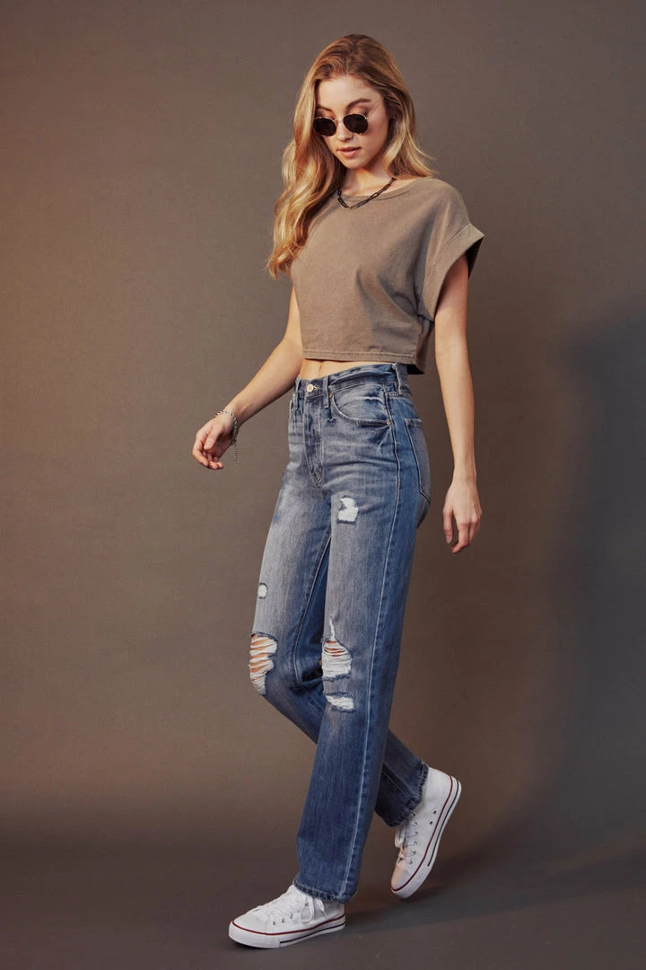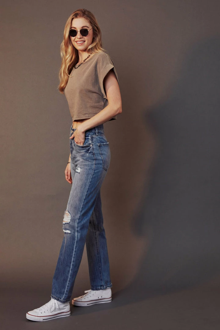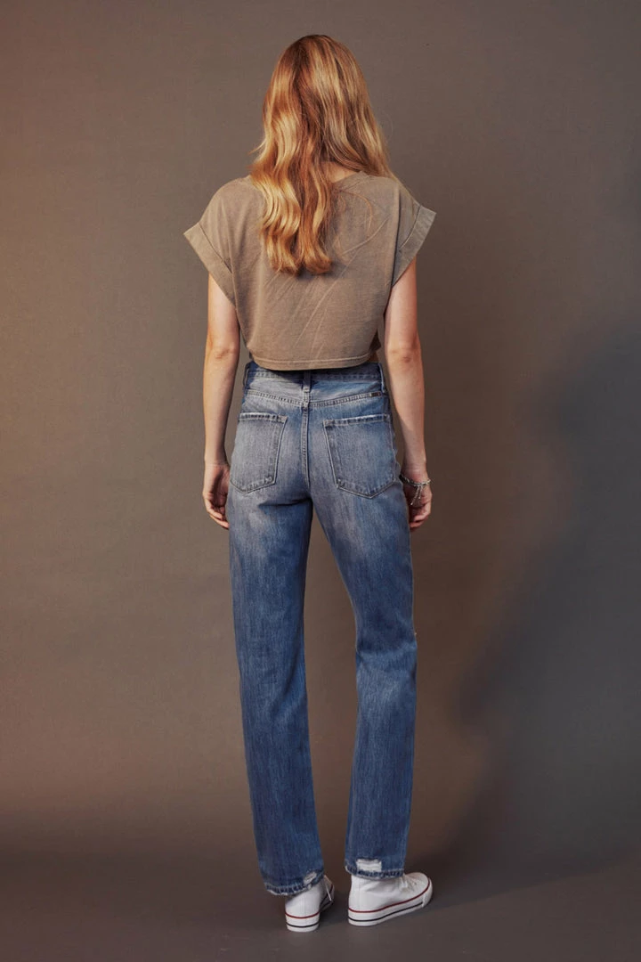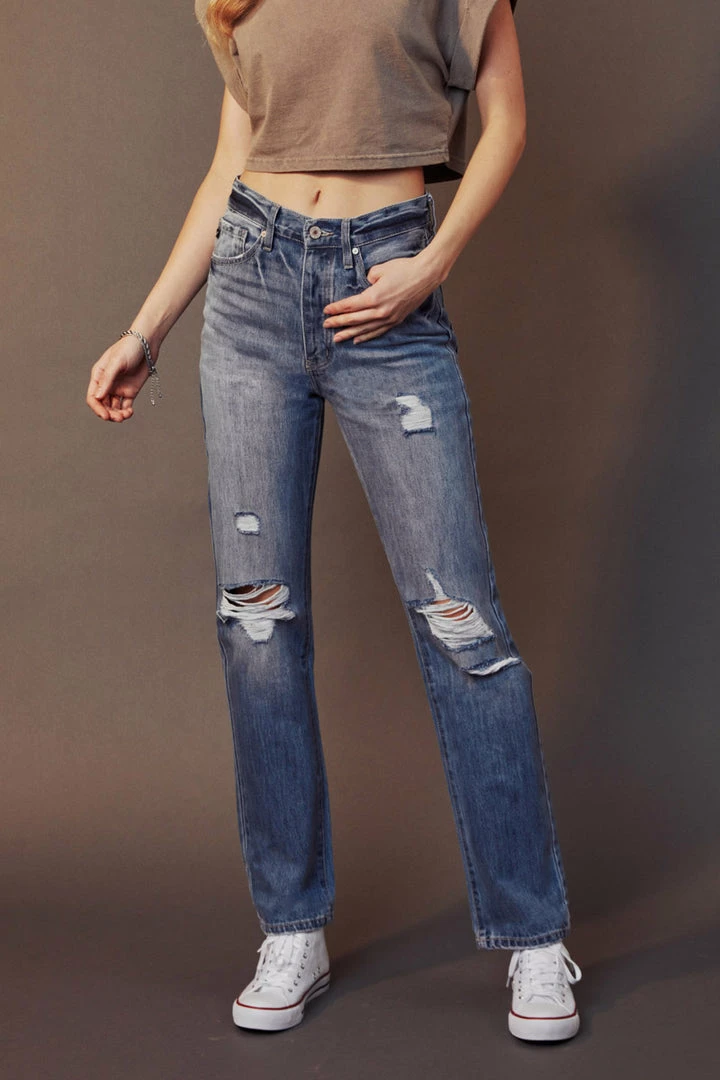 Our medium-washed Hattie High Rise Jeans come in our classic 90’s Straight Leg fit with a tattered knee destruction and a gentle fade. Made with rigid denim that holds its shape while retaining a buttery-soft feel. Features a classic five-pocket design and hidden five-button front closure.