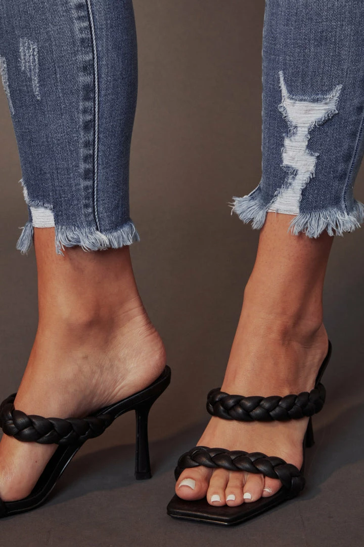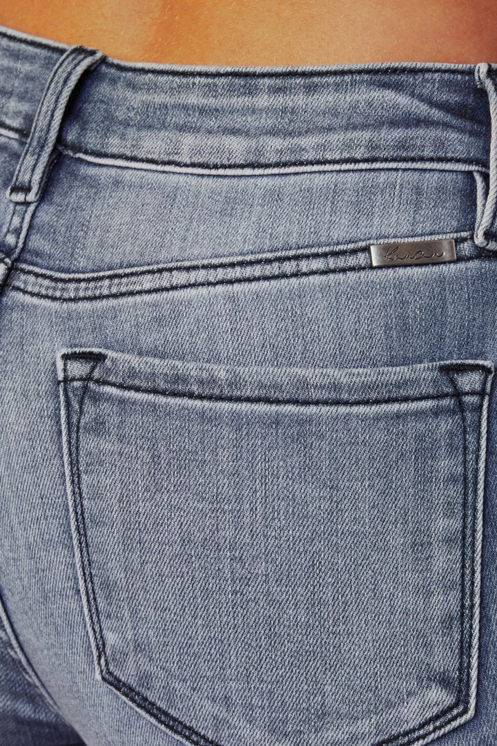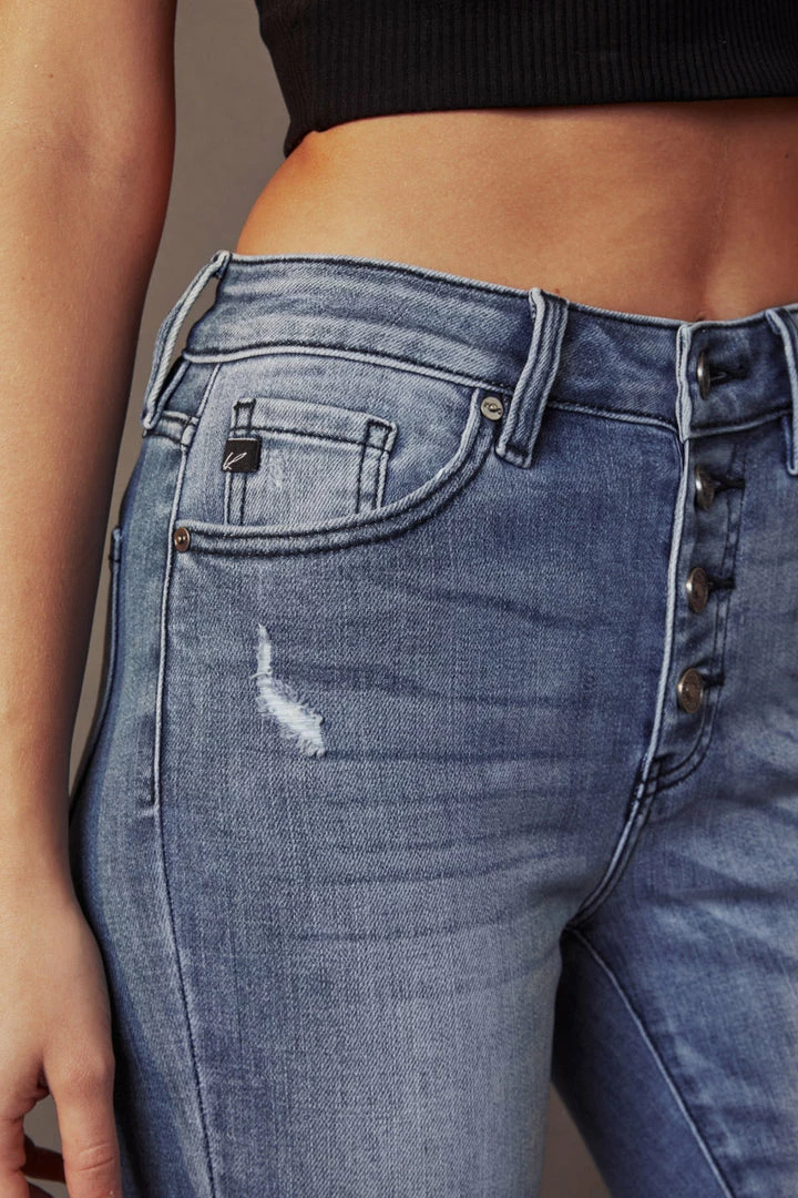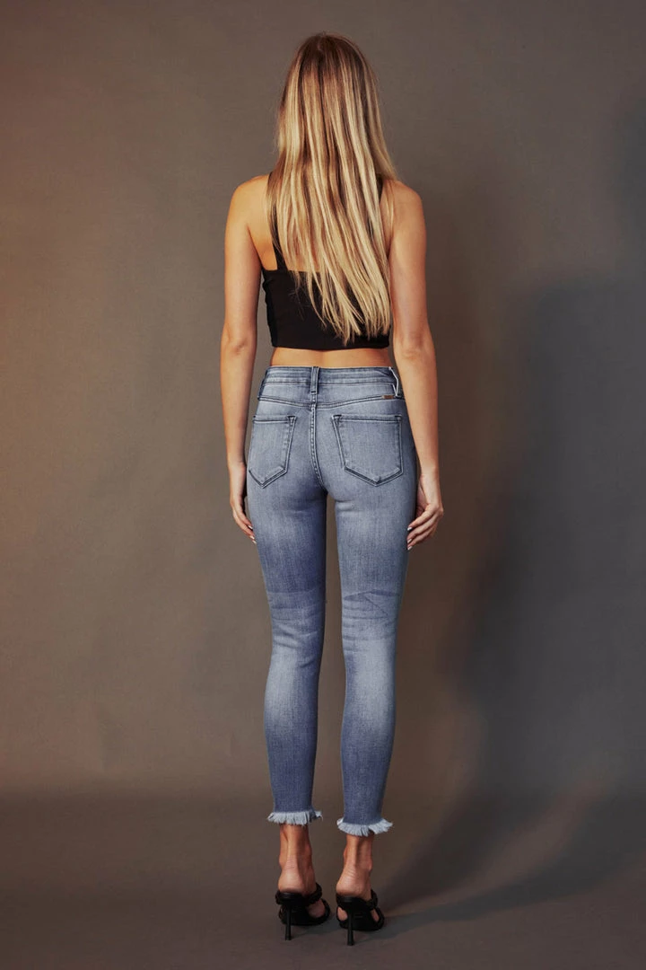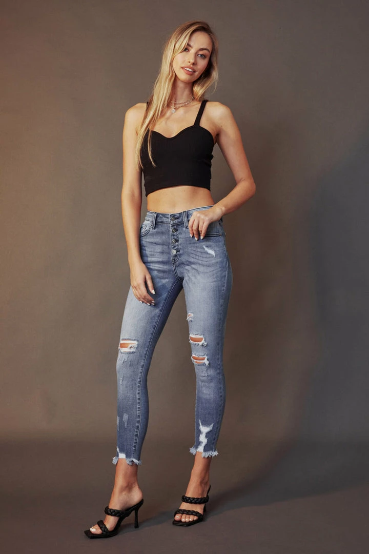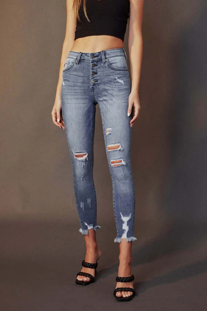 Faded blue hues and moderate distress create a combination that’s sure to give any fit a rugged edge. Sits just above the waist with a skinny fit from the waist down. With light whiskering, a raw hem, and button-up closure, It’s a statement jean that will quickly become a staple piece in your wardrobe.Â