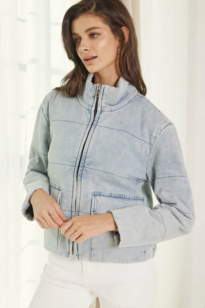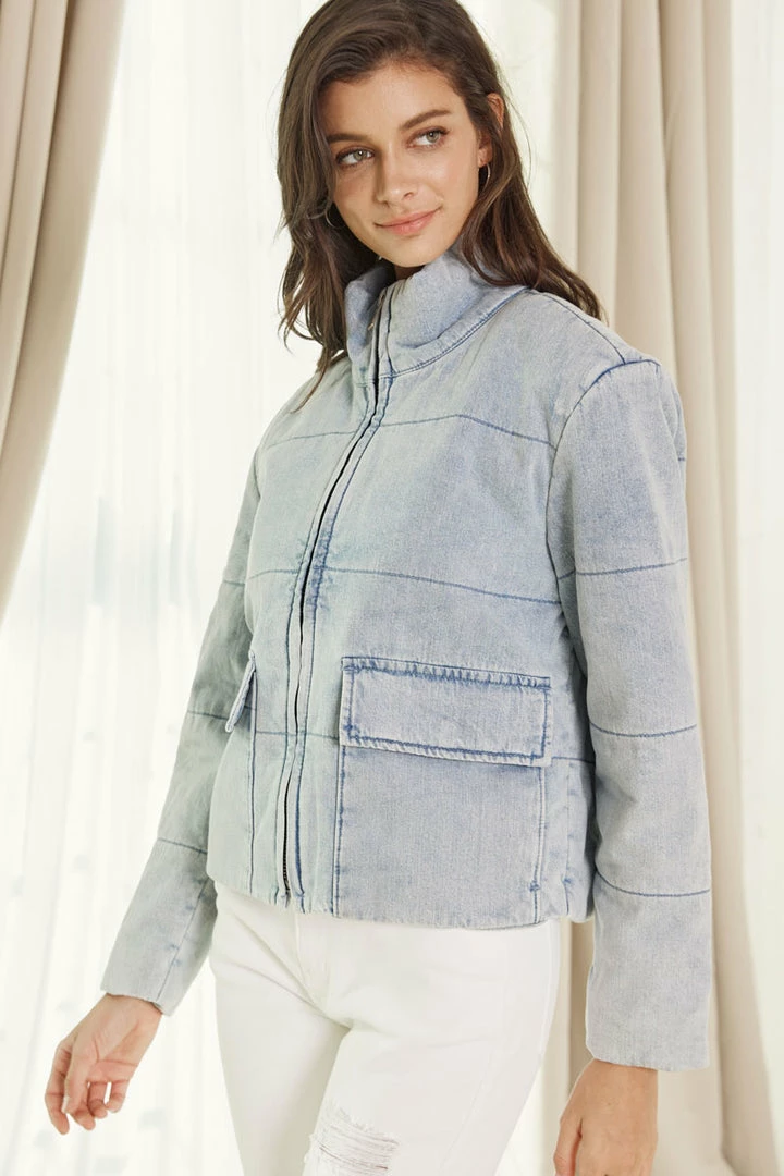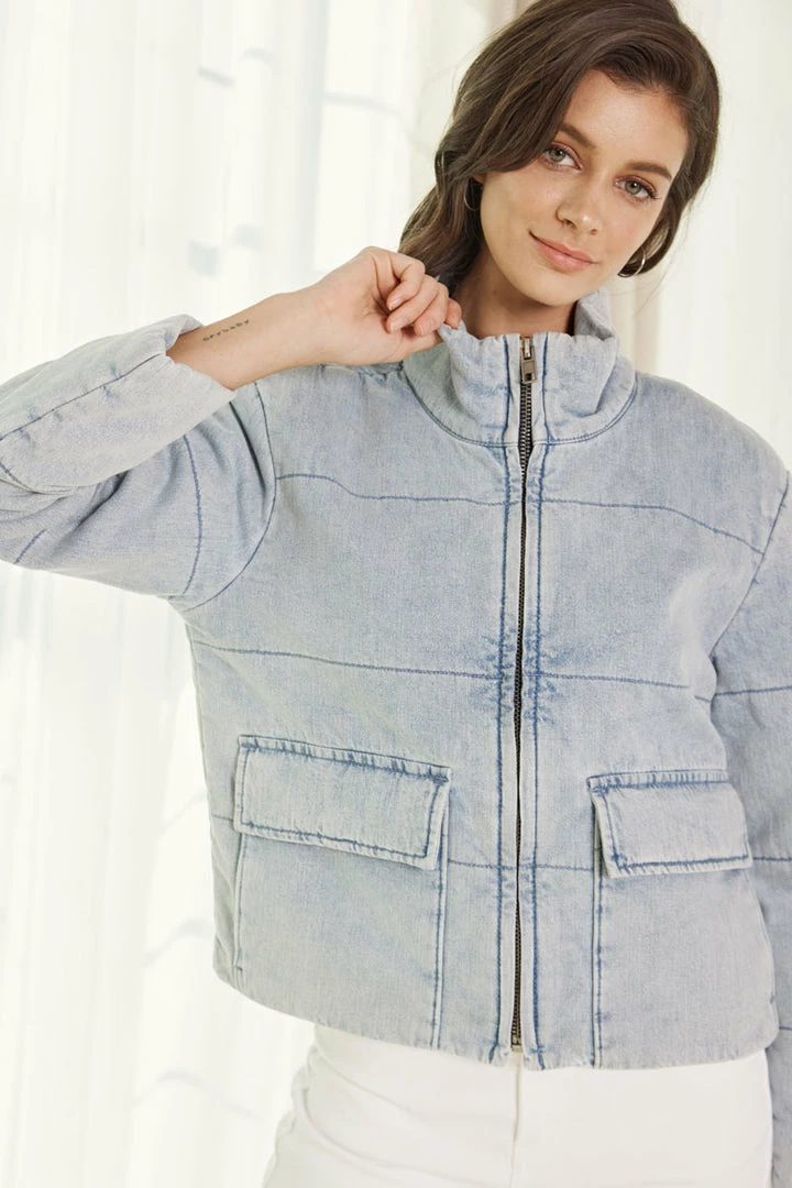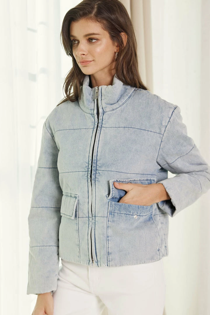You don’t have to compromise style for comfort or warmth with this chic puffer jacket made with 100%Â Cotton featuring an exposed zip-up closure and dual patch pocket.