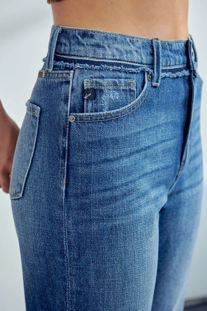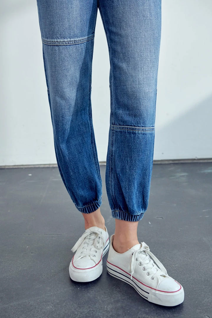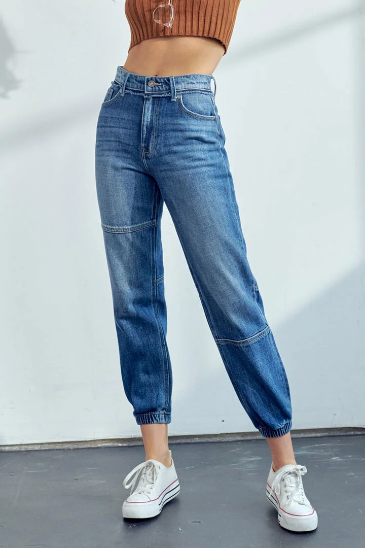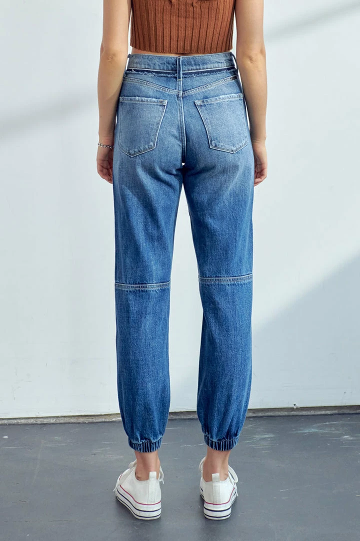 Our Henley Ultra High Rise Jogger features a scrunch elastic band above the ankles to give it a casual yet chic look. Sits high above the natural waistline as it relaxes down the leg and finishes above the ankle. The Henley Jogger features symmetric and asymmetric stitch detail. On top of this modern pattern, it also has a contrasting dark blue trim right at the belt loop with a frayed design to give it that next level of style.