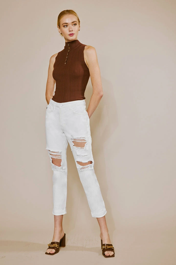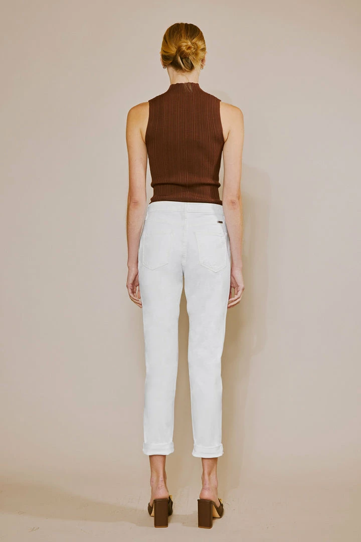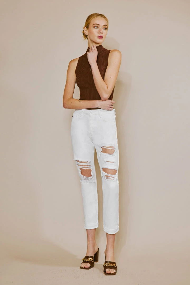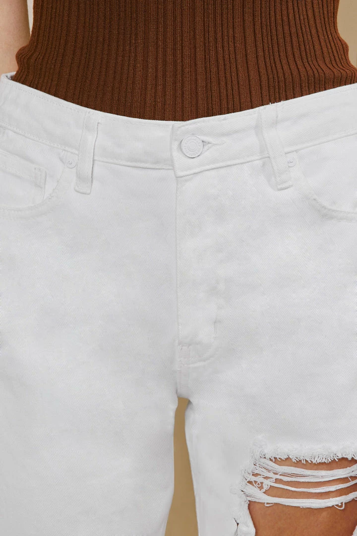Our Hope mom jeans come in white with a cuffed hem and optimal distress detail that sits high above the natural waistline as its fit relaxes through the thigh and leg. Comes in a rigid denim fabric with a classic 5-pocket design, single-button front, and zip-fly closure.