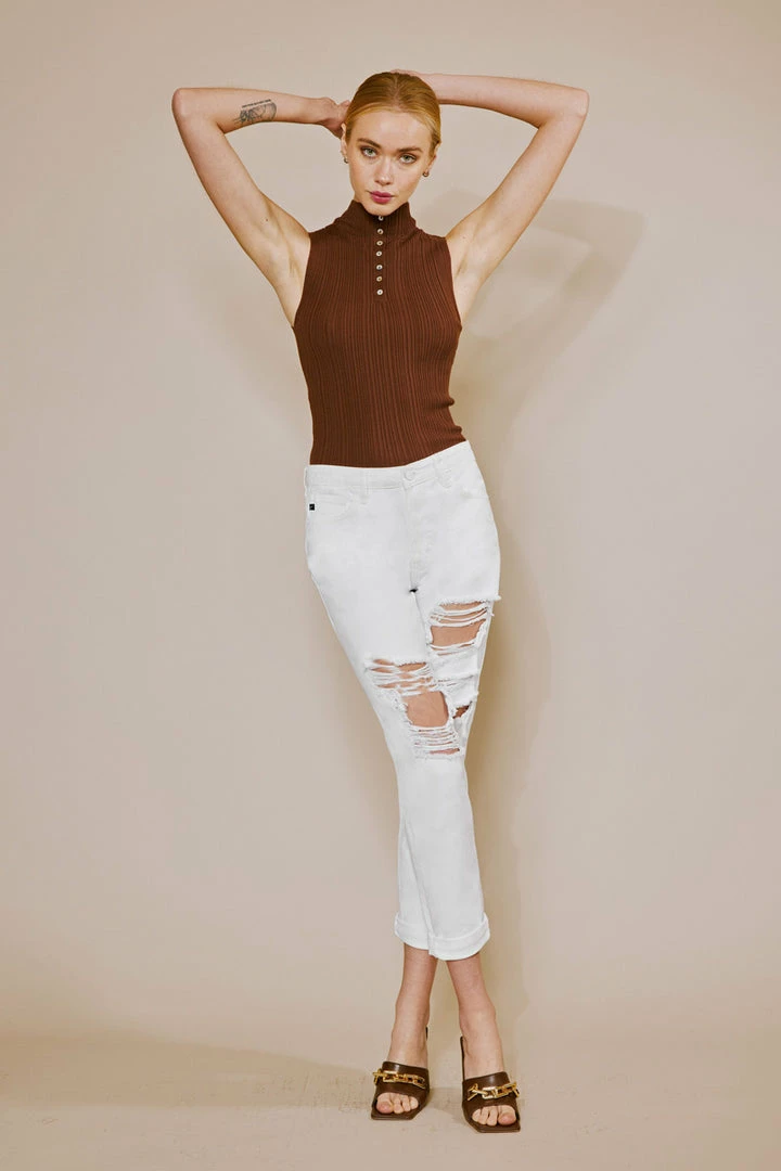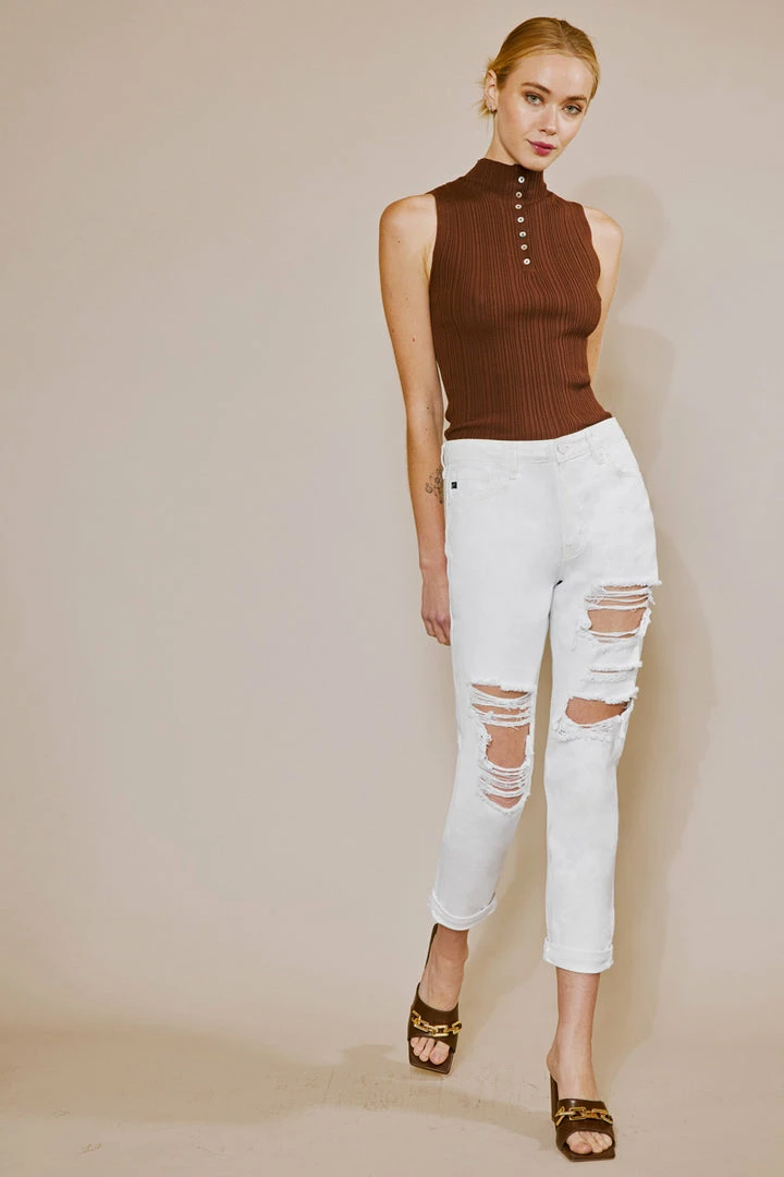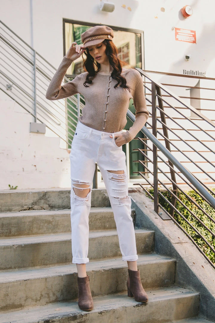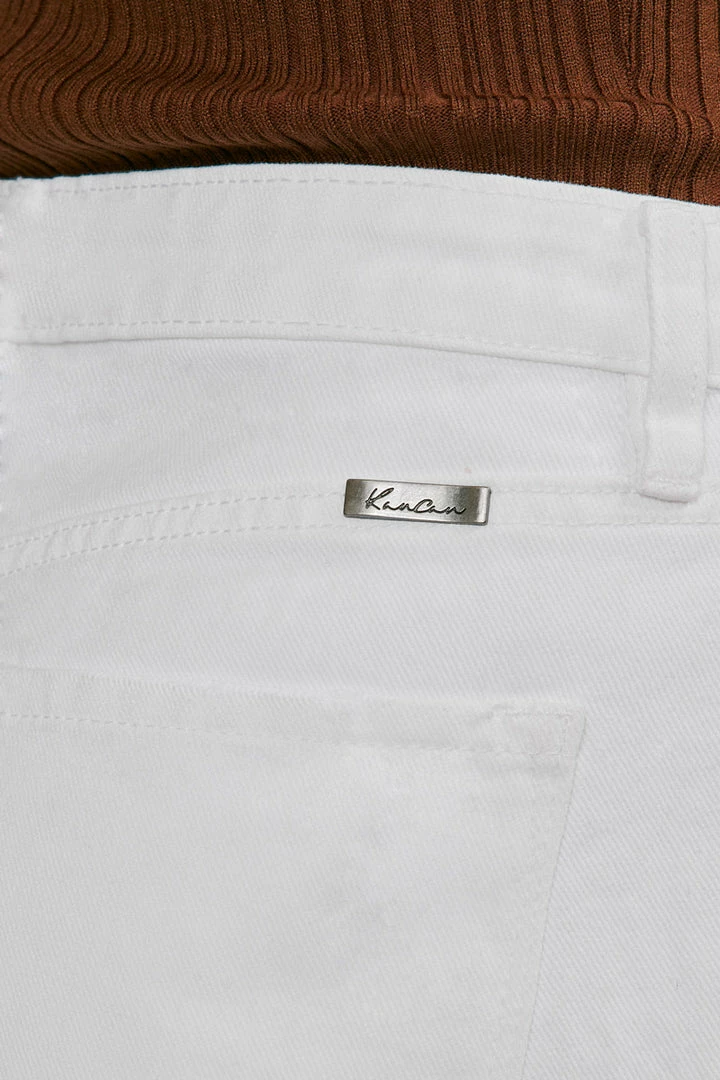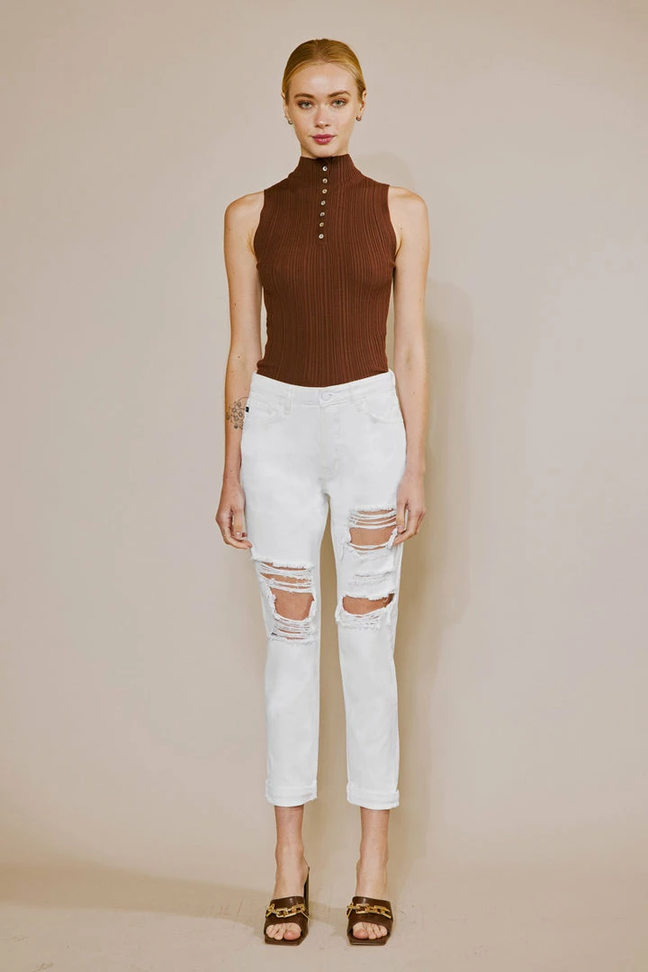 Our Hope mom jeans come in white with a cuffed hem and optimal distress detail that sits high above the natural waistline as its fit relaxes through the thigh and leg. Comes in a rigid denim fabric with a classic 5-pocket design, single-button front, and zip-fly closure.