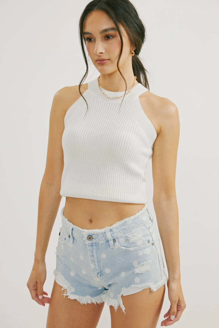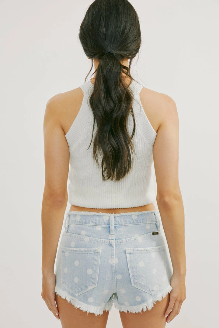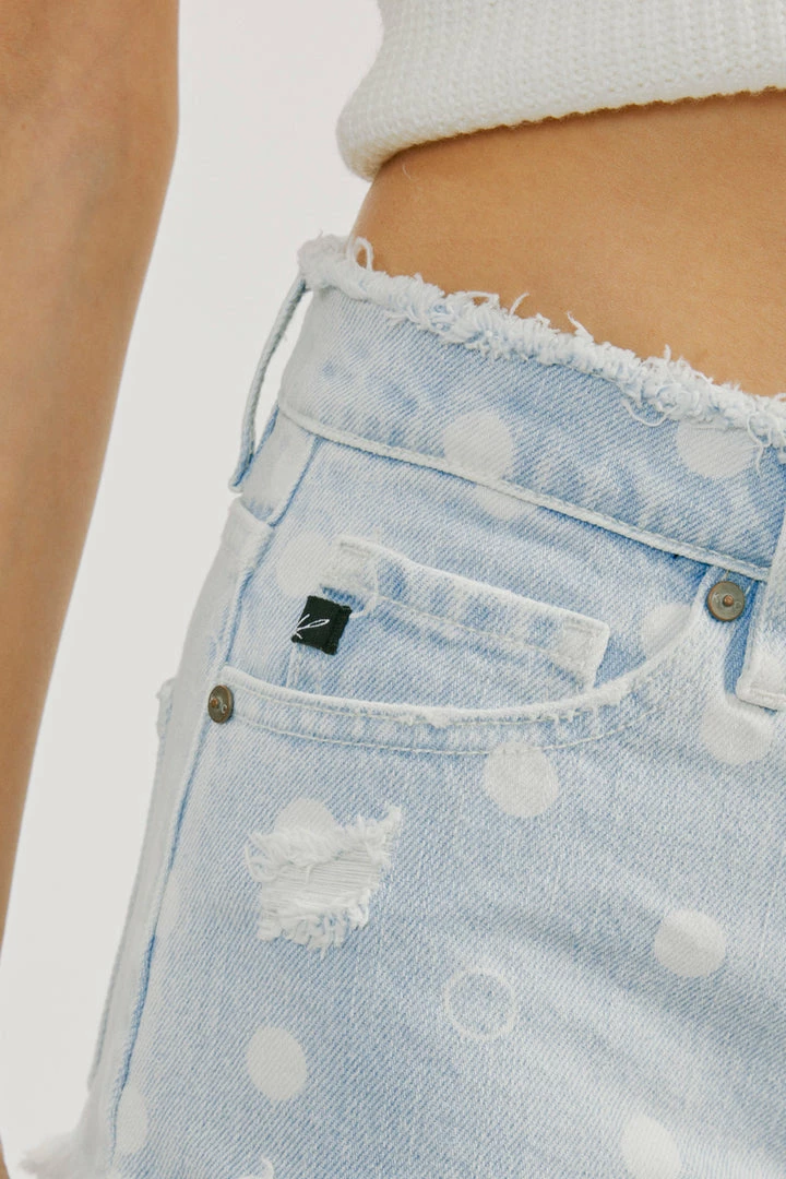 Our Ida Mid Rise Shorts come in a light blue wash with polka-dot print on the front and back for a fun and flirty design. Sits right at the natural waistline and finishes at the upper thigh with a raw hem for a casual, lived-in look. made with rigid, non-stretch denim that holds its shape and allows you to move with comfort and ease. Features a classic five-pocket design, single-button front, and zip-fly closure. Finished with gold-colored hardware.