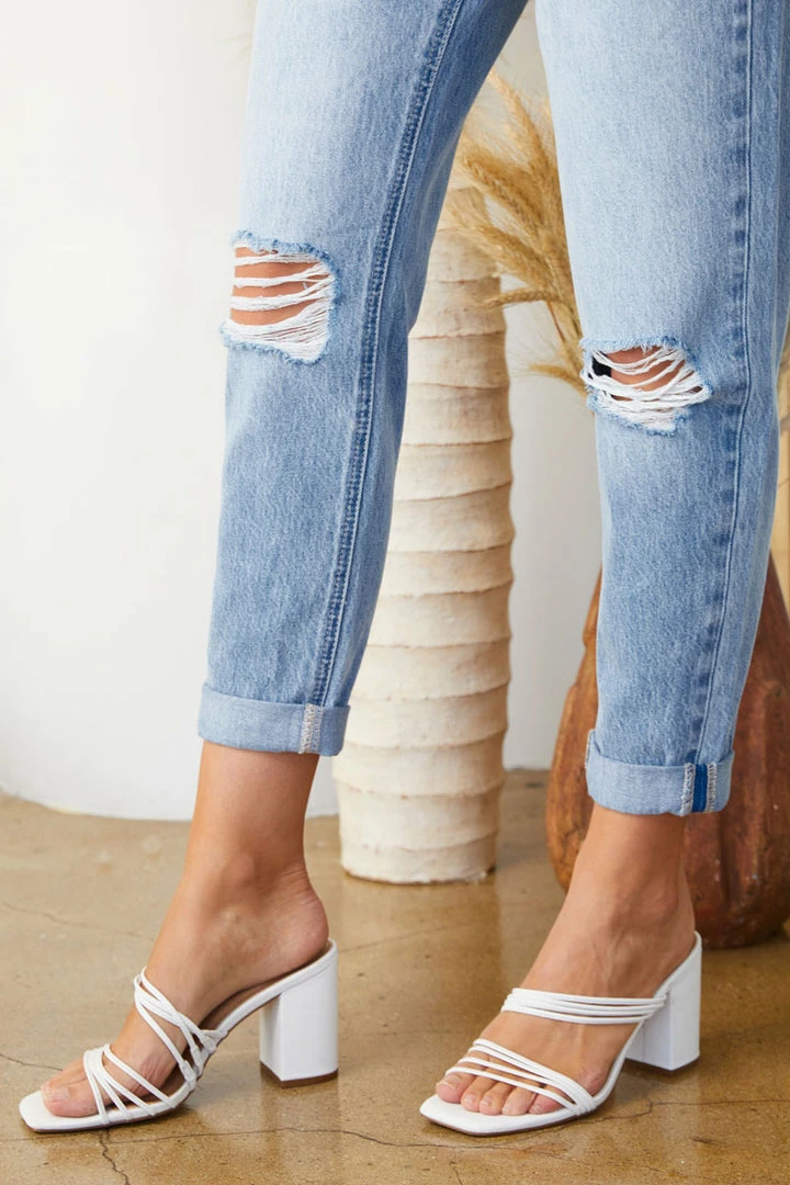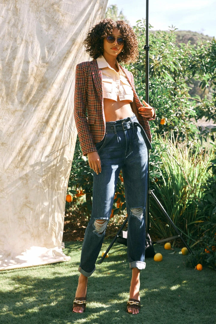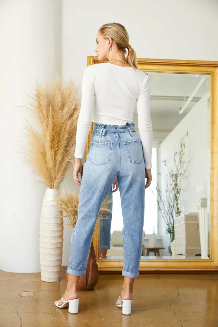 Our Ilena Ultra High Rise Mom Jeans create a relaxed yet flattering silhouette with its chic, baggy fit and waist belt. Comes in a light and dark washed, featuring a paperbag waist design that sits high above the natural waistline while its open-knee destruction. It adds an edgy element to this unique mom jean fit. Made with rigid denim that’s durable and retains its shape even after multiple wears. Features a four-pocket design, single-button front, zip-fly closure, and denim waist belt.