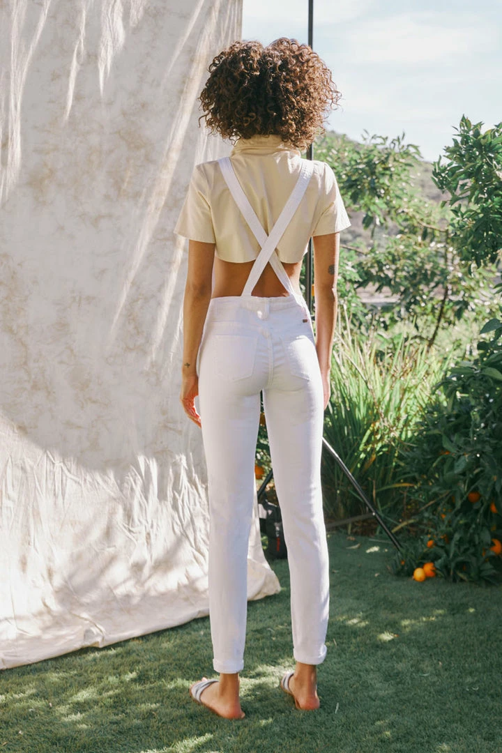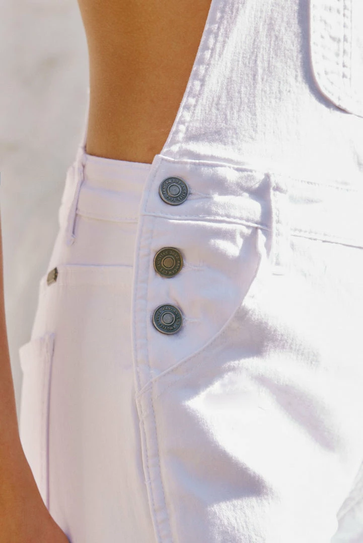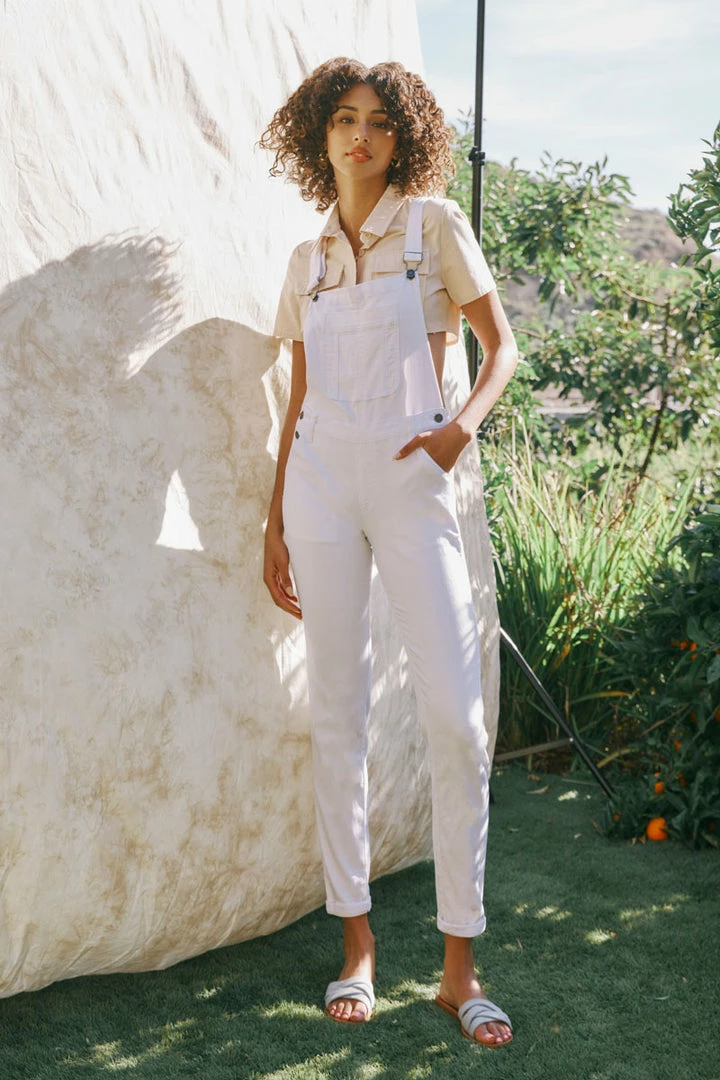 Our Ivie High Rise Overalls features optic white denim with an ankle skinny cut that’s skin-tight fit hugs in all the right places. This style sits slightly above the natural waistline as its front bib and over-shoulder straps fit comfortably around your torso for a completely customizable look. Made with soft stretch denim that’s flexible and durable. Features a four-pocket design, triple-button side closures, pocket at the chest of the bib, and two clasped over-shoulder adjustable straps.