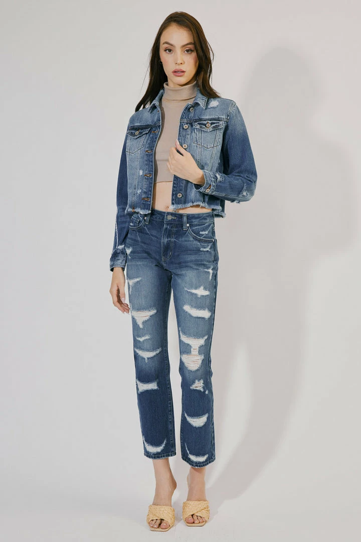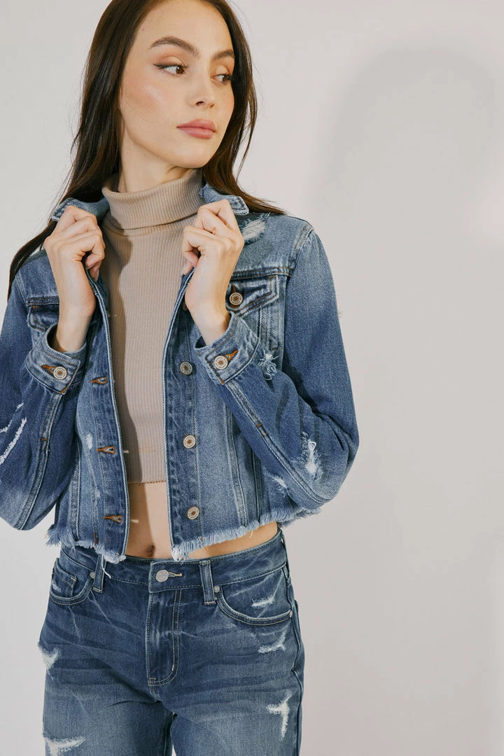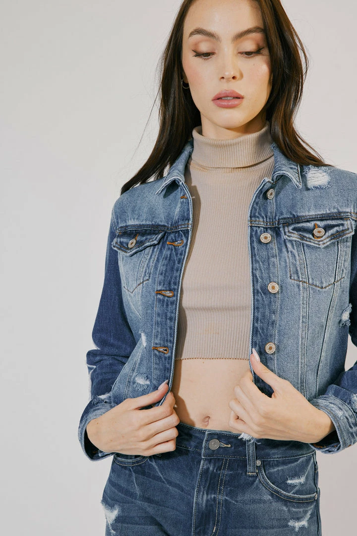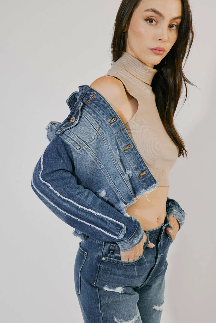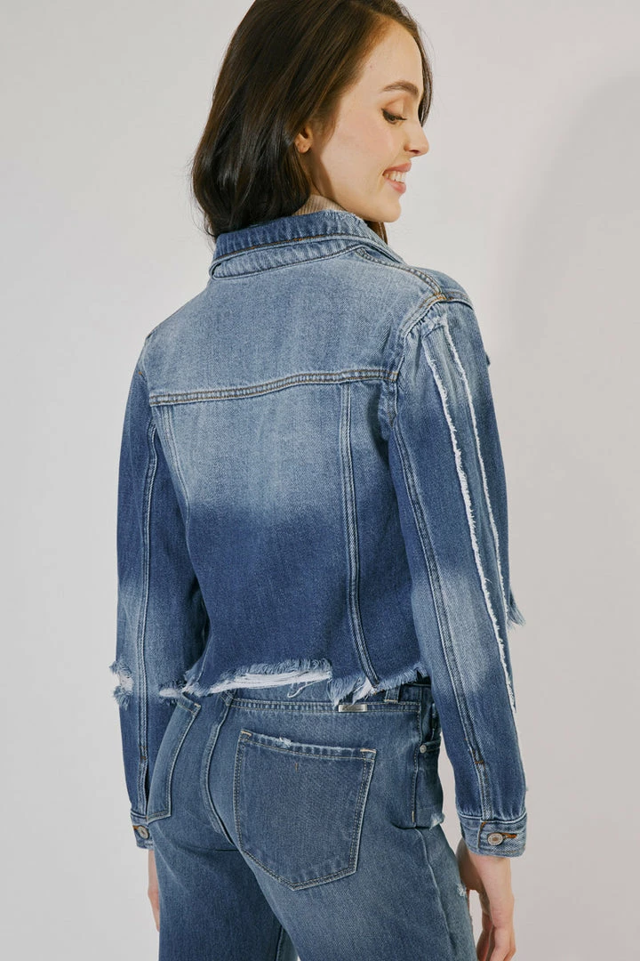 Structured designs and a faded blue wash come together to form this unique, medium-wash denim jacket with sleeve detailing. Its loose fit and distress detail combine rugged elements that will add just the right amount of edge to any outfit. Create a look that fits your style or shakes up your norm.Â