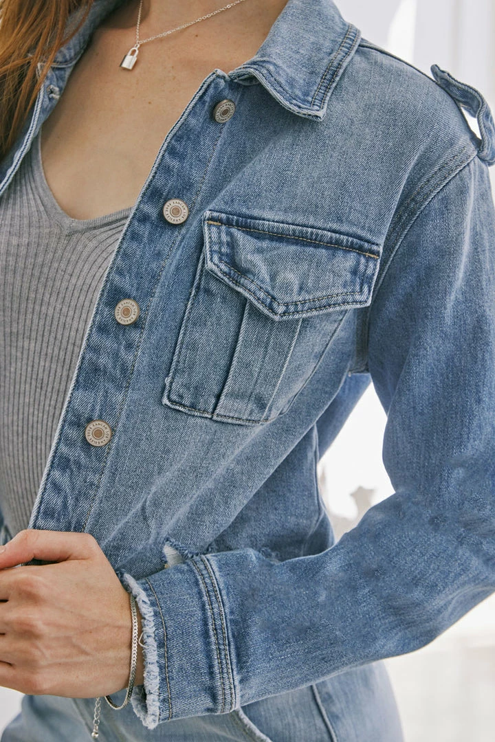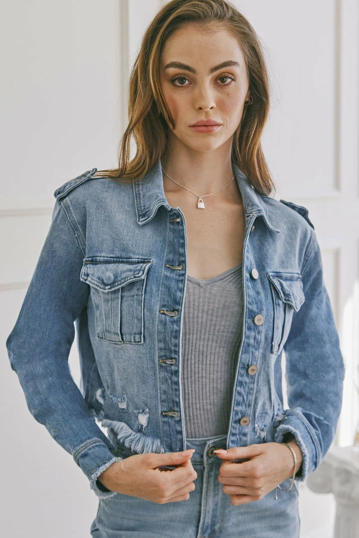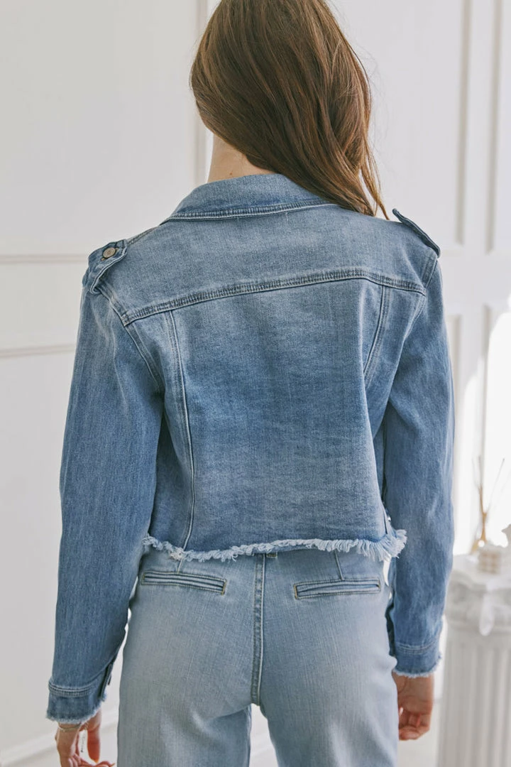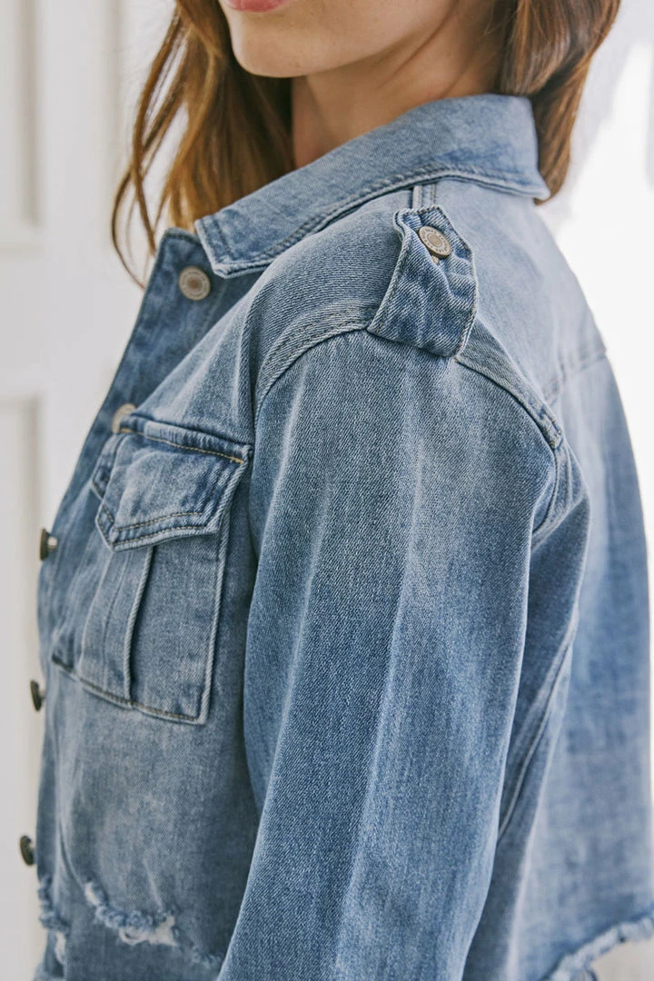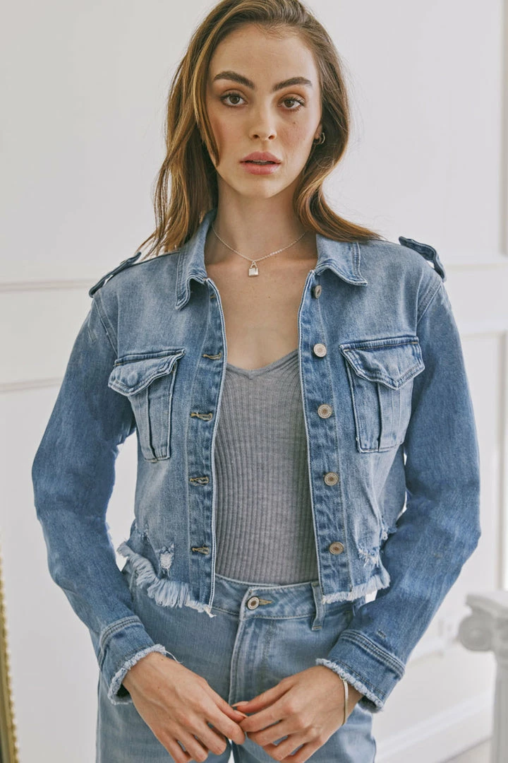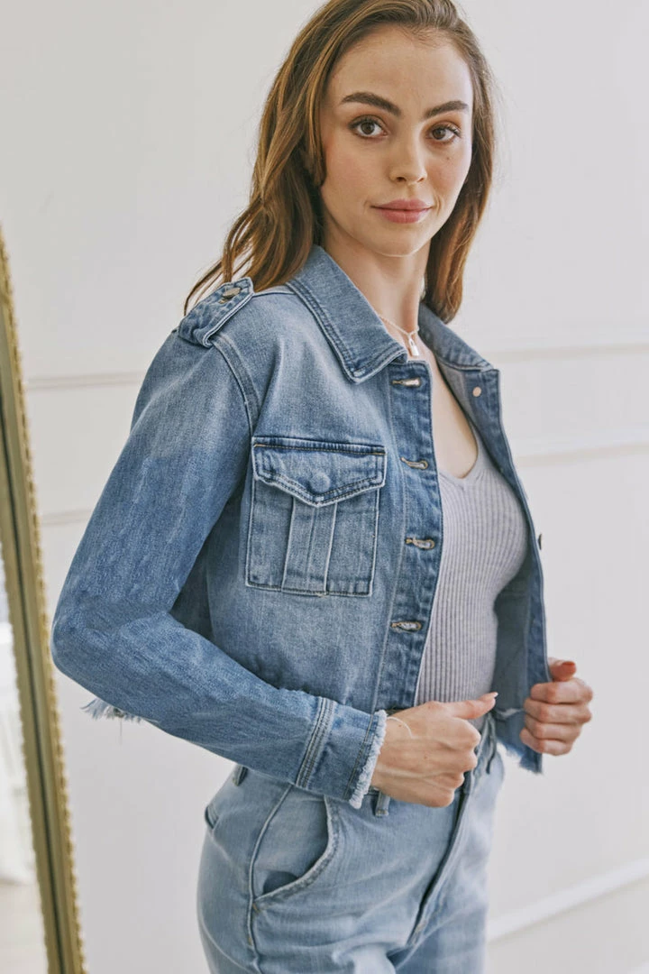 Medium wash relaxed crop denim jacket designed for those who are looking for a unique and flattering denim jacket. Features a frayed hem, fading, and a hidden snap button on the front pocket. Dress it up or down — the choice is yours!