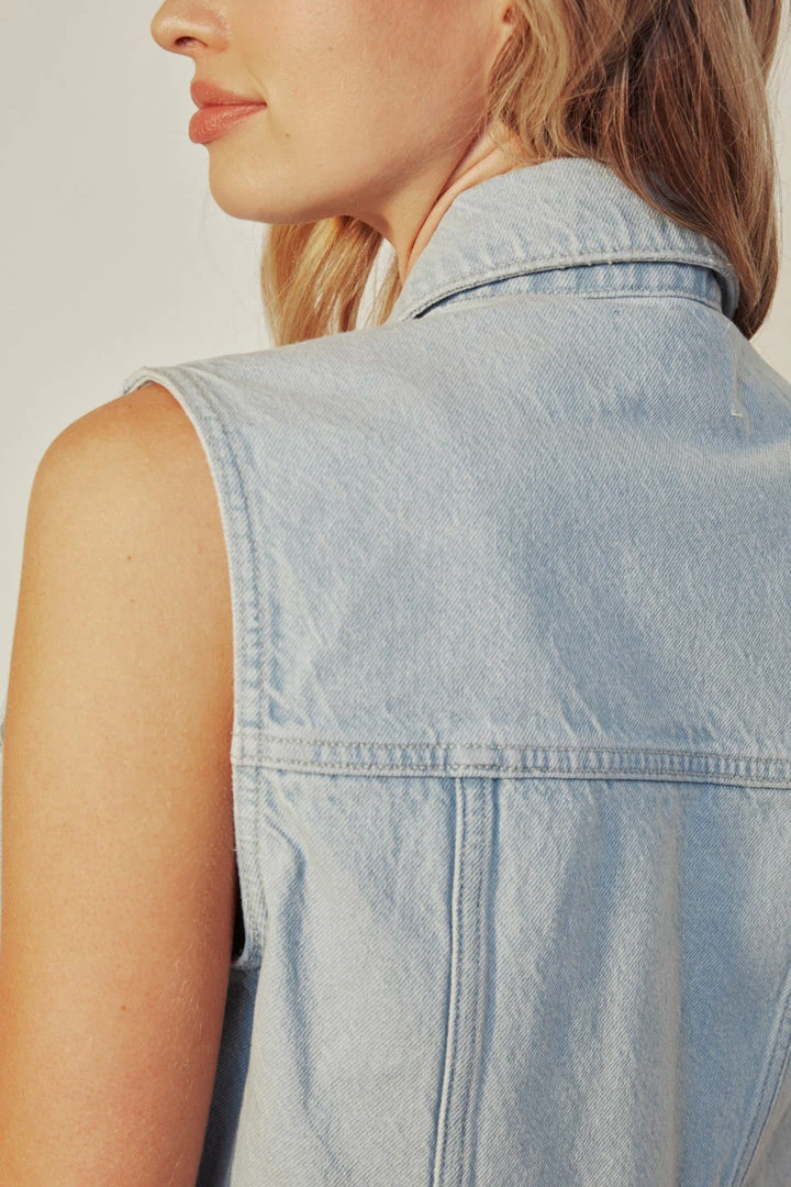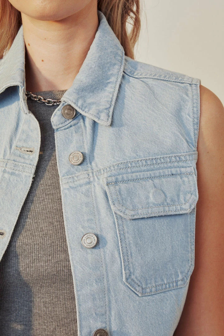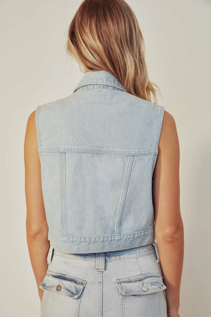The Skylar Cargo Vest is your new favorite style! This chic light-washed vest is perfect to pair with shorts or bootcut jeans. Featuring a basic collar and front snap button-flap pockets.Â