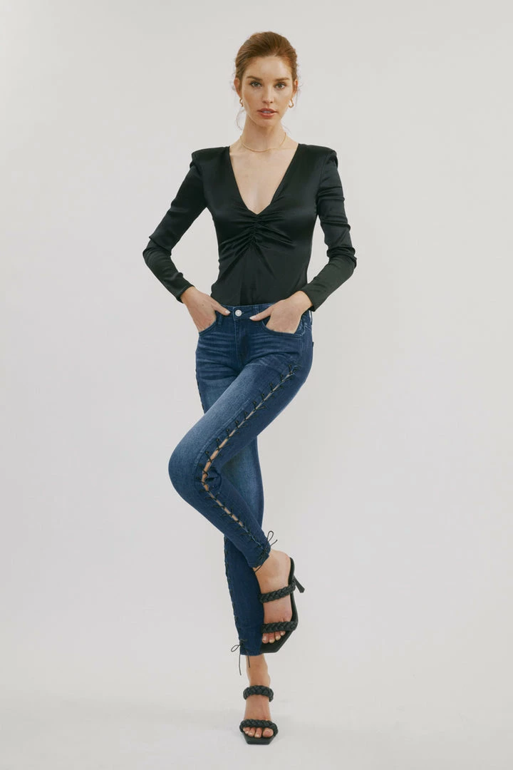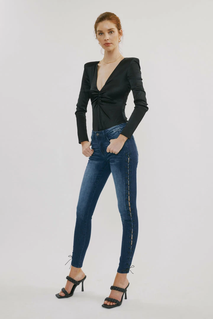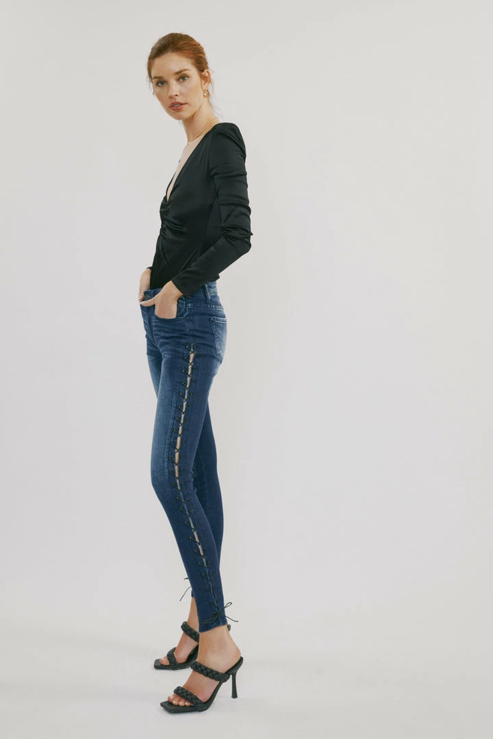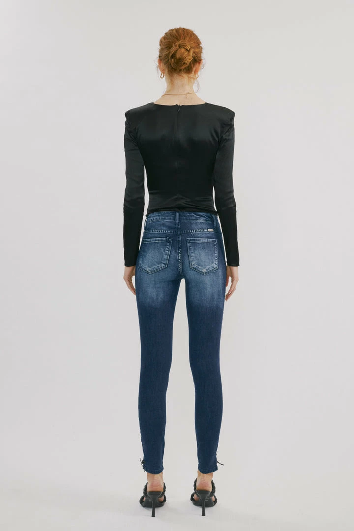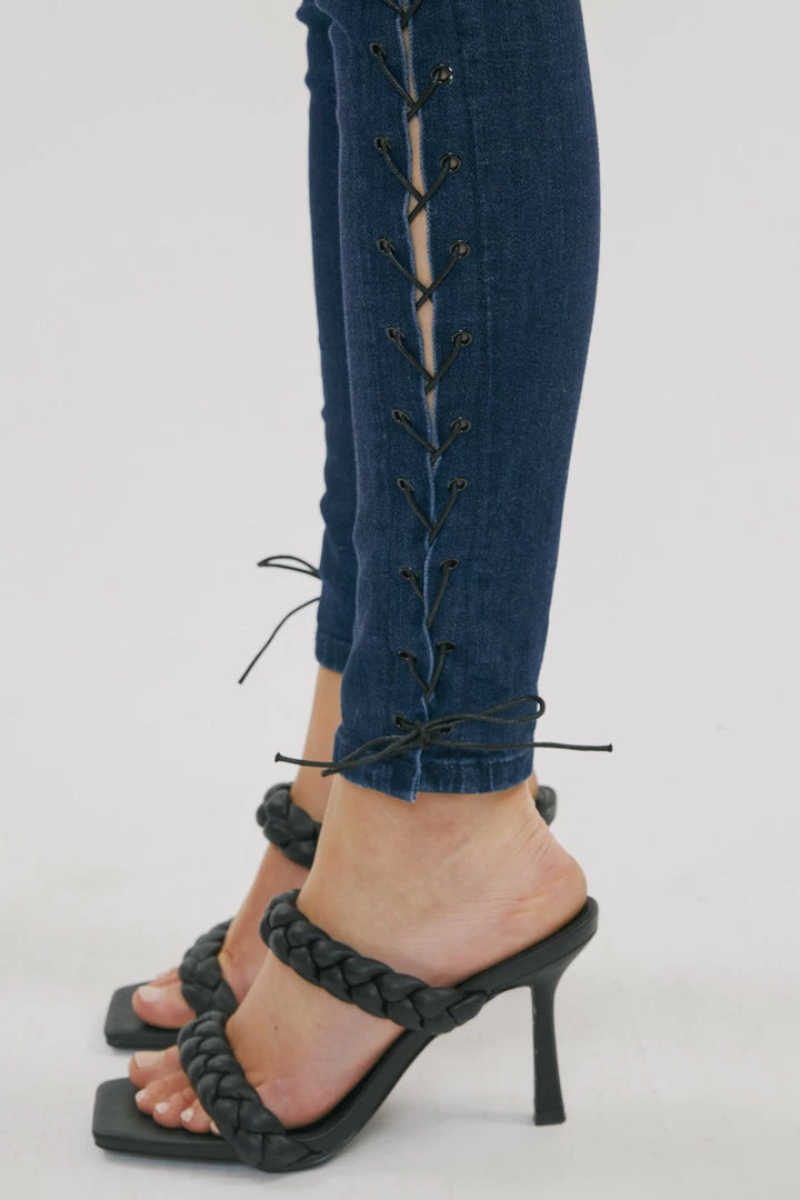 Faded medium wash ankle skinny with outer seam lace detail at the hems that provide extreme comfort while looking chic. Featuring a single button fastening, zip fly, standard belt loop, and regular 5 pockets.