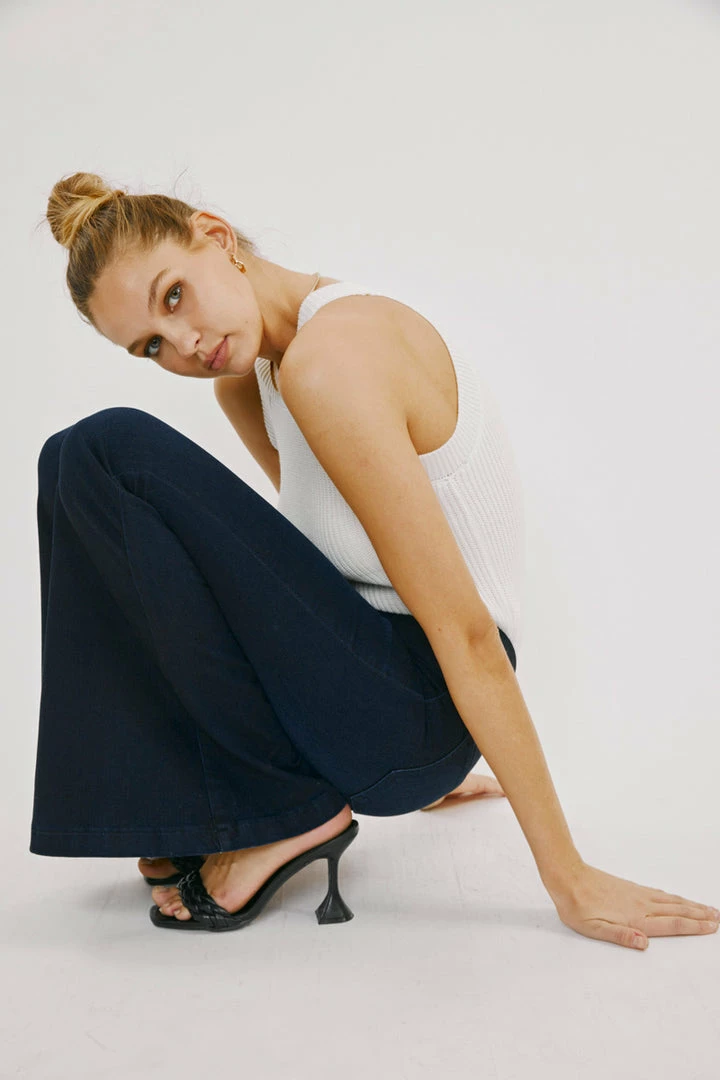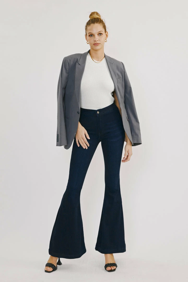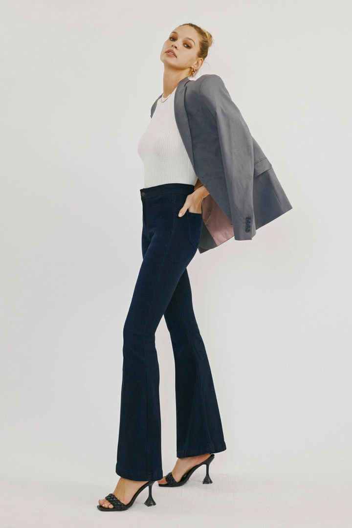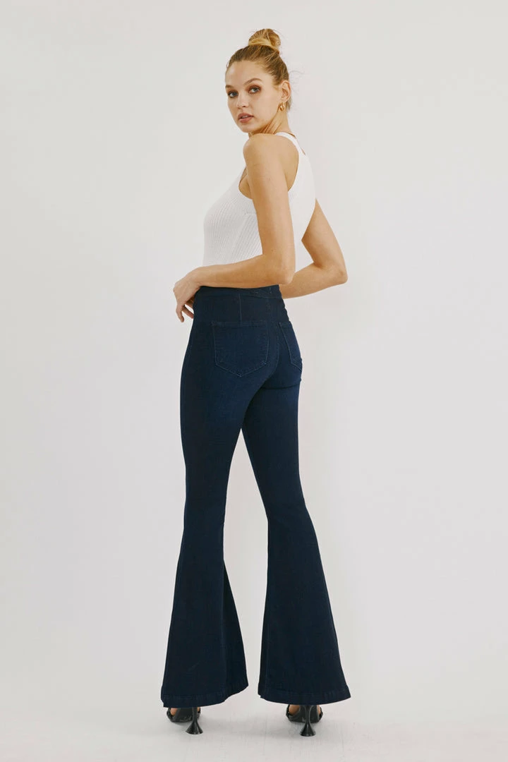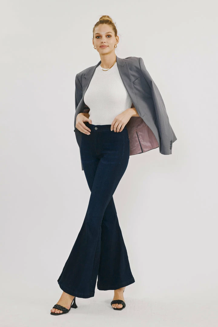 This trendy, silhouette-enhancing flare jeans will have all eyes on you! Featuring light whiskering, 2- pocket design, and extreme flare bottom.