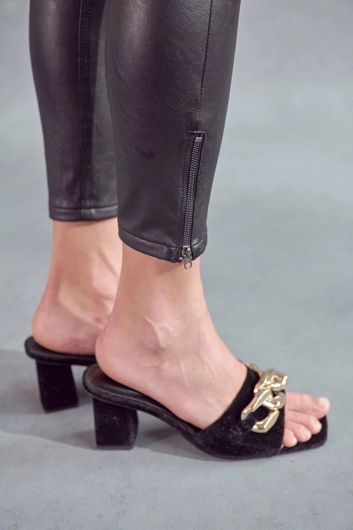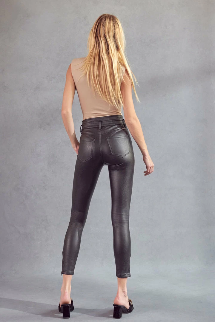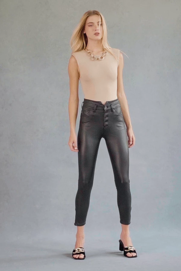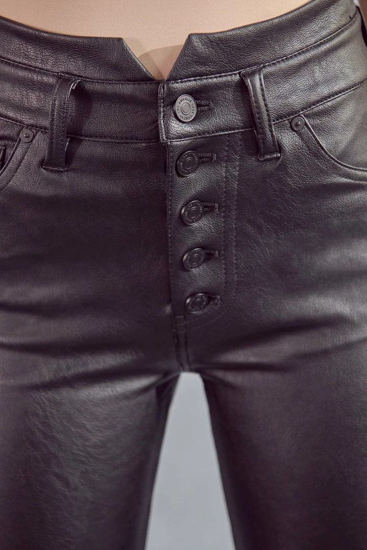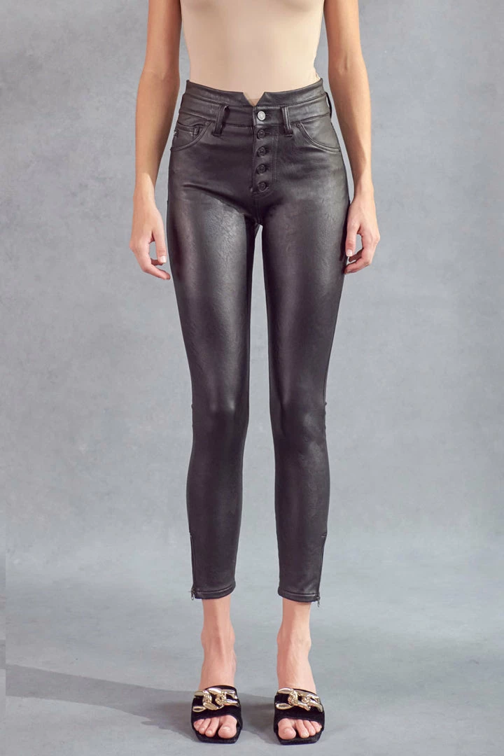 Our Janet High Rise Faux Leather Pants come in an ankle skinny fit with a matte black finish that creates a stylishly sleek silhouette. Sits above the natural waistline as it tapers down the leg creating a skin-tight feel that hugs all your curves. Made with 100% faux leather polyurethane that molds to your body while giving you the flexibility to bend and move. Features a classic five-pocket design and five-button front closure.
