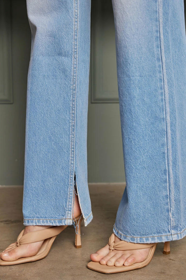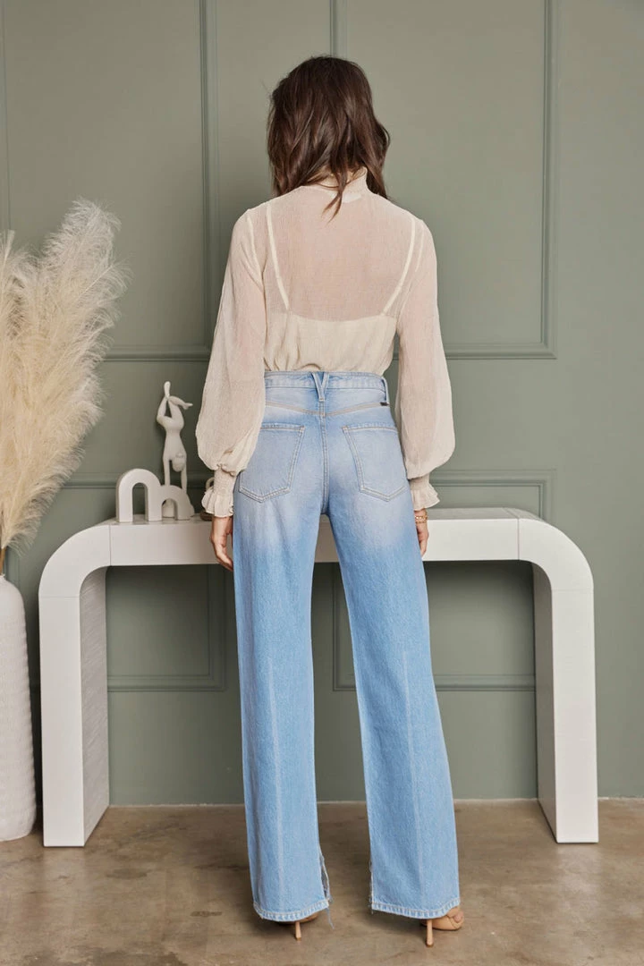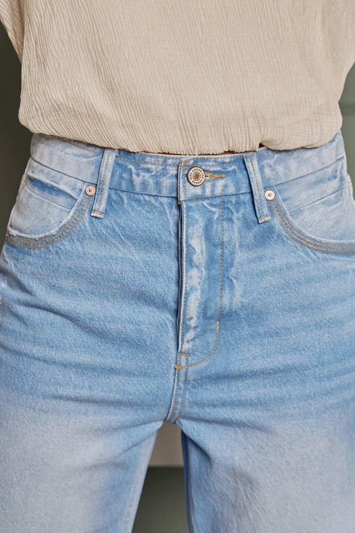 Our Janna High Rise Flare features a retro wide leg design and a hidden-button fly closure. Its Light denim wash comes with minor fading detail that gives it just the right amount of edge. Its rigid denim makeup creates a not-too-stiff style that won’t ever bag out after each wear.