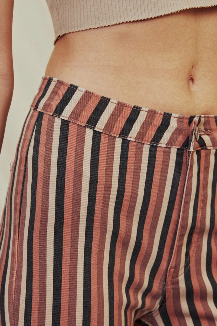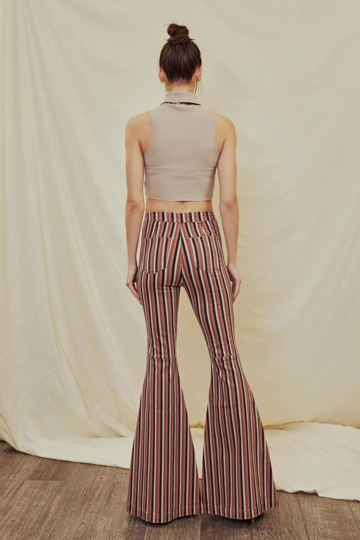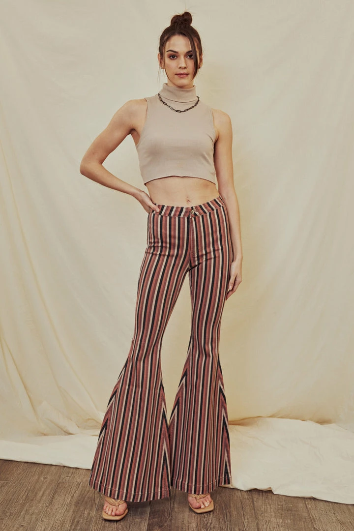 Get wild with our Jaqueline High Rise Super Flare Jeans set in a unique burgundy striped design. Includes back dart detailing to give the perfect fit and lift while ensuring comfort from our stretch denim. Featuring a cut seam at the back of the knee, wide hem, classic front button closure, and zip fly.Â