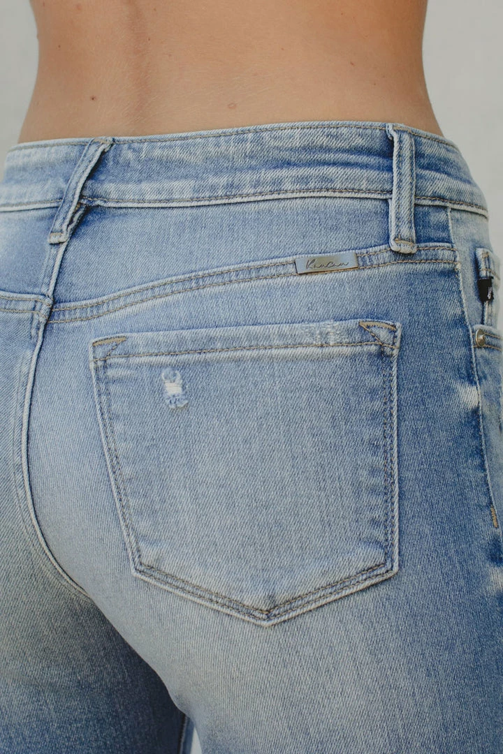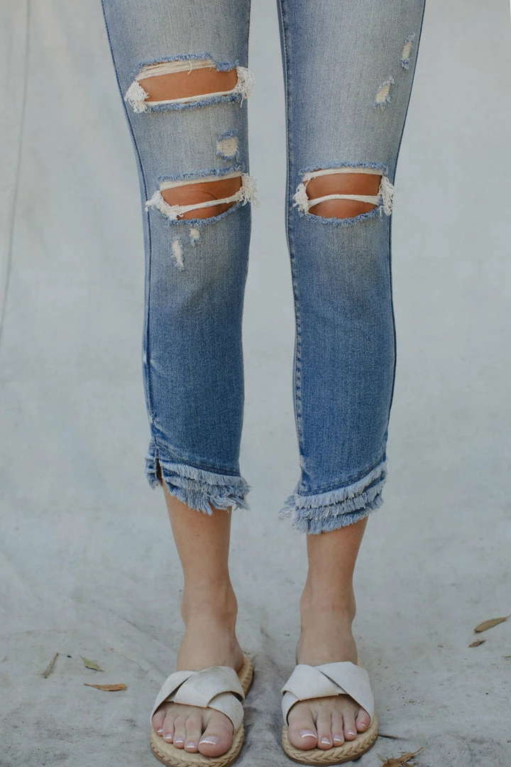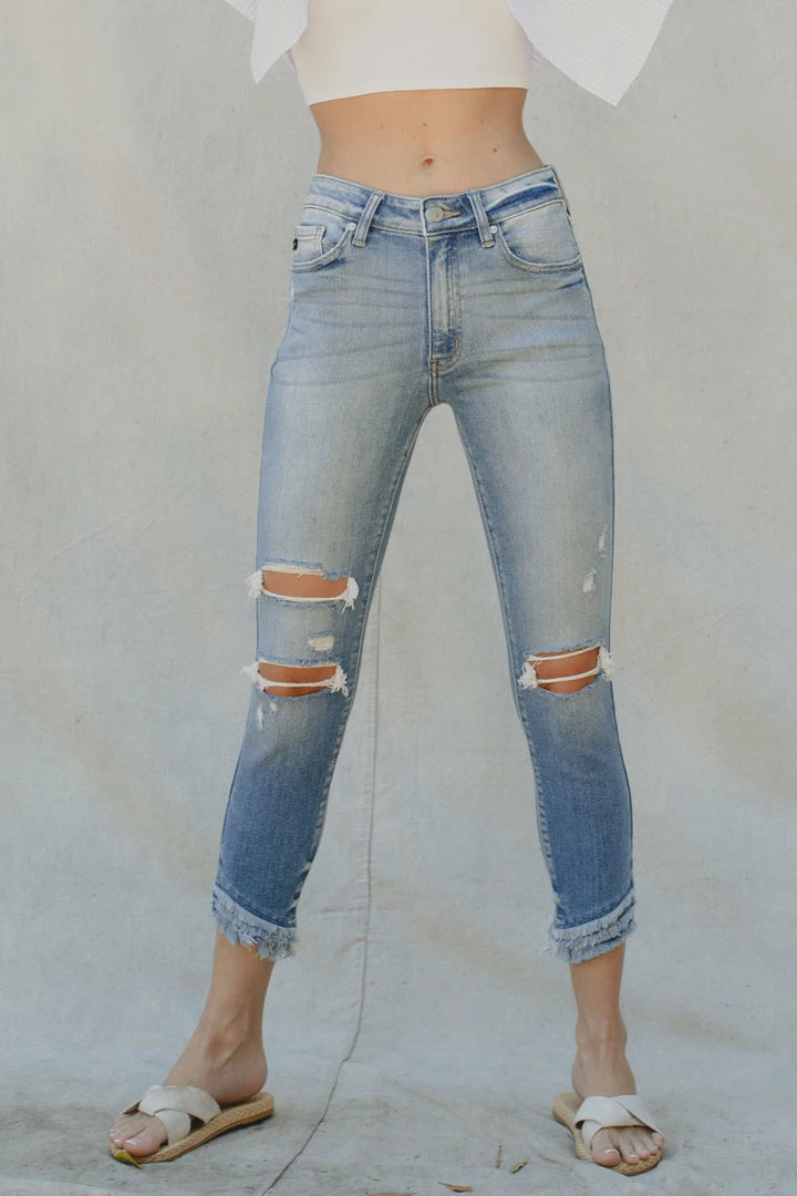 Look and feel your best this season in our Jaycie High Rise Ankle Skinny! This pair will become an instant wardrobe staple in your closet! Featuring whiskering, fading, distressed details, triple frayed hem with slit, 5-pocket design, and a single button closure with zip fly.Â