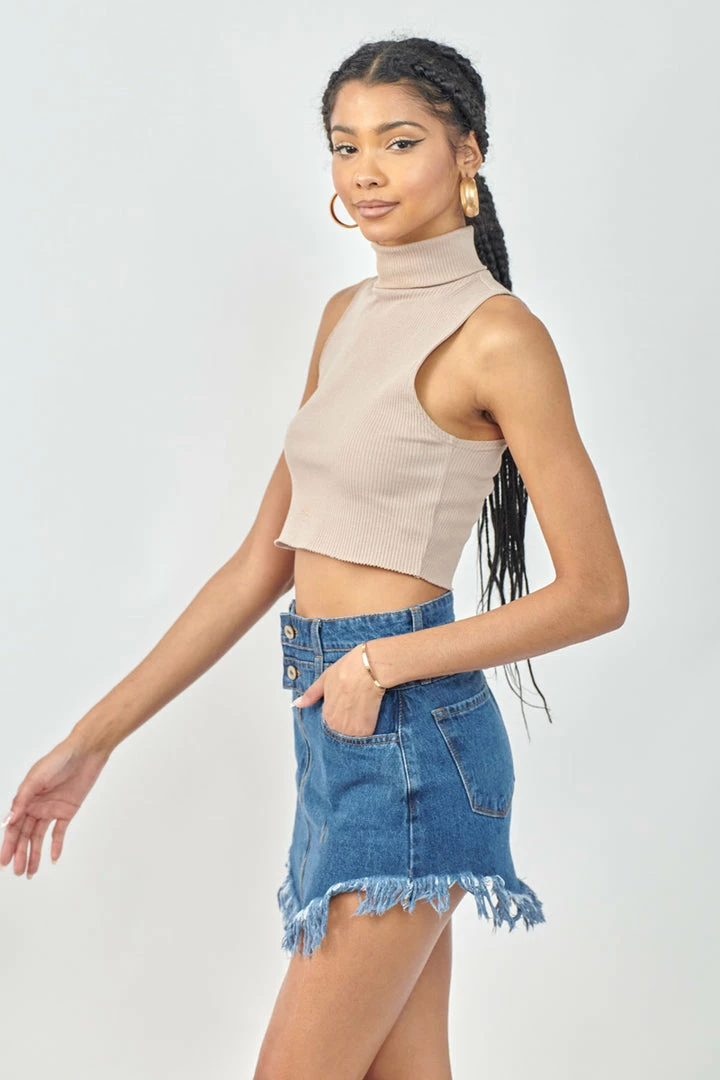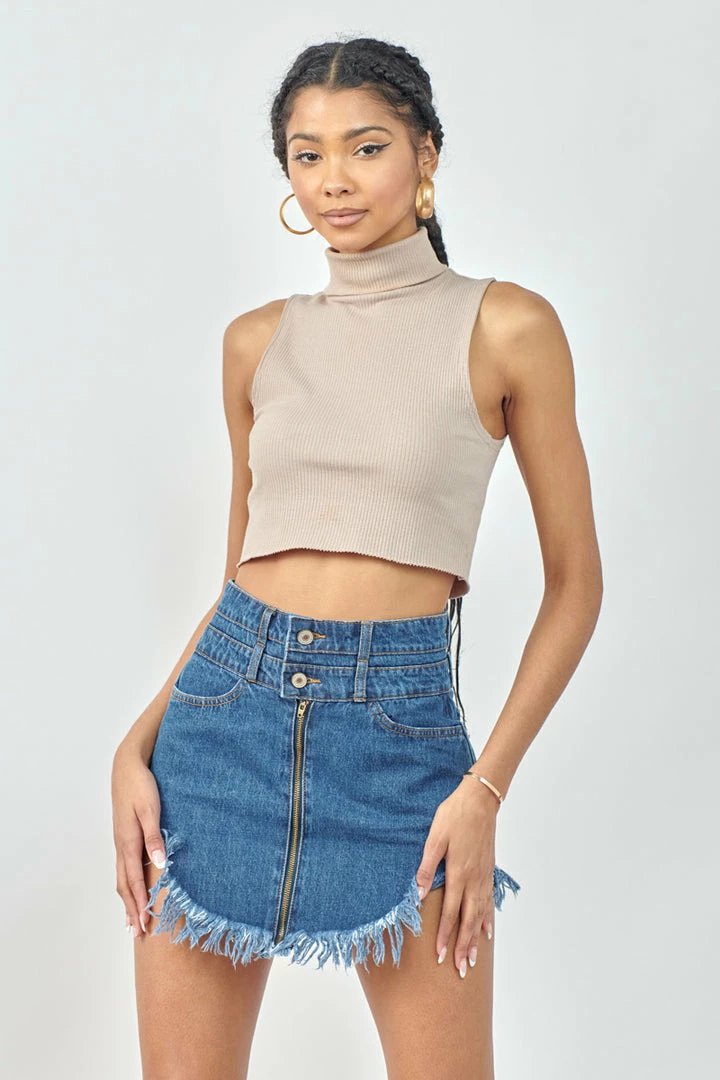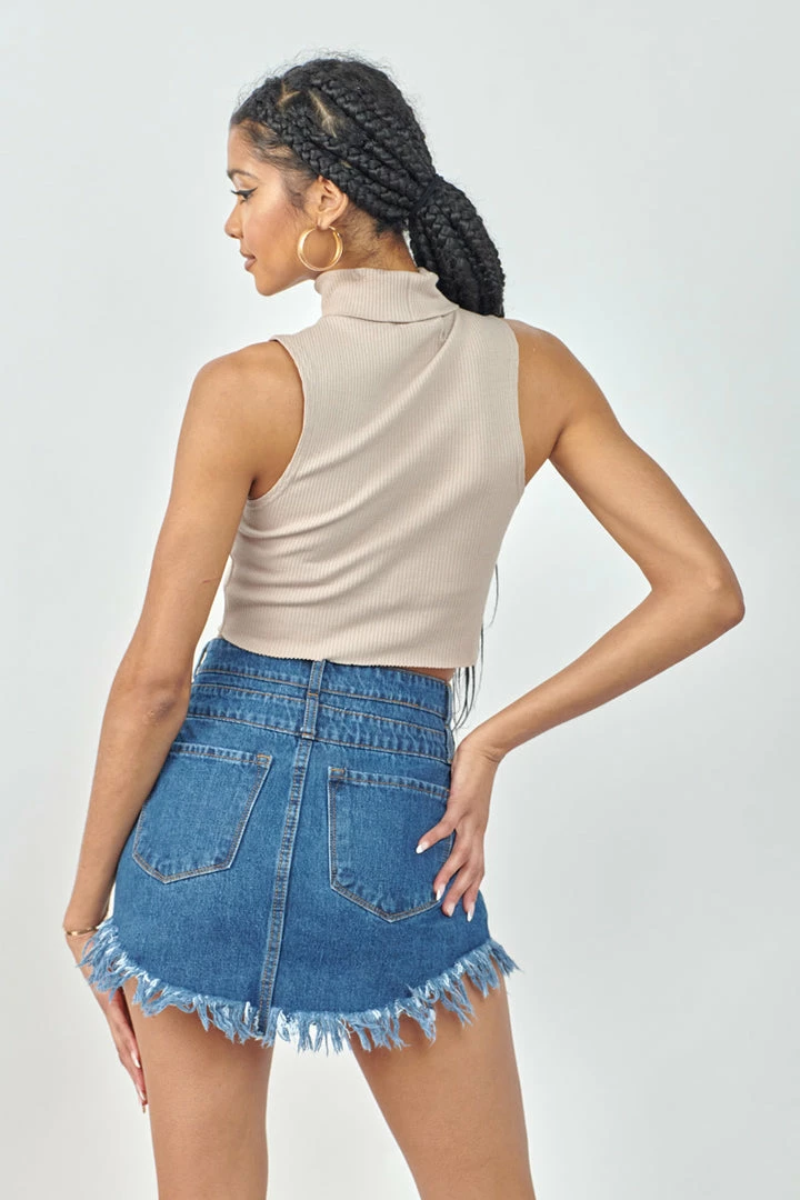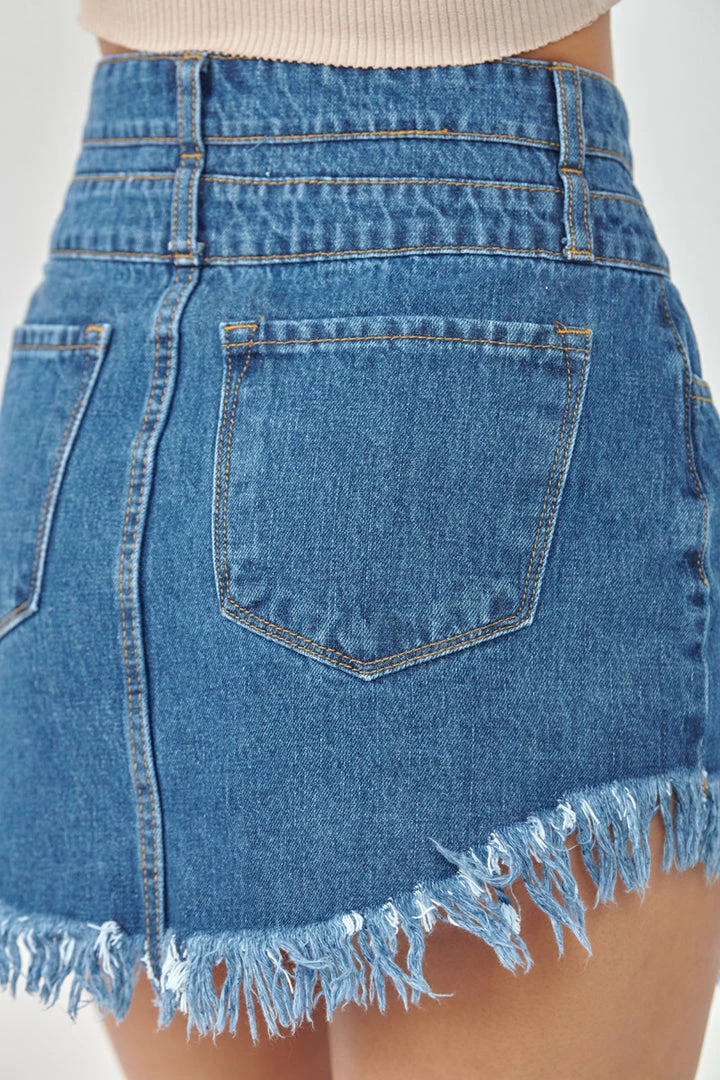 Spice up your look with this medium-washed non-stretch mini skirt featuring two-button front closure and a curved fringed hem.
