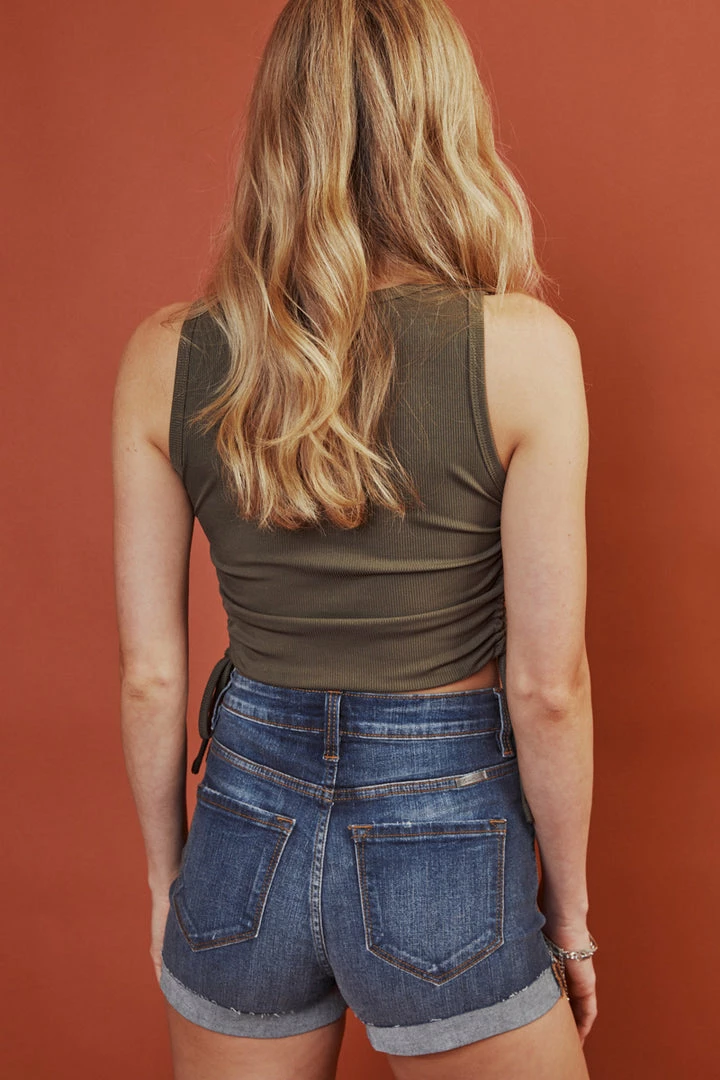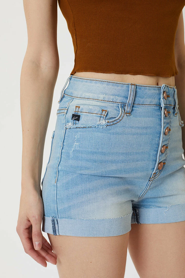 Dark washed waist-accentuating fitted shorts featuring mild fading, whiskering, worn-out details throughout, button-fly front closure, and folded hem.