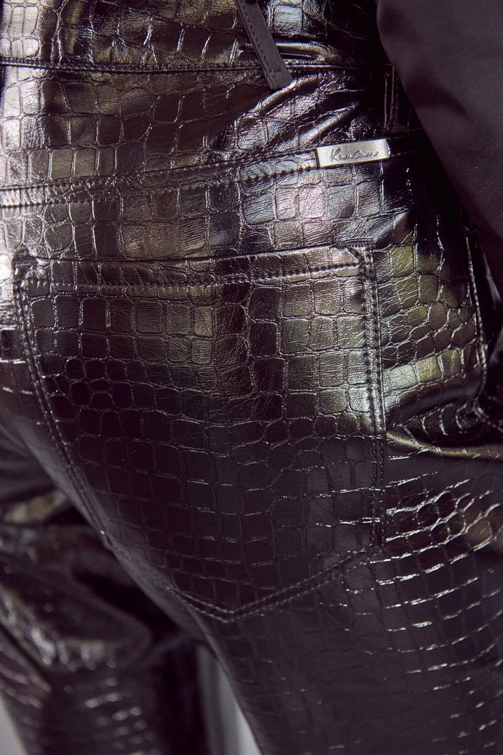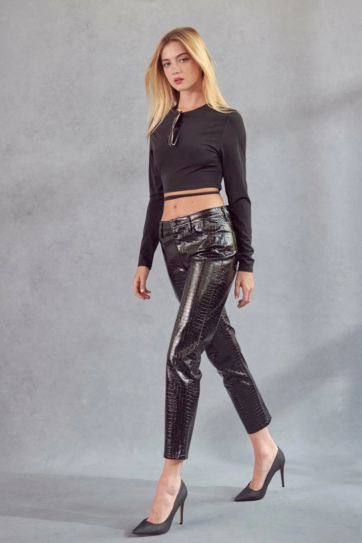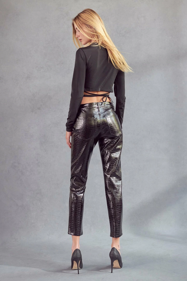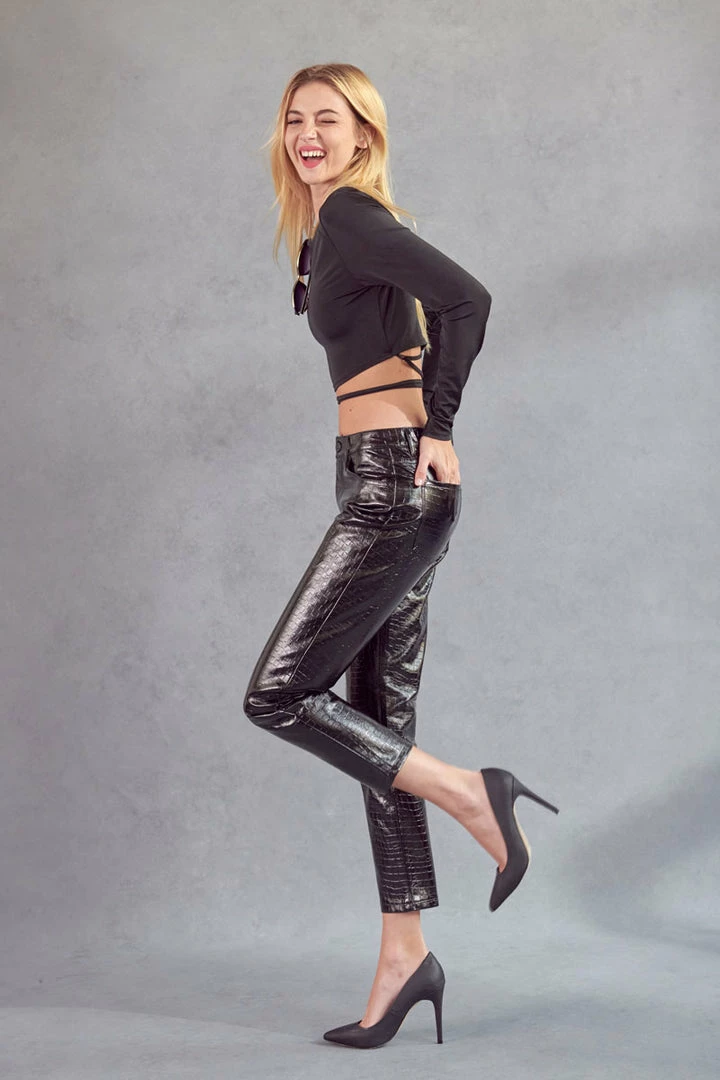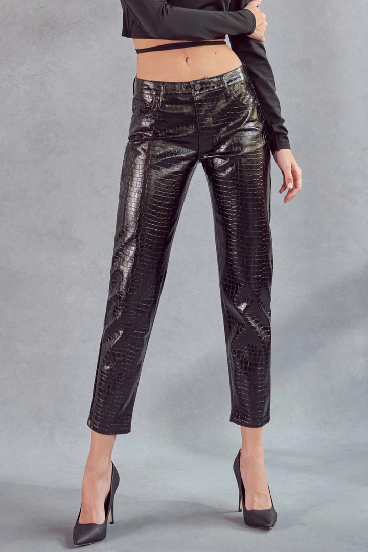 Our Josephine Faux Leather Pants come in a mom fit cut detailed with a textured design and glossy faux leather coating that gives this style a sleek and sexy finish. Sits above the natural waistline as it relaxes down the leg giving you a comfortable fit that will compliment any outfit combo. Features a four-pocket design, single-button front, and zip-fly closure.