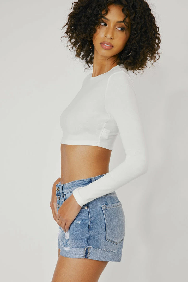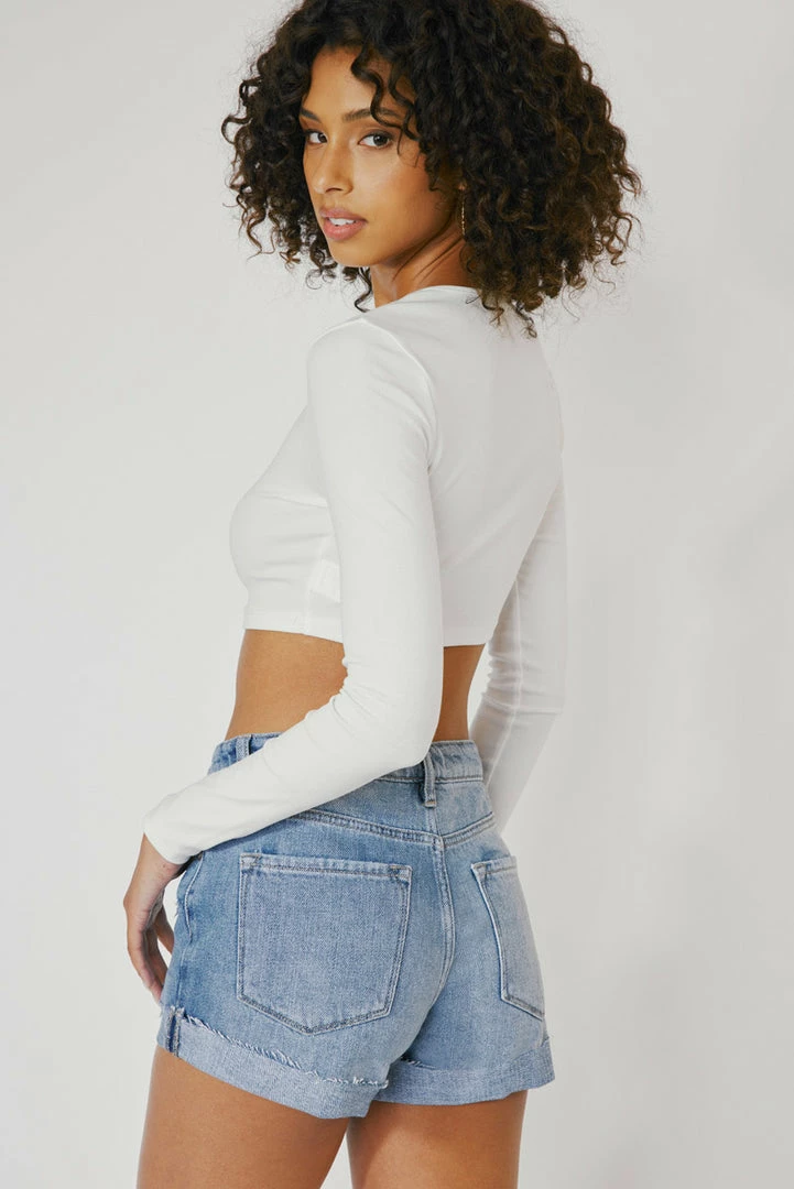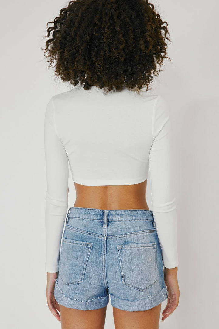 Our Jovana ultra high rise short gives an edgy vibe that’s perfect for everyday wear. Pairs best with casual tees or crop tops for a comfortably chic look. Featuring whiskering, fading, distressed details, folded hem, 5-pocket design, and a five-button front closure.