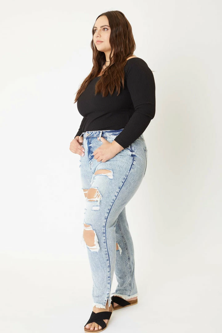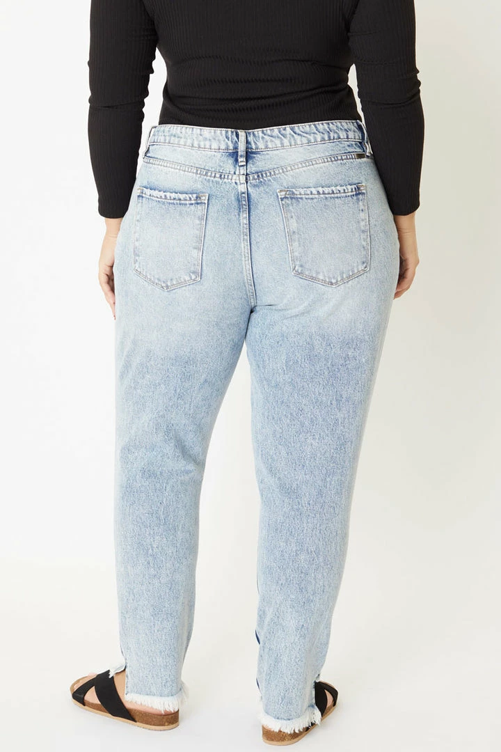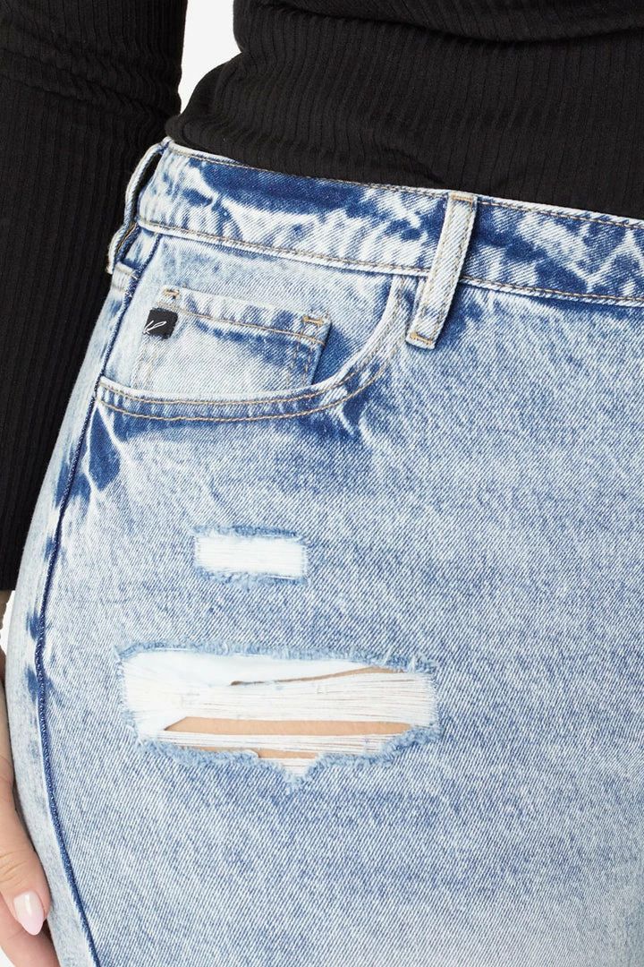 Our Juliet Ultra High Rise Mom Jean comes in a medium blue wash with heavy distress on the front with a frayed hem. Sits high above the natural waistline. Fitted from the waist as it relaxes down the leg for a true mom jean style. Features a 5-pocket design, single-button front, and zip-fly closure.