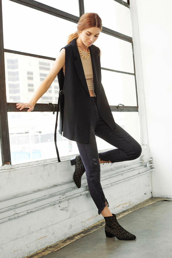 Cool, dark-grey denim with subtle distress and a split raw hem. Sits above the natural waistline as it tapers down the leg for a high-rise ankle skinny fit. Made with super-stretch denim that will move with your body and won’t bag out after wear. Features a classic five-pocket design, single-button front, and zip-fly closure. Finished with black-colored hardware.