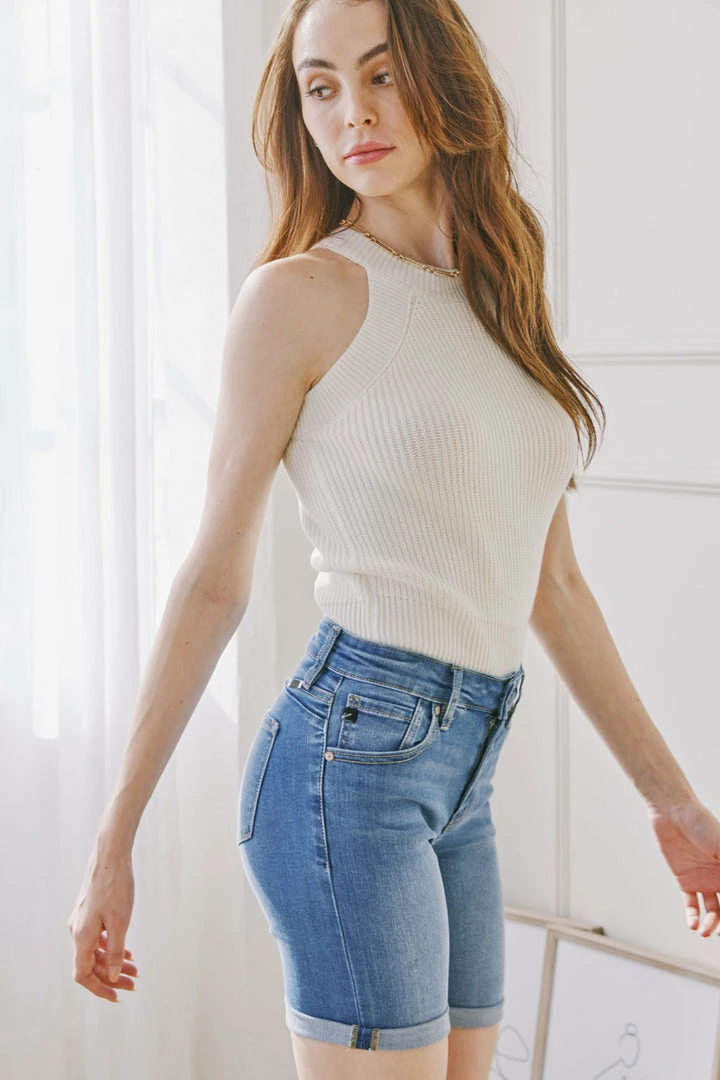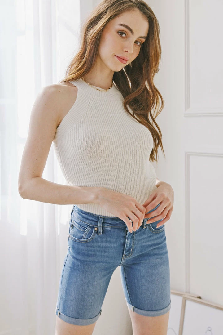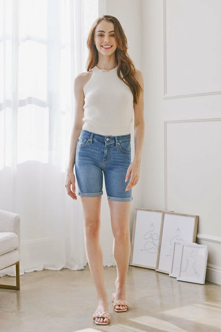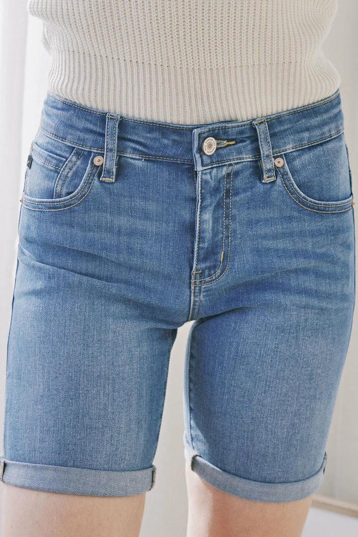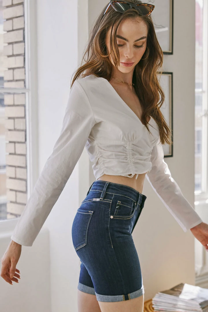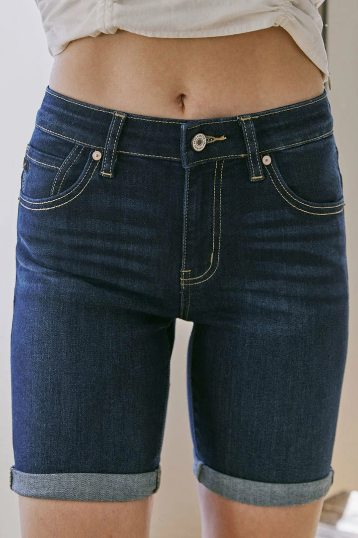 This dark and medium wash Bermuda short features a folded hem with minor fading and whiskering. Its style accentuates every curve giving you a sleek yet fitted silhouette that complements any vibe. Sitting right at the waist with mid-rise and traditional five-pockets, it’s a refreshing take on a classic short design.