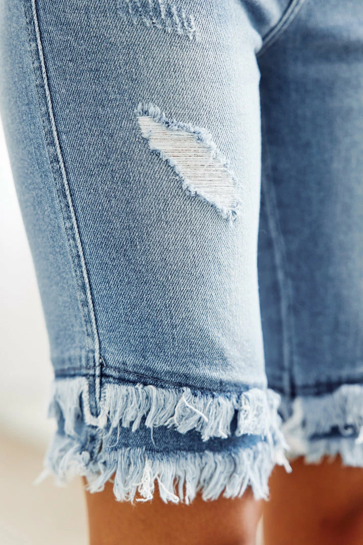 Our Karyn High Rise Bermuda Shorts feature distress details and a raw released hem for a unique and chic look. Sits above the natural waistline as it tapers down the thigh for a figure-flattering look that’s perfect for the warm weather season. Made with stretchably soft denim that’s both flexible and breathable. Features a classic five-pocket design, single-button design, and zip-fly closure.