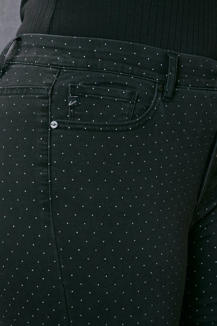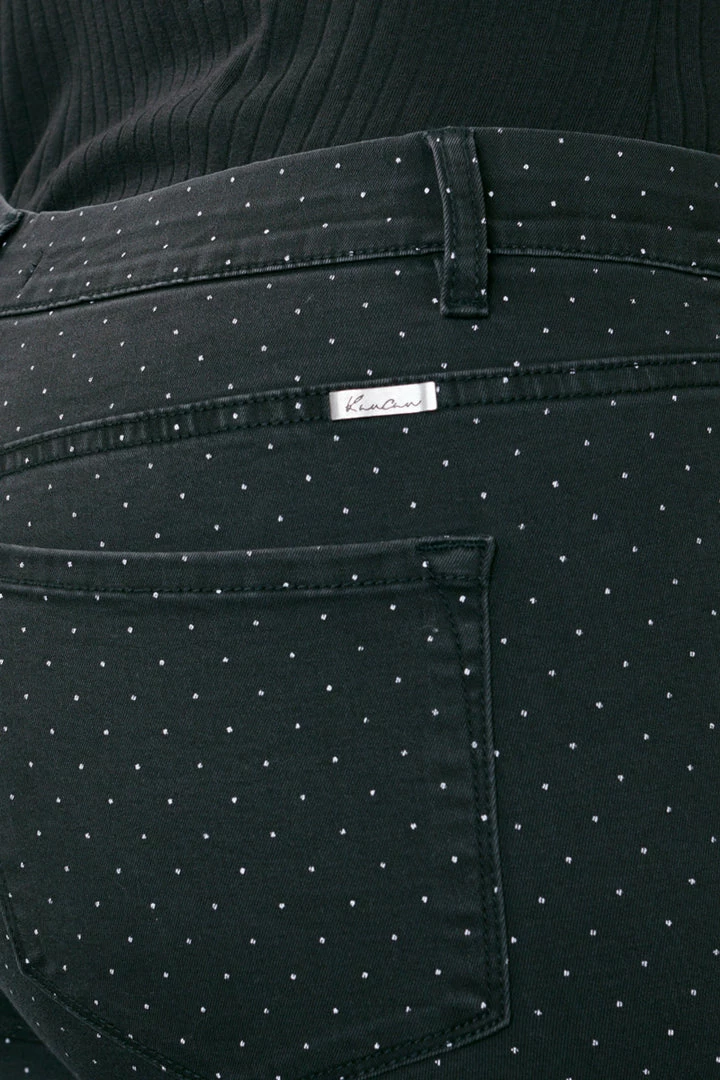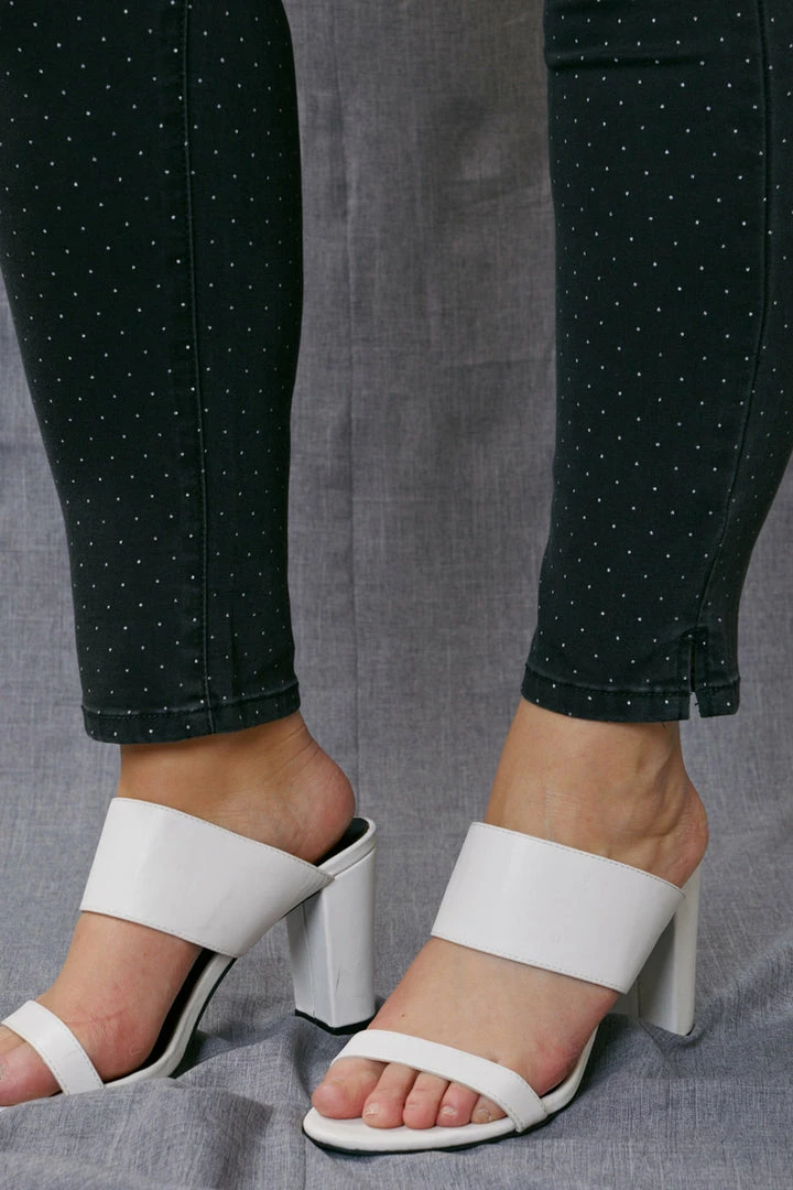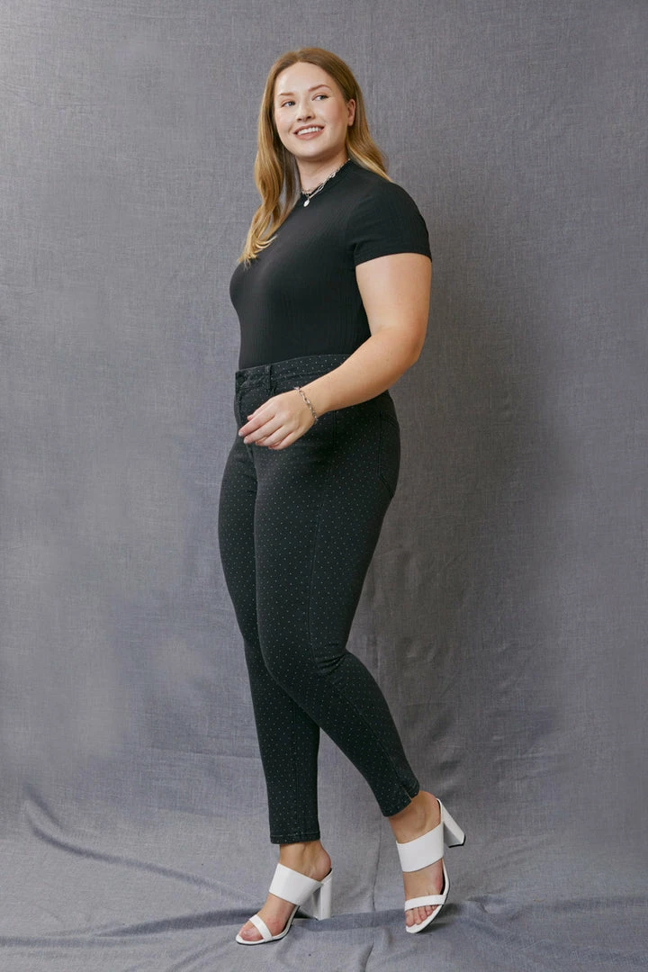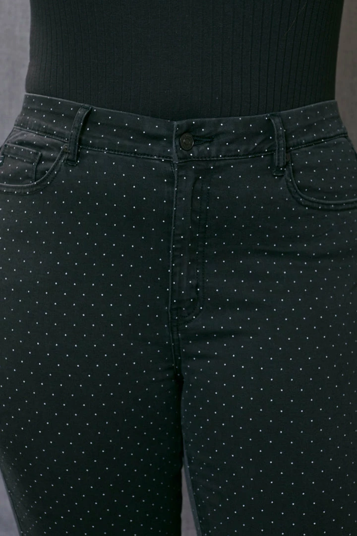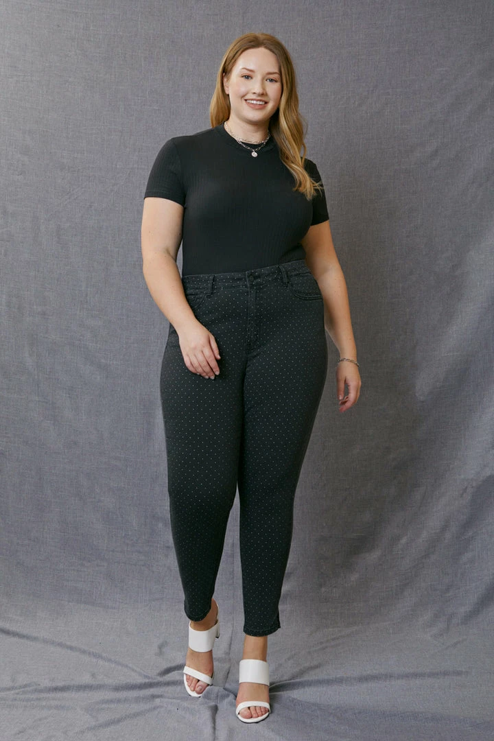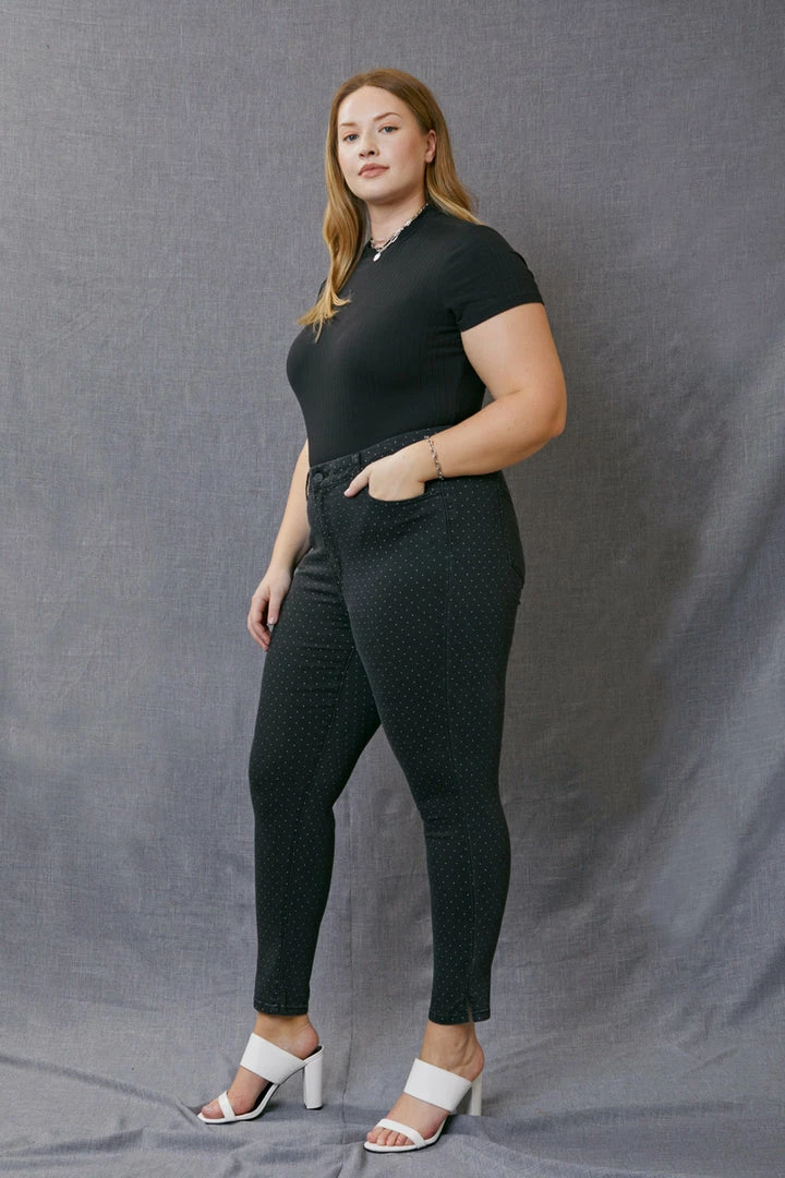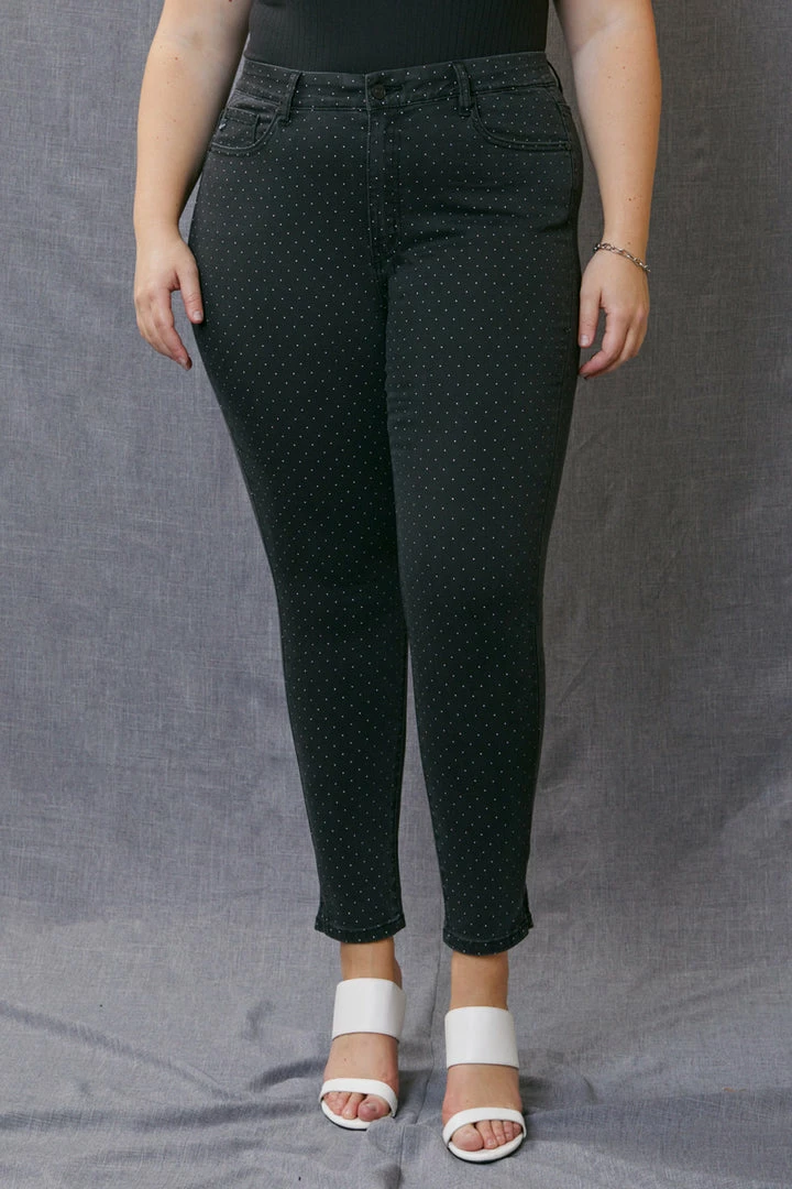 This high-rise ankle skinny jean features a fun polka dot design, side slits at them, and a gently dark grey faded wash. Styled to accentuate every curve of your body, we know you’ll stand out no matter what you pair these jeans with.Â