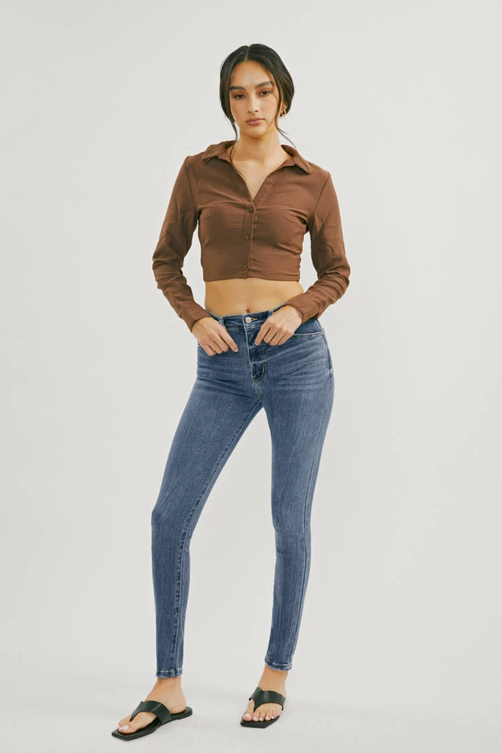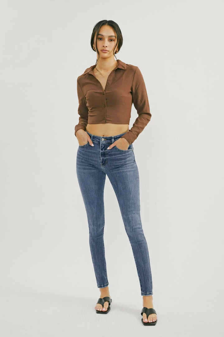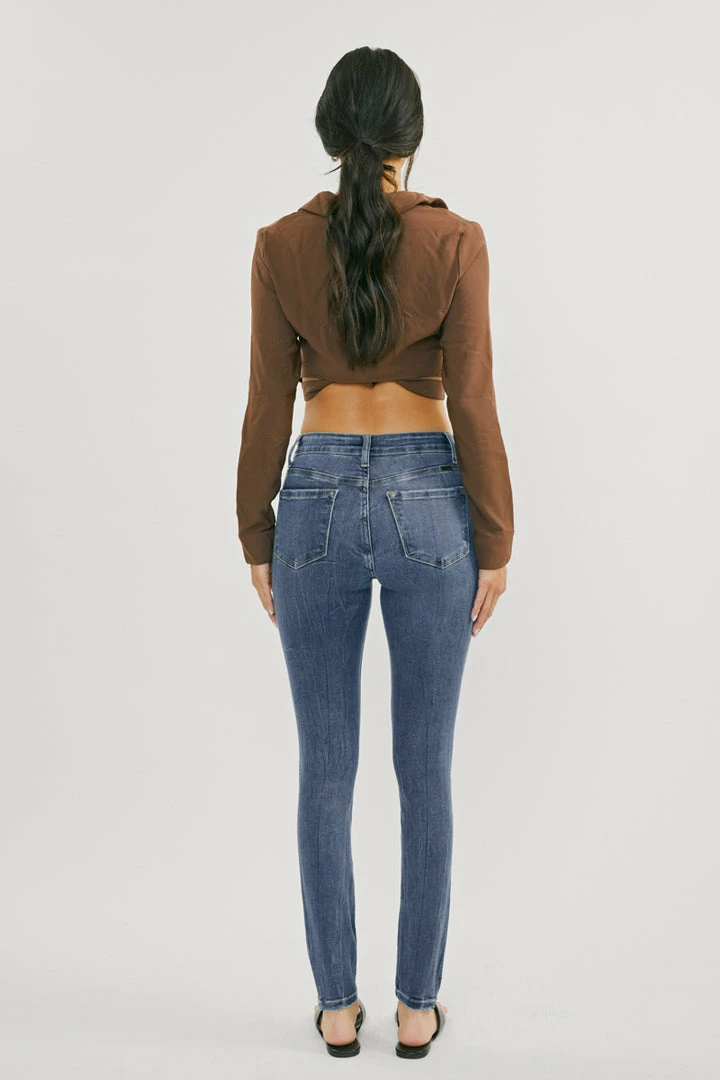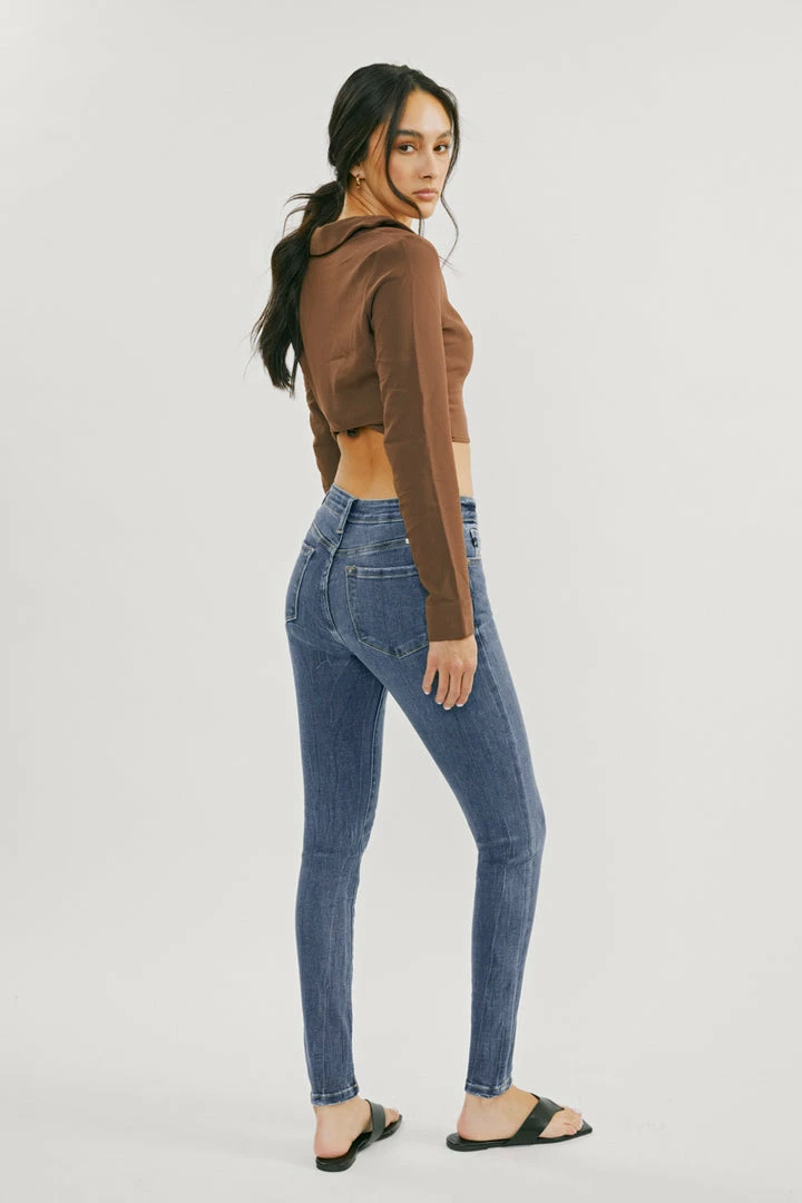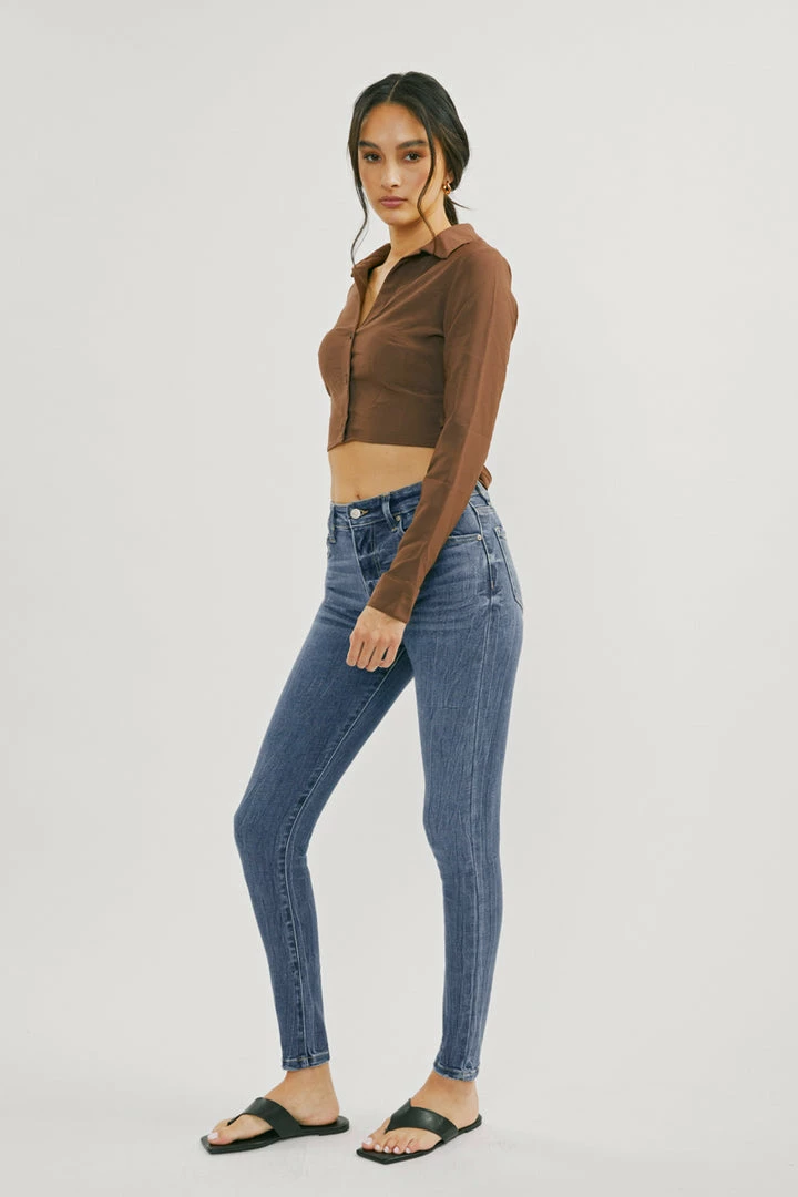 The Kayleigh high-rise jeans come in a super-skinny silhouette that hugs every curve from your waist, down to your ankles. These jeans are a staple piece in any closet and a great go-to classic skinny jean that has just the right amount of edge with its subtle rain wash detail. Sits just above the waist for a sculpted look, this denim will never go out of style. Comes in stretchable denim with a classic 5-pocket design, single-button front, and zip-fly closure.