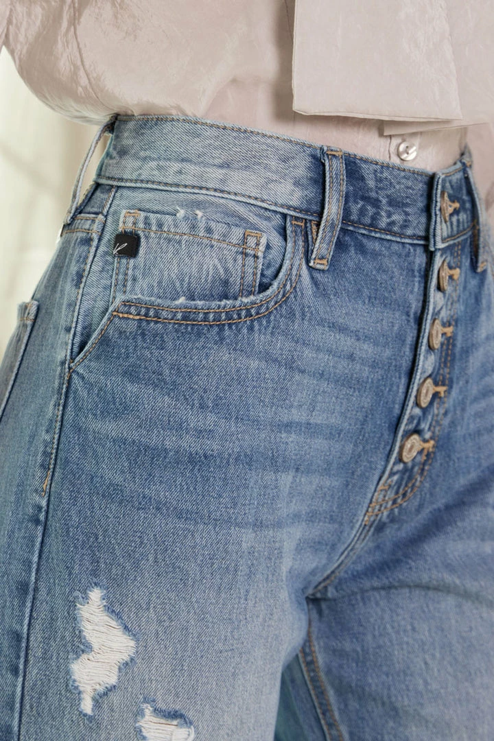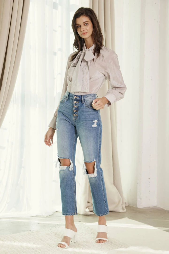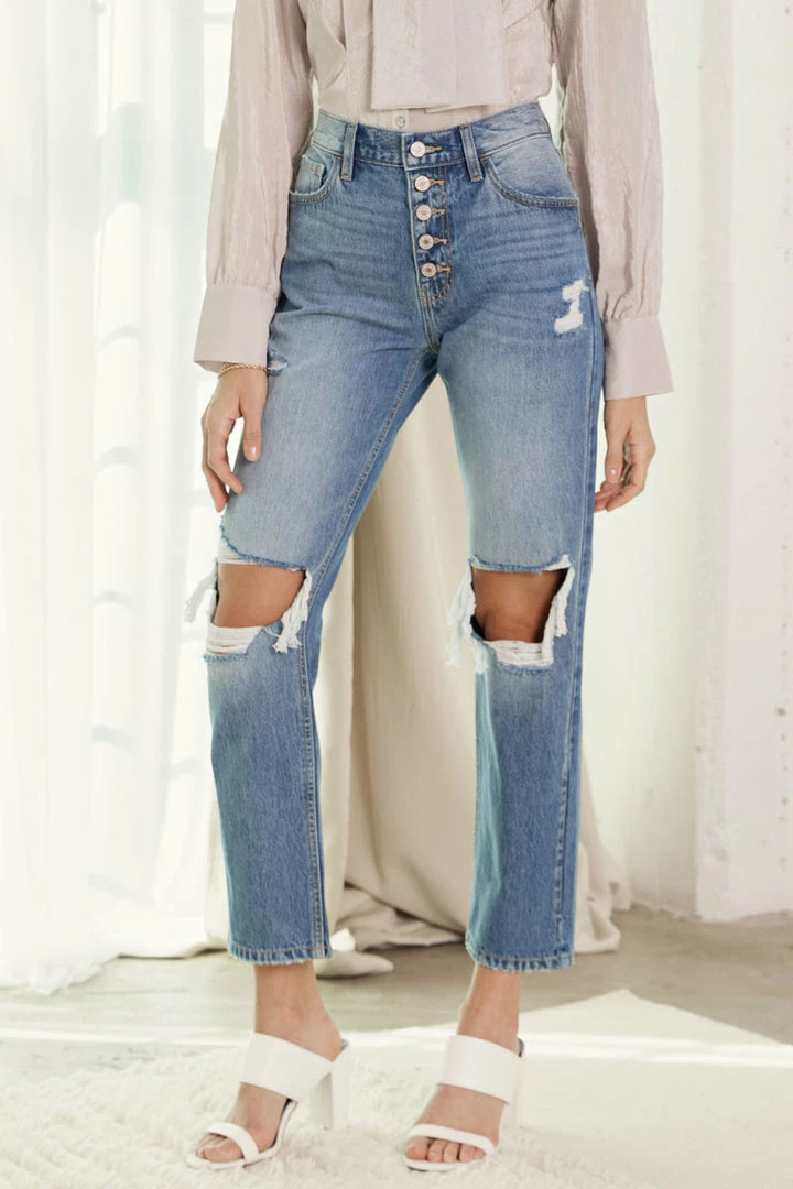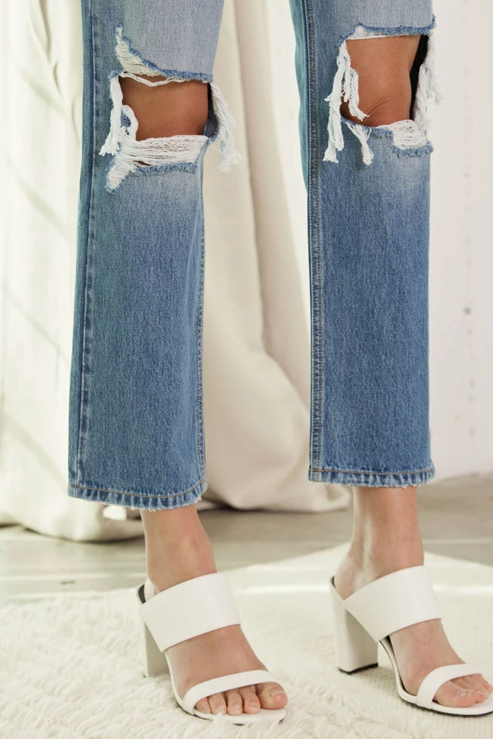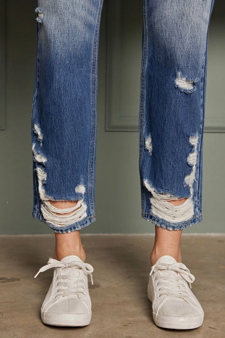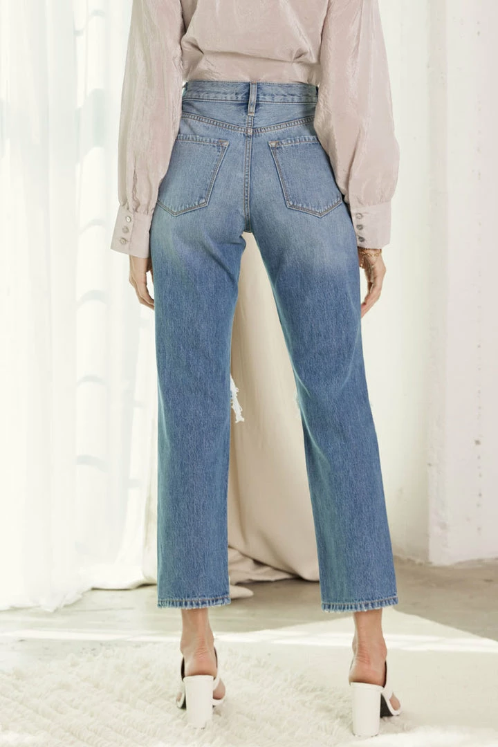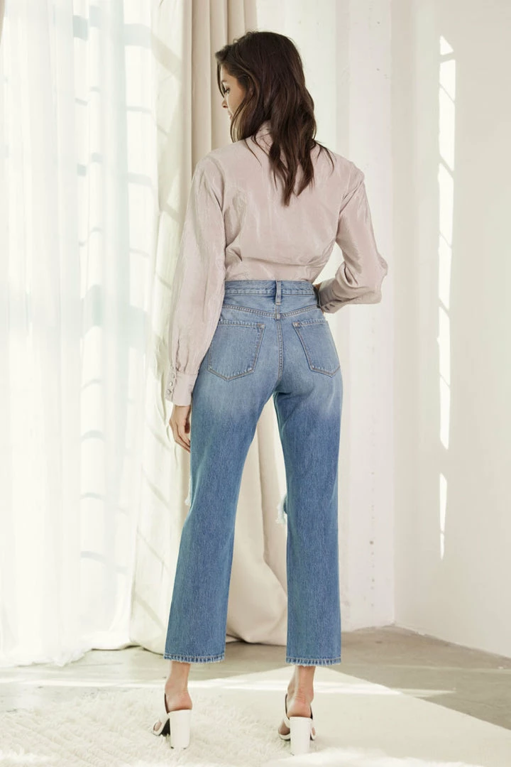 The Keke high rise straight fit is classy and trendy with its uniquely designed distressed hem. This style comes with fading and light distress. You can’t go wrong with these blue jeans, fit for the everyday woman. This straight-leg jean sits just above the waist with an overall relaxed straight slim fit.Â