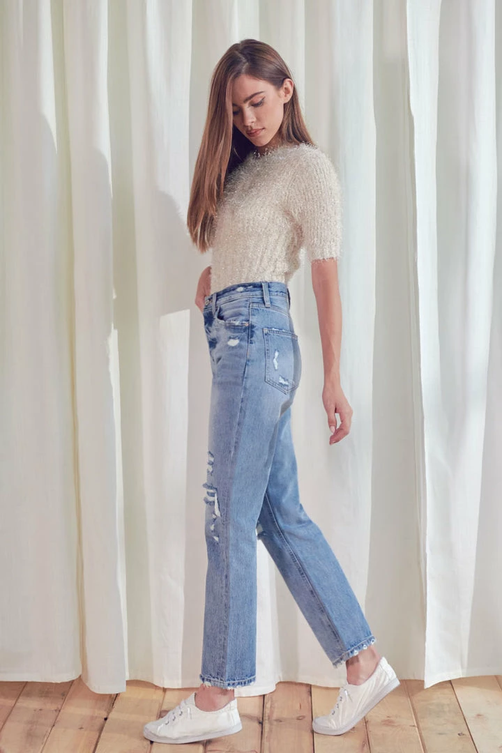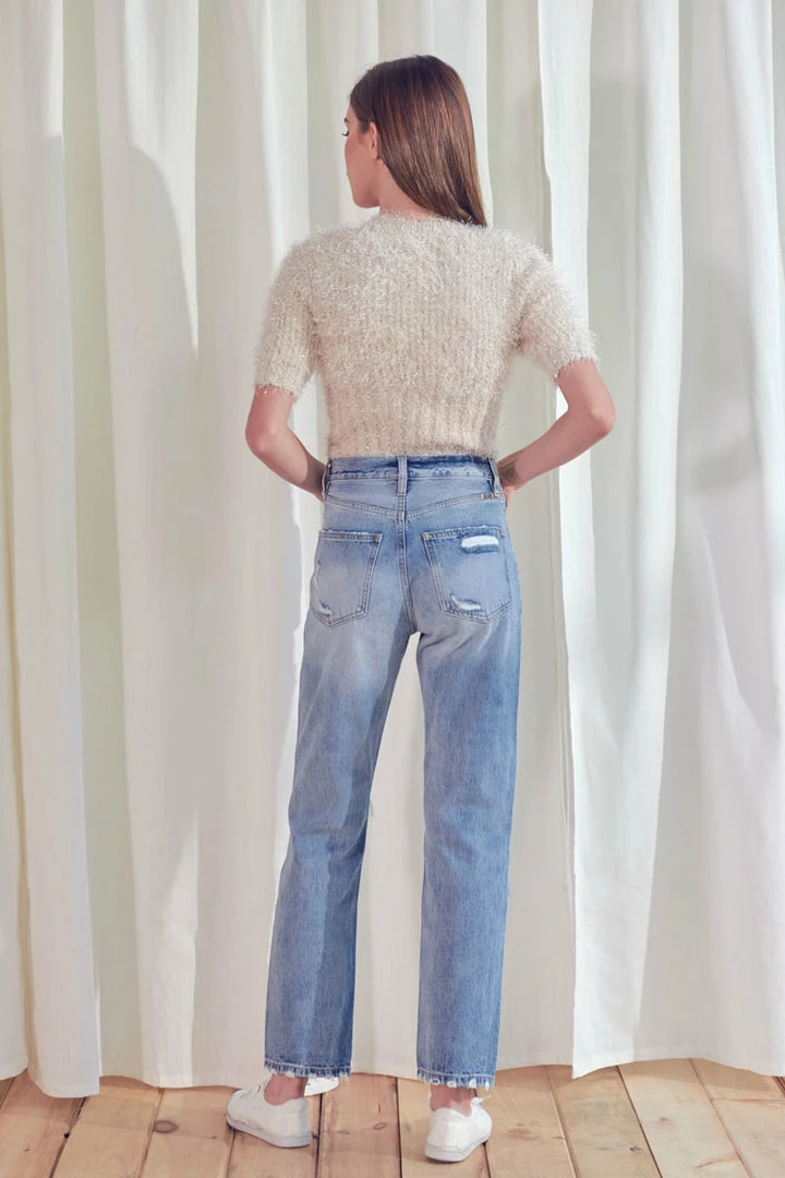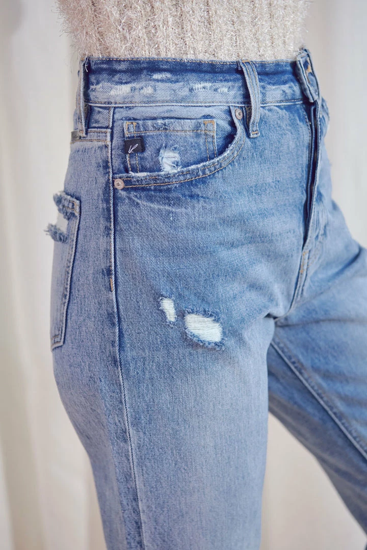 Light-washed denim with ultra-faded details, distress, and patch detailing for a raw, worn-in look. Sits high above the natural waistline as it relaxes down the thigh and leg where it begins to distress at the ankle. Our Kiara Ultra High Rise Jeans are a classic boyfriend fit that’s made with rigid denim for a comfortable fit that will give you a true blue jean feel. Features a classic five-pocket design finished with gold-colored hardware.