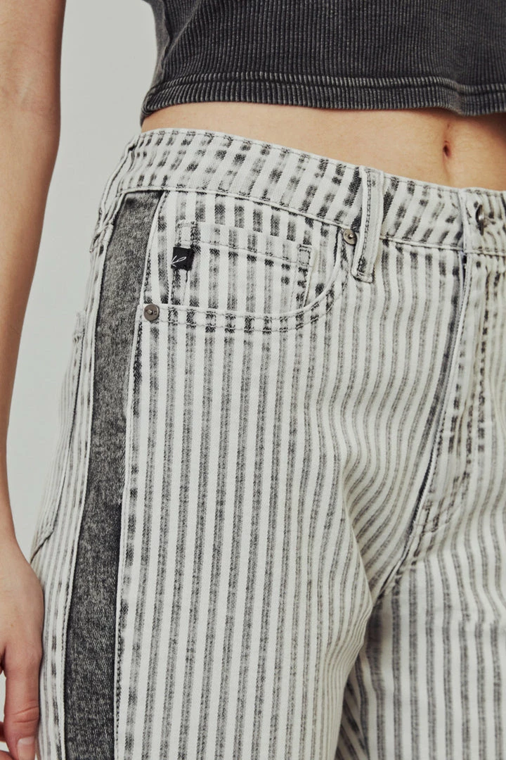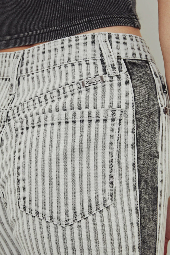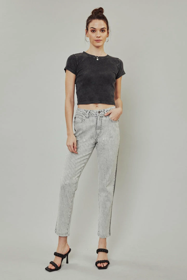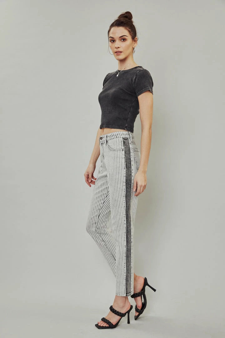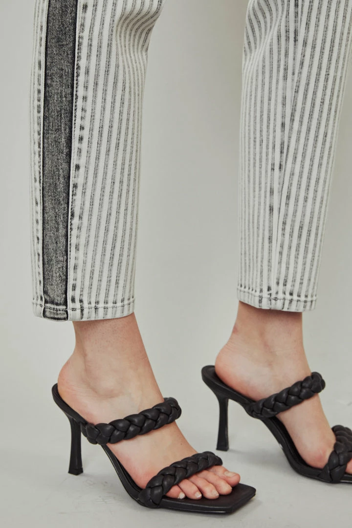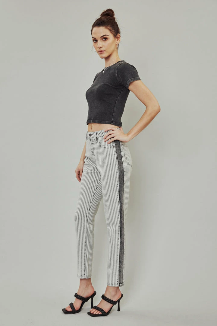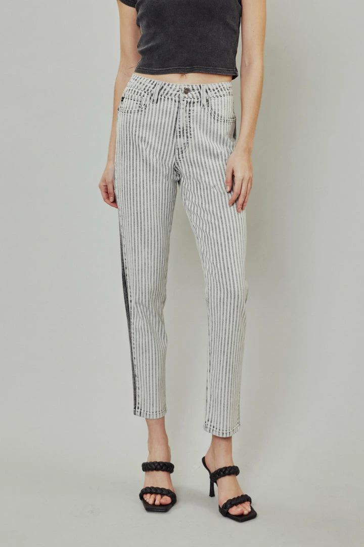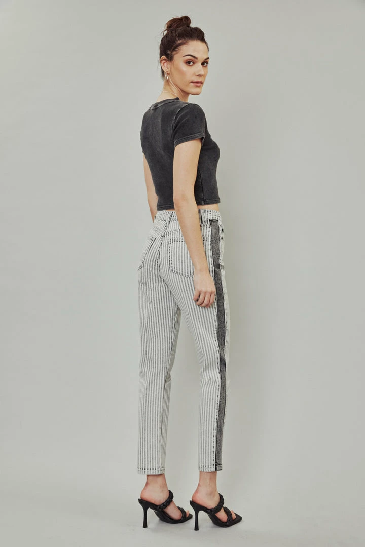 These Kristin High Rise Slim Straight Jeans are perfect for any fashionista who likes a little edge to their wardrobe. These jeans have a pencil stripe design with a light grey side contrast panel. Made with our stretch denim to leave you comfortable in everyday wear. Features a regular 5 pocket style, classic single button front closure, and zip fly.