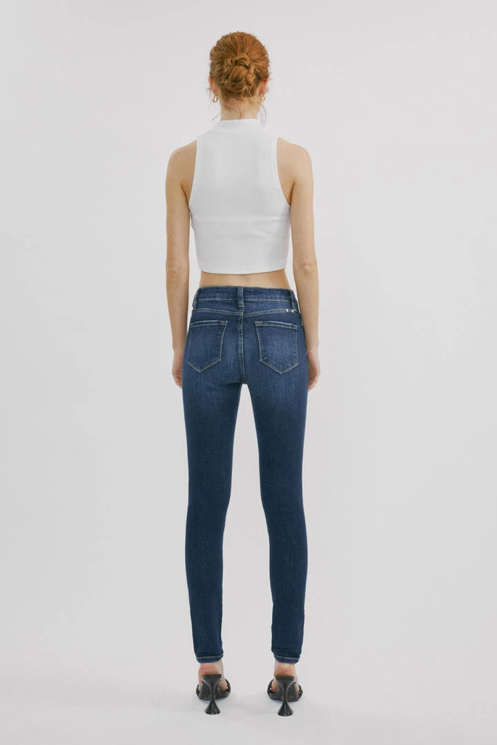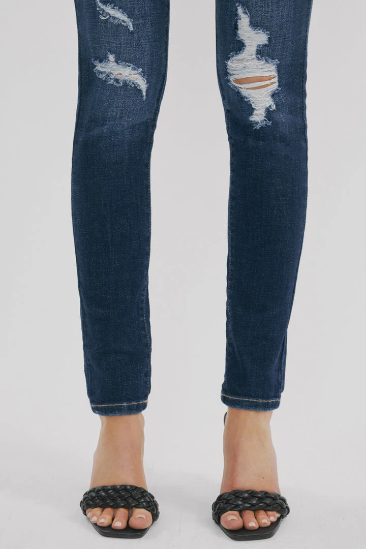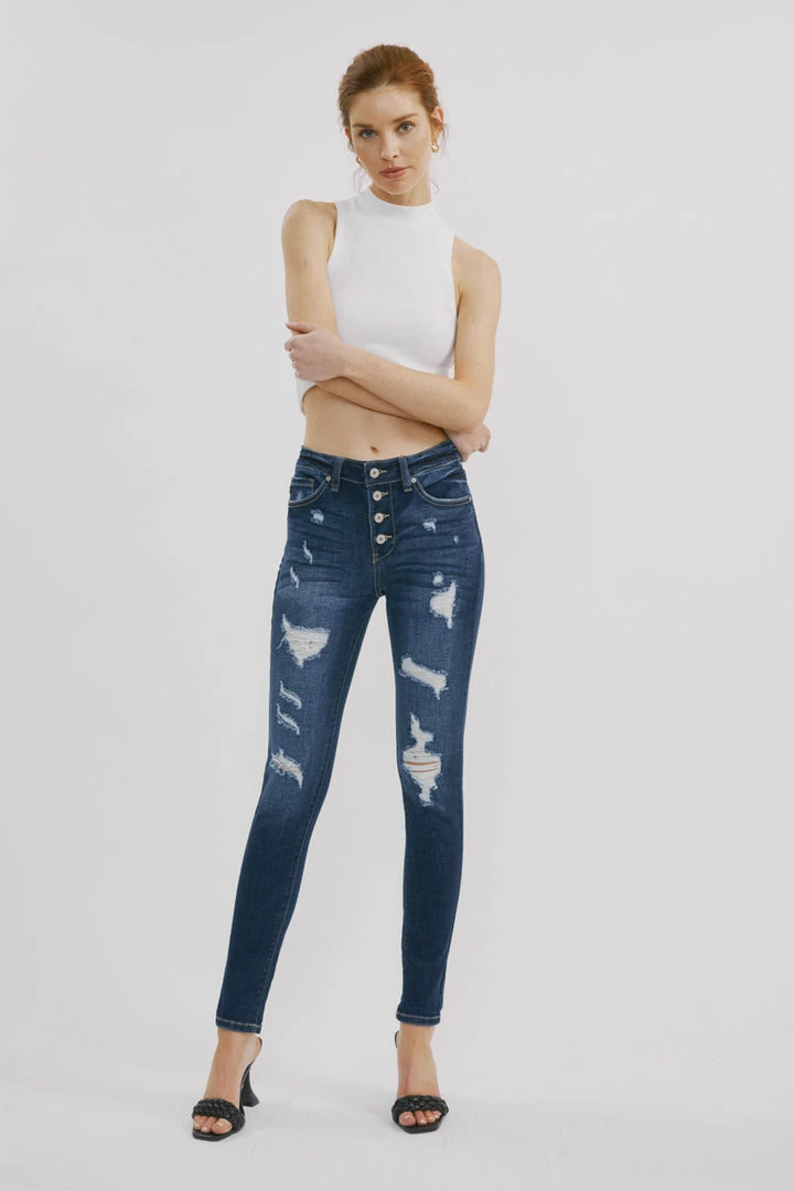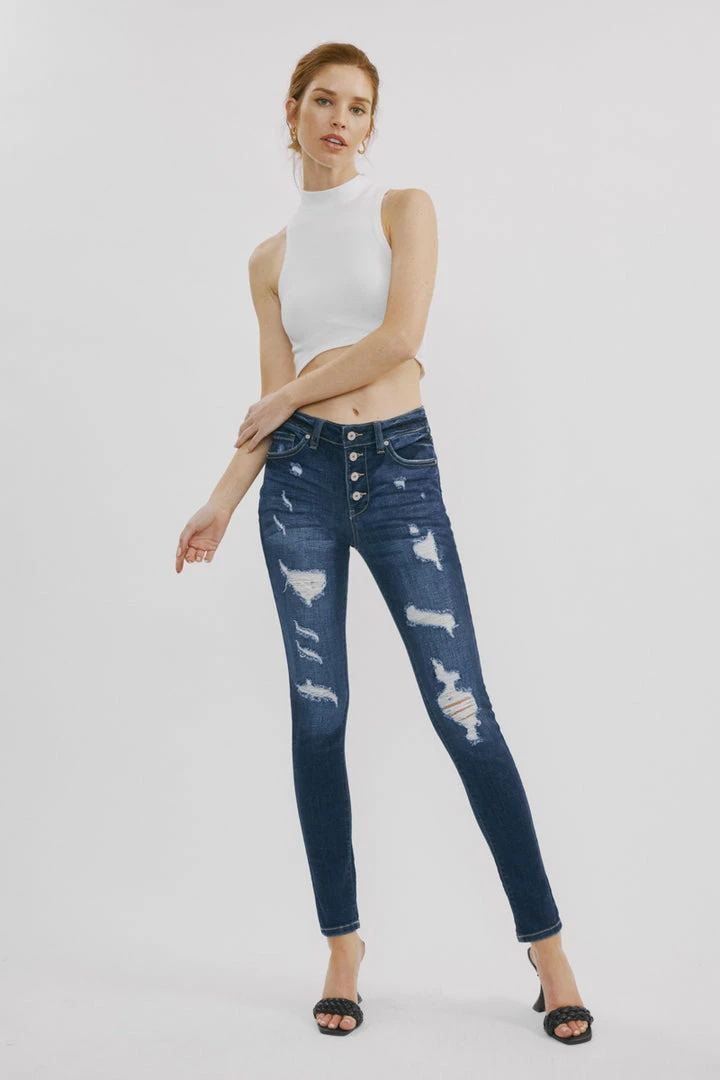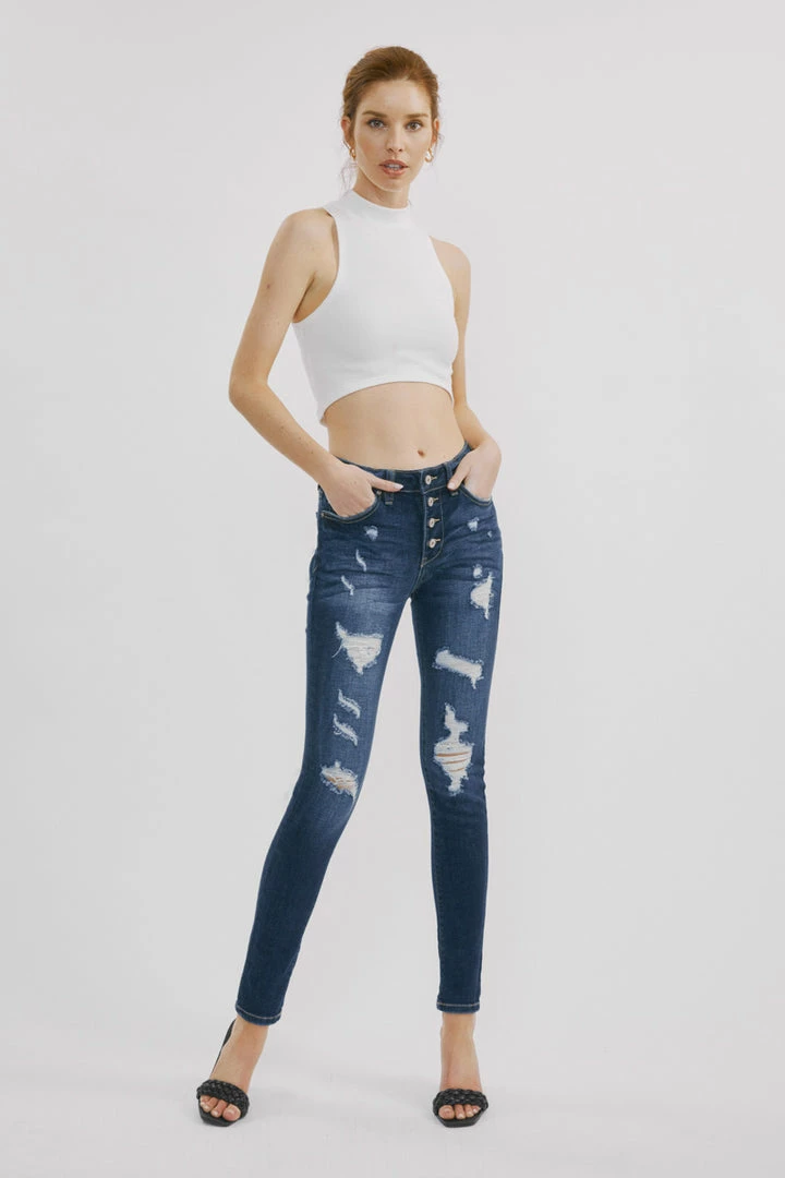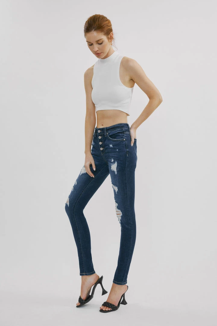 Dark washed skinny that smoothly hug and shape all body type with the perfect amount of comfort and stretch, featuring light fading, whiskering, subtle tattered distressing details and button-fly front.