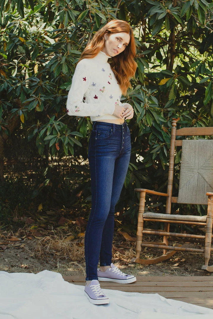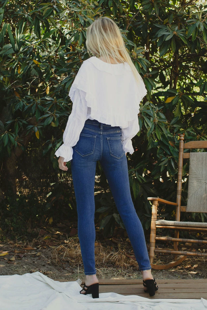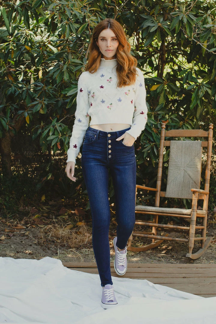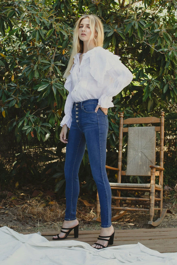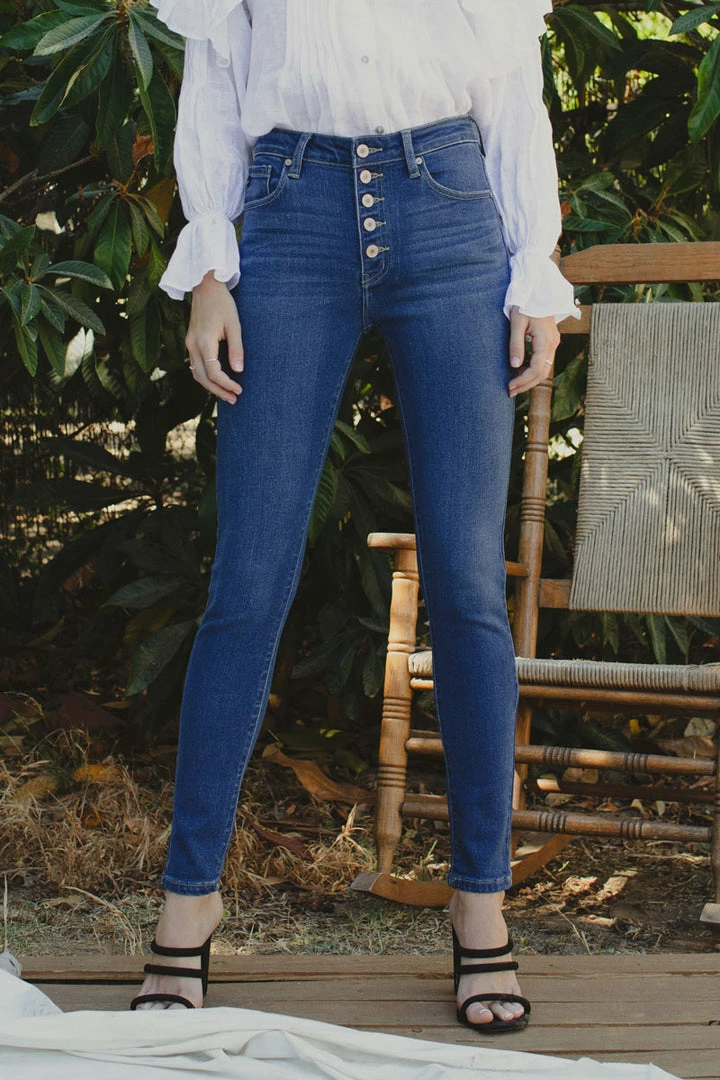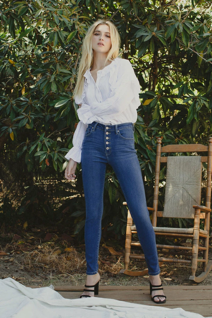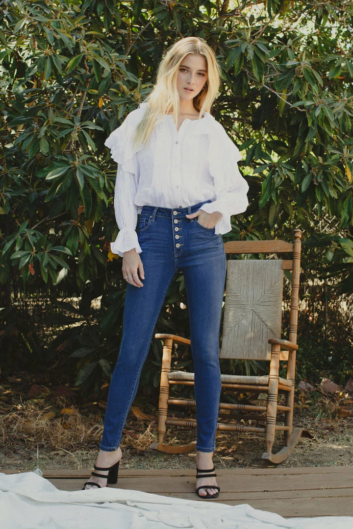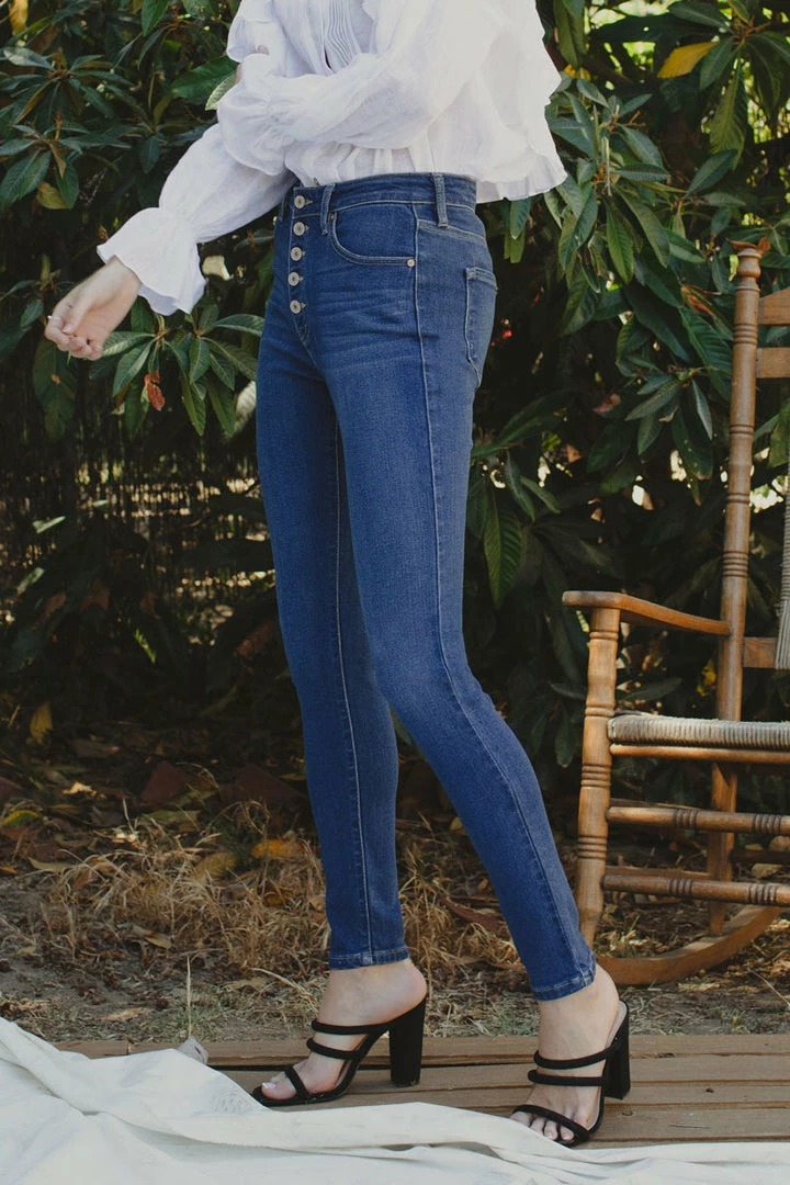 How cute is this button-down super skinny? Rock it with any of your favorite tops! Featuring whiskering, fading, a 5-pocket design, and a 5 piece button closure.