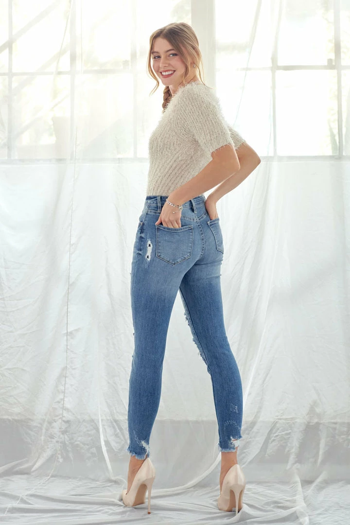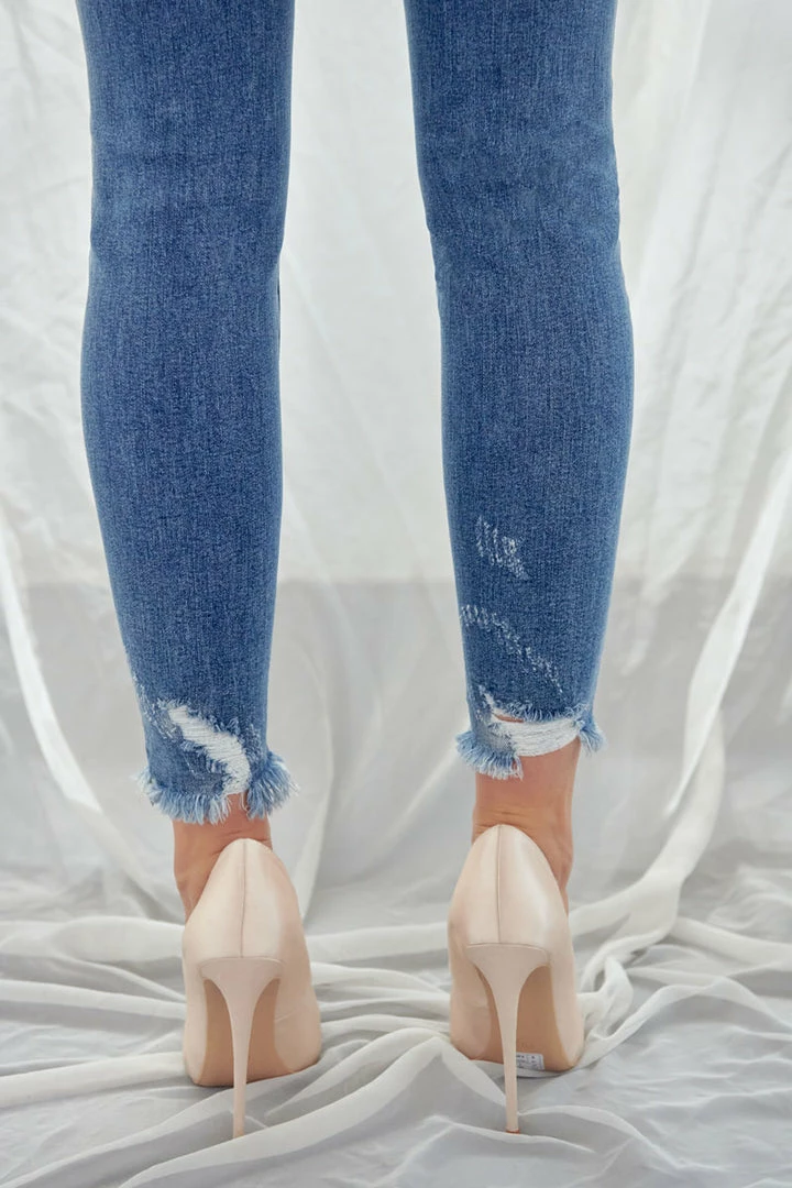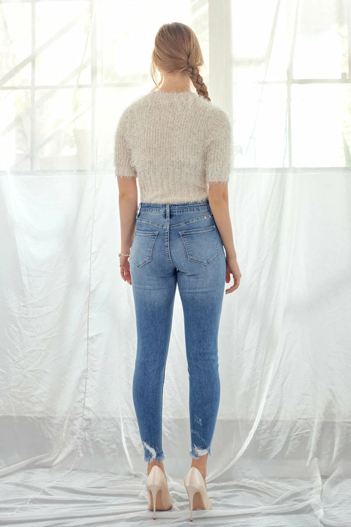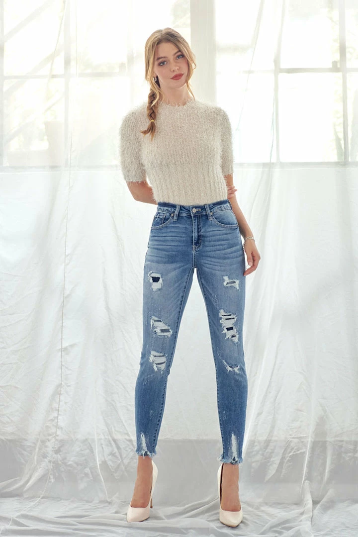 Dark-washed denim with fading, distress, patch detail, and a raw frayed hem that gives this jean an extra lived-in look. Sits above the natural waistline as it tapers down the leg for an ankle skinny fit. Made with stretch denim that’s comfortable and allows you to move with ease. Features a classic five-pocket design, single-button front, and zip fly closure. Finished with gold-colored hardware.