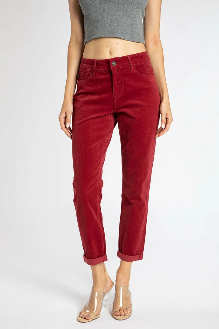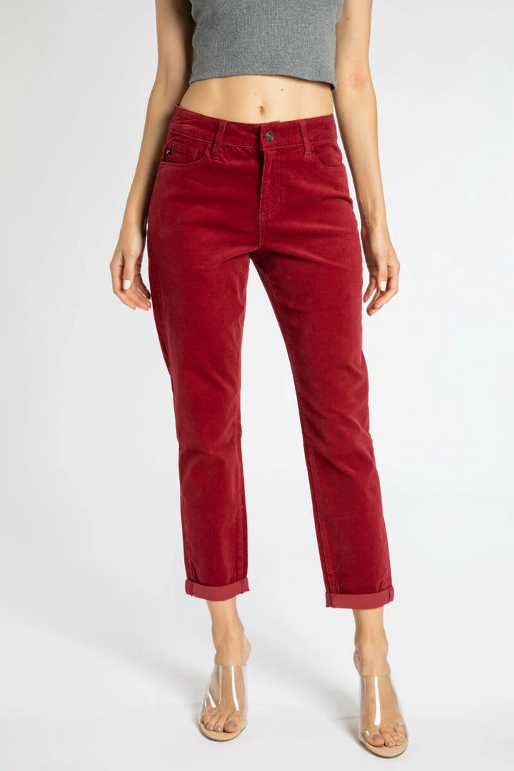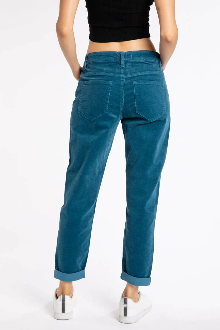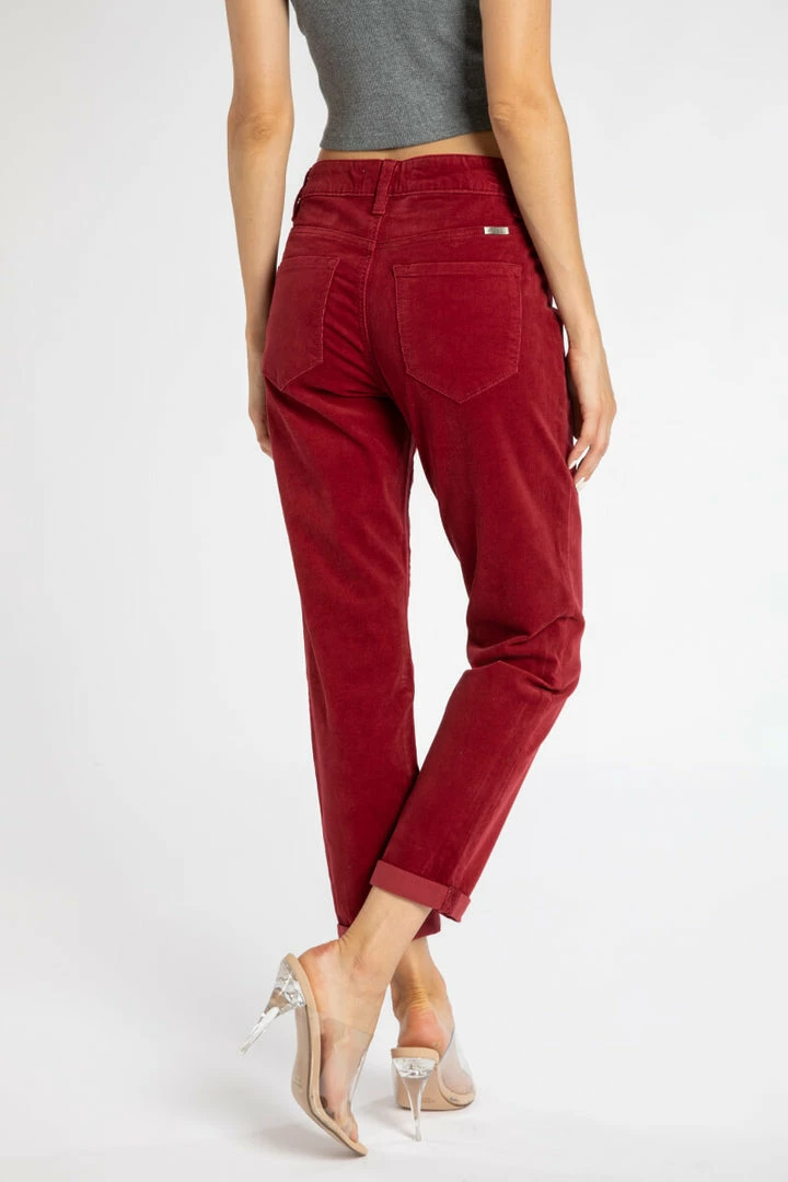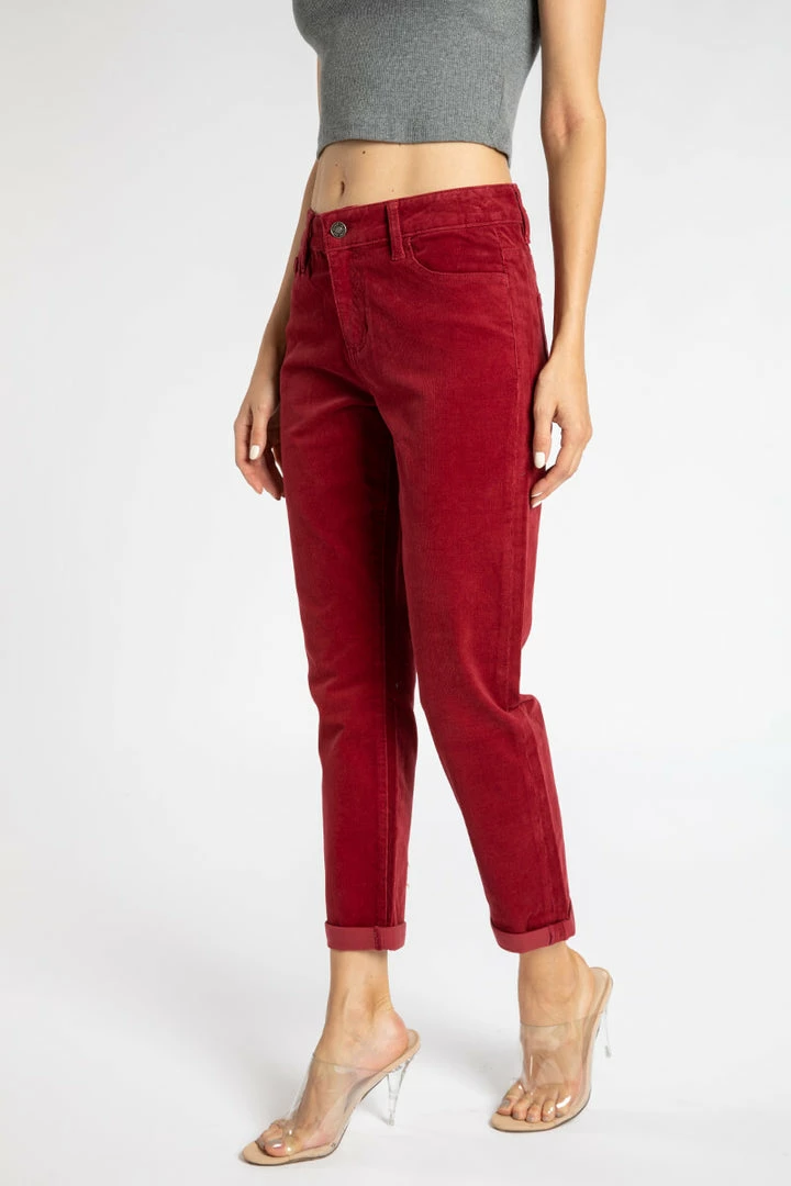 Our Leah High Rise Corduroy Pants come in a classic mom fit in both an aqua blue and red color. Sits above the natural waistline as they relax down the leg for a comfortable fit that’s chic and trendy. Made with velvety soft corduroy fabric that’s fitted for a tailored look that’ll never go out of style. Features a classic five-pocket design, single-button front, and a zip-fly closure.