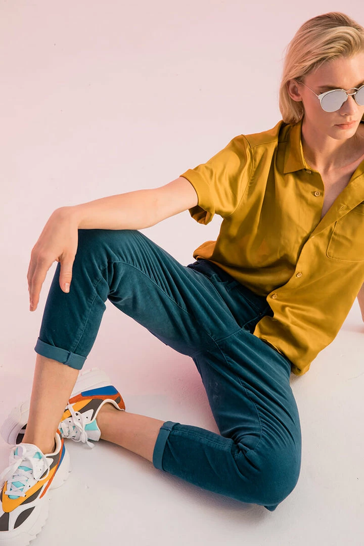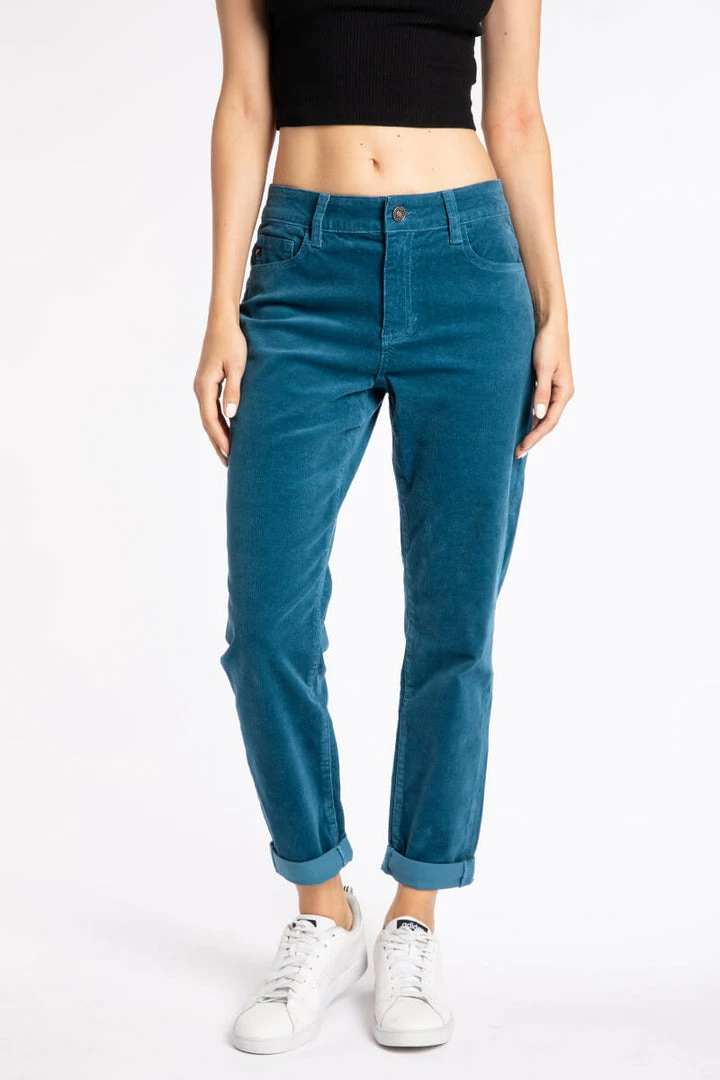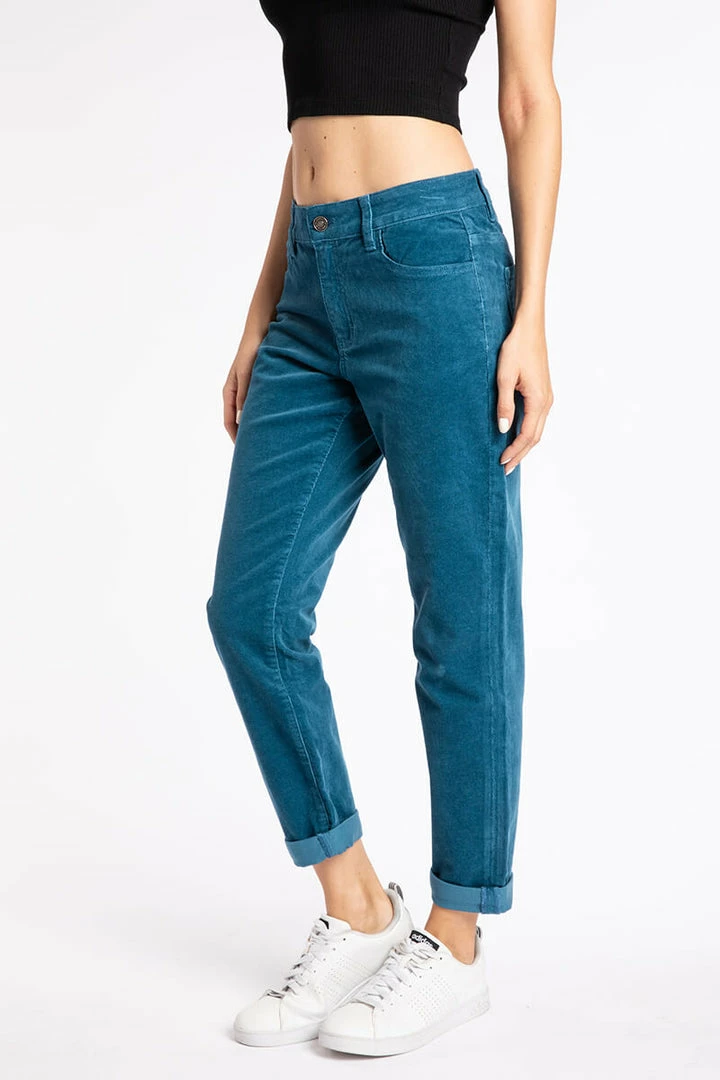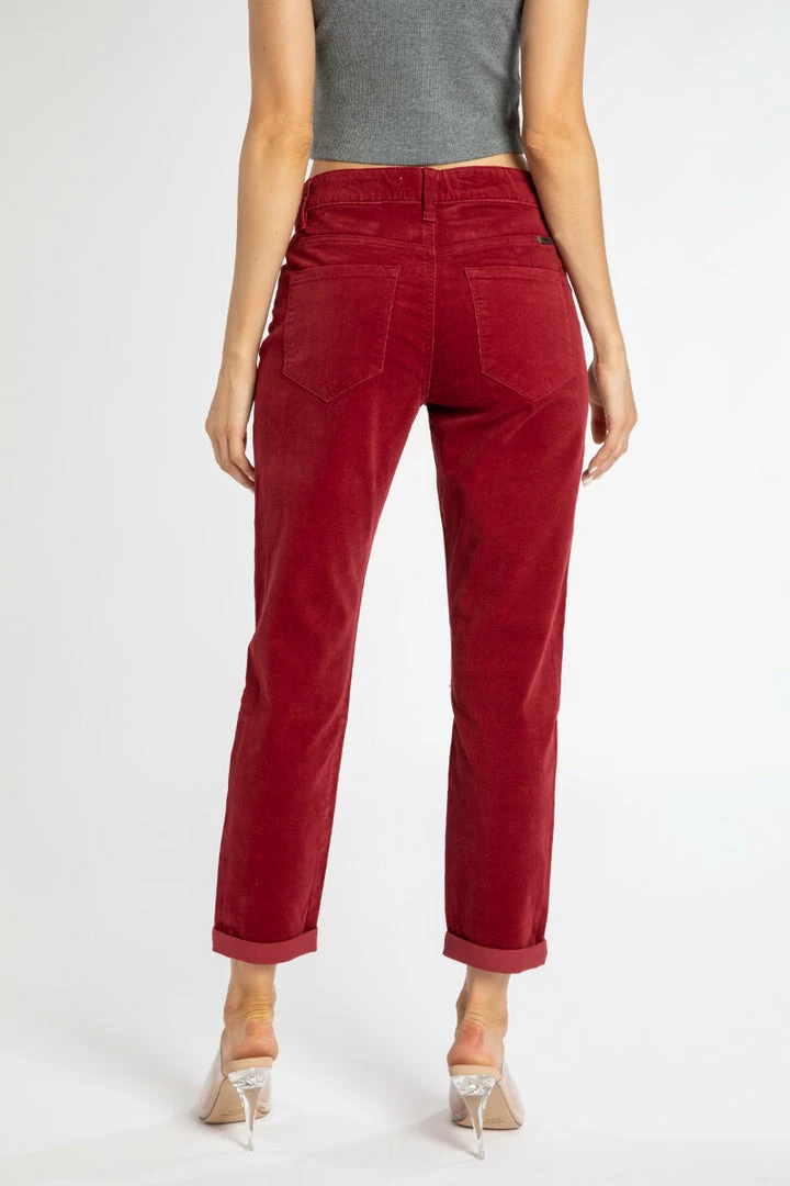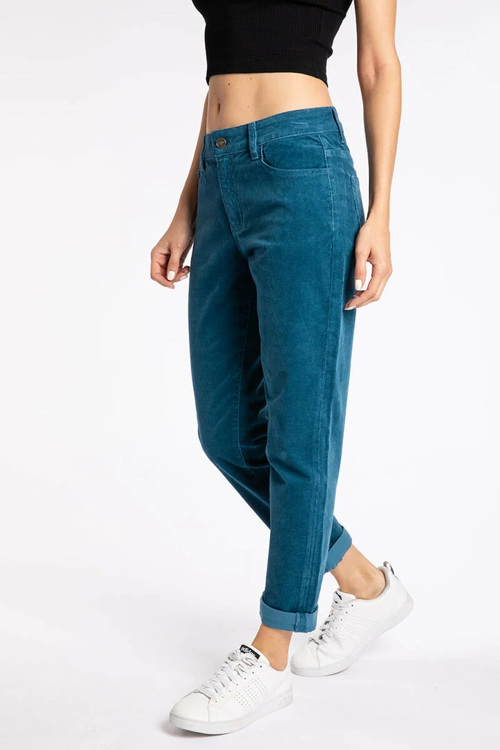 Our Leah High Rise Corduroy Pants come in a classic mom fit in both an aqua blue and red color. Sits above the natural waistline as they relax down the leg for a comfortable fit that’s chic and trendy. Made with velvety soft corduroy fabric that’s fitted for a tailored look that’ll never go out of style. Features a classic five-pocket design, single-button front, and a zip-fly closure.