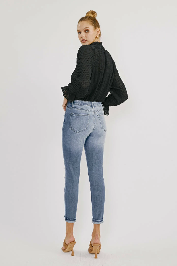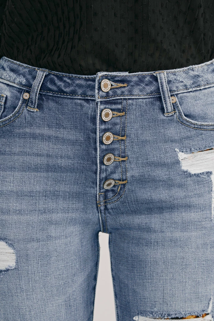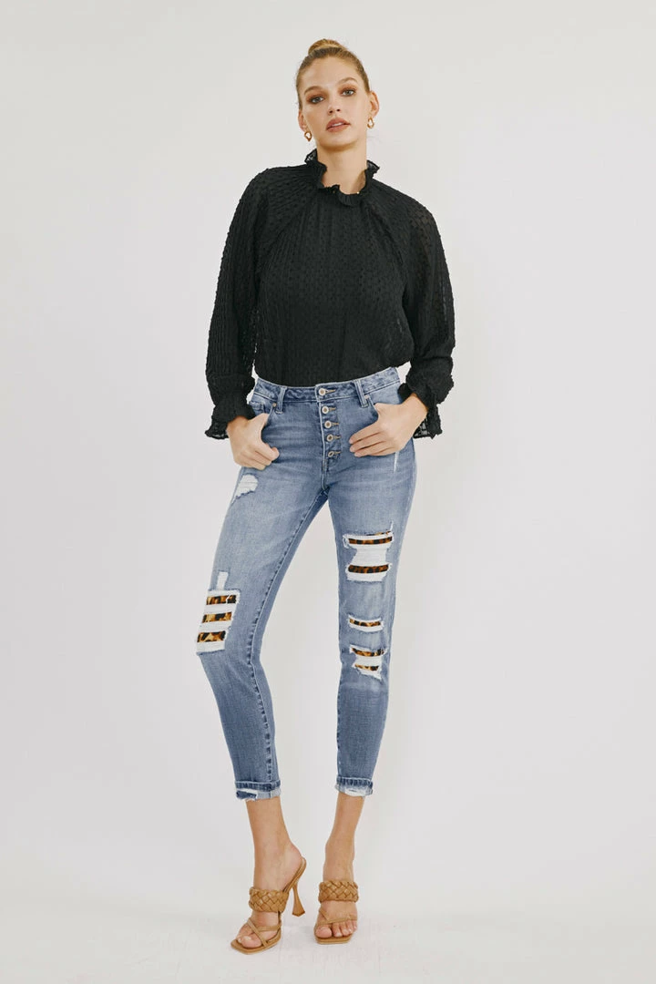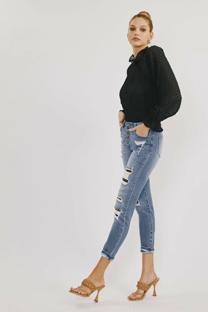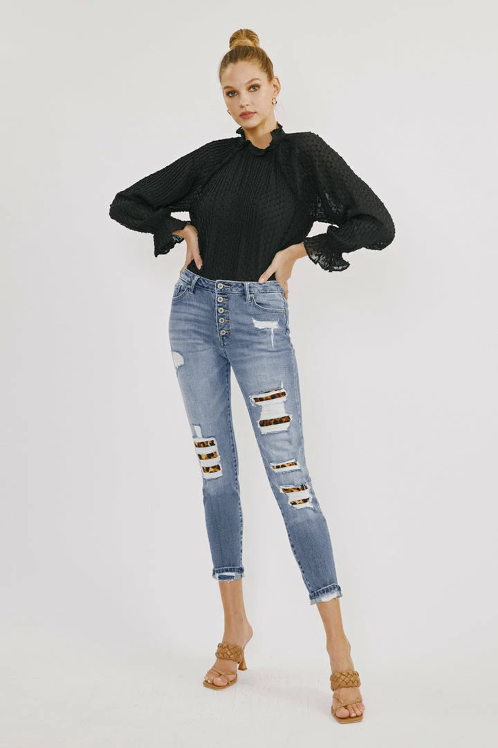 Peek-a-boo! This pair of high-rise ankle skinny has leopard patches under the distressed detailing, adding a little pizazz to any outfit! Featuring distressed detailing, fading, whiskering, and a 5-pocket design with zip fly.Â