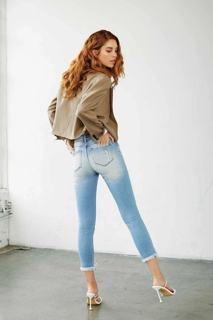 Faded light-wash denim with 3D whiskering details and light destruction with a shredded hem for a uniquely lived-in look. Our Lexi High Rise Jeans sit above the natural waistline as they taper down the leg for a fitted silhouette that contours the body. Made with stretch denim that’s breathable, comfortable, and maintains its shape after wear. Features a classic five-pocket design, single-button front, and zip-fly closure. Finished with gold-colored hardware.