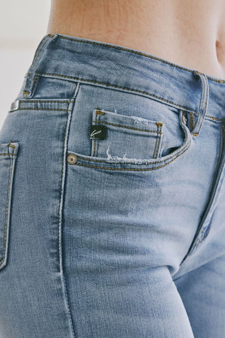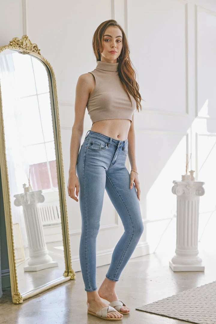 Our Lizette Mid Rise Jeans come in a super skinny cut with a gently faded wash and subtle whiskering that gives this style a hip look. Sits right at the natural waistline as it tapers down the leg giving you a figure-flattering fit that’s sexy and sleek. Made with super-stretch denim that’s buttery-soft and flexible. Features a classic five-pocket design, single-button front, and zip-fly closure.